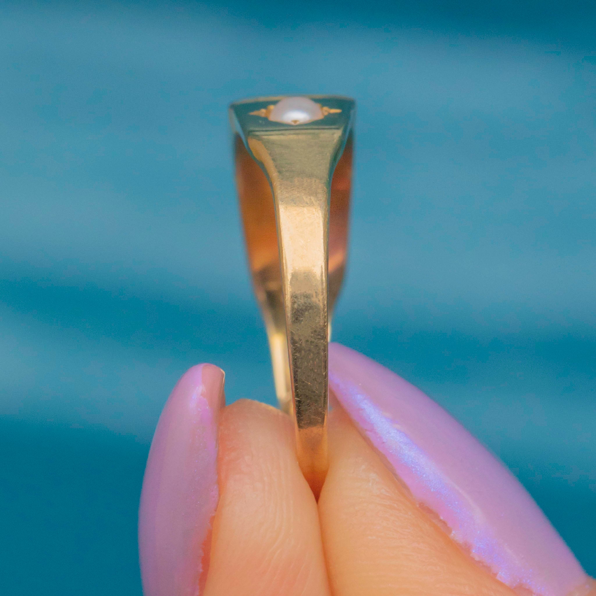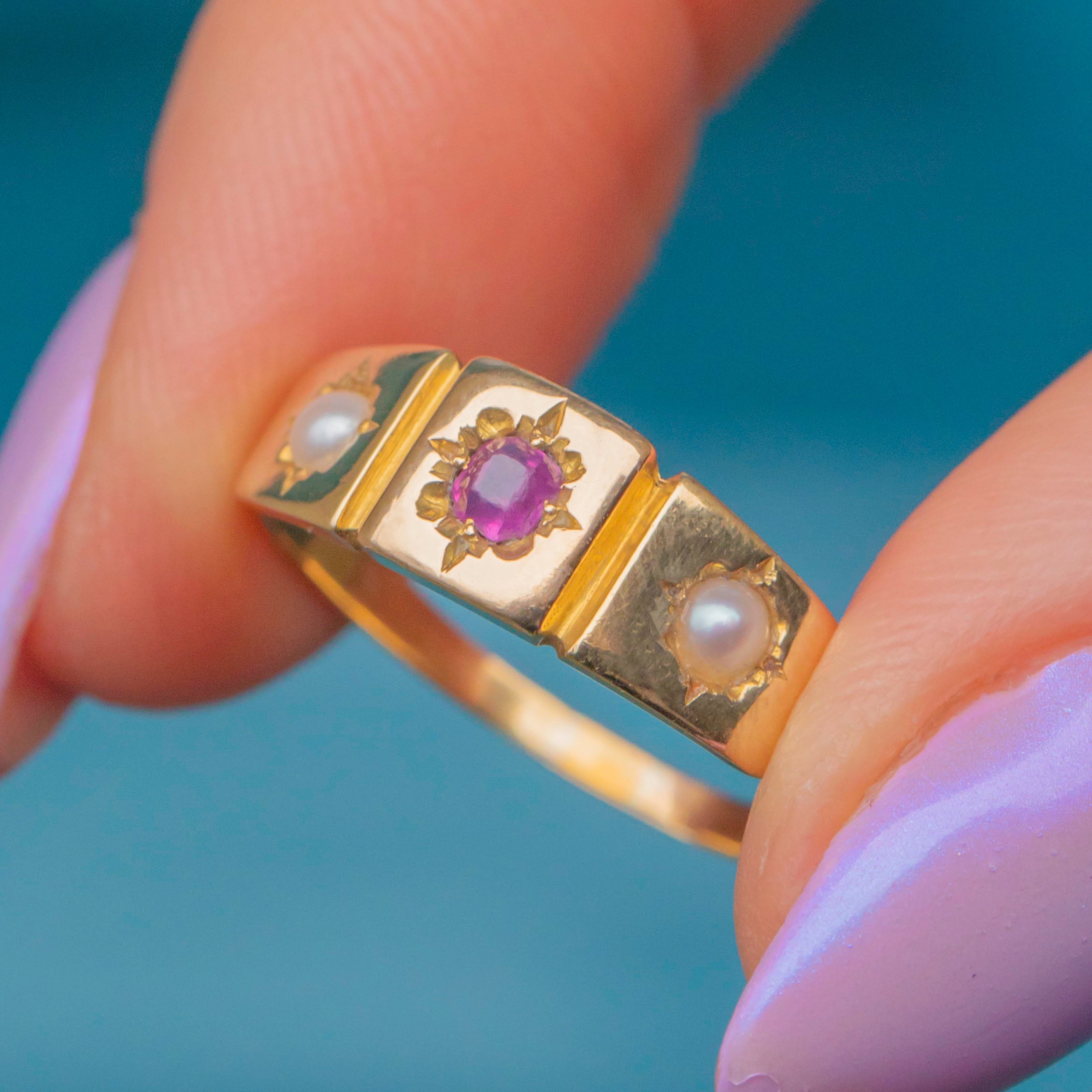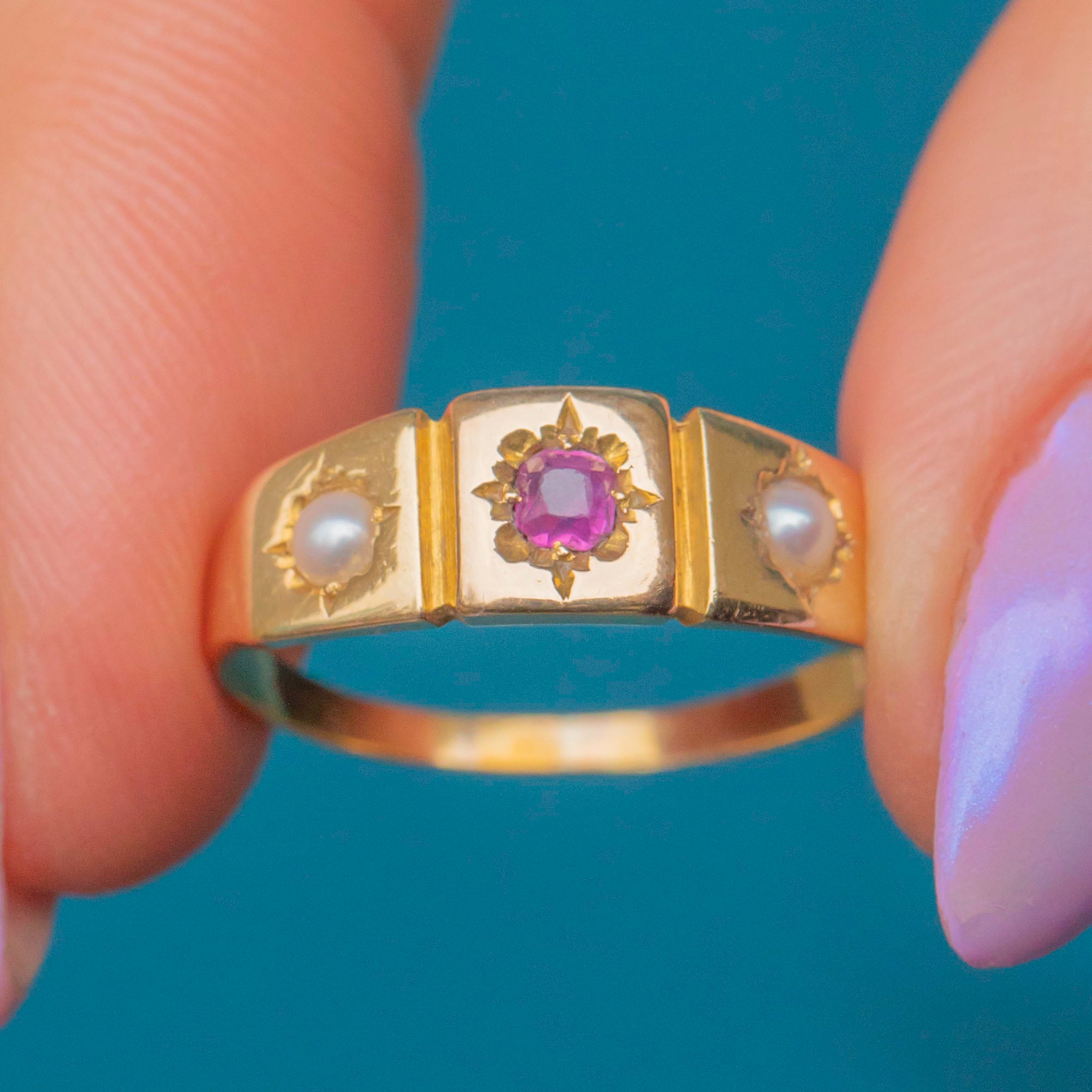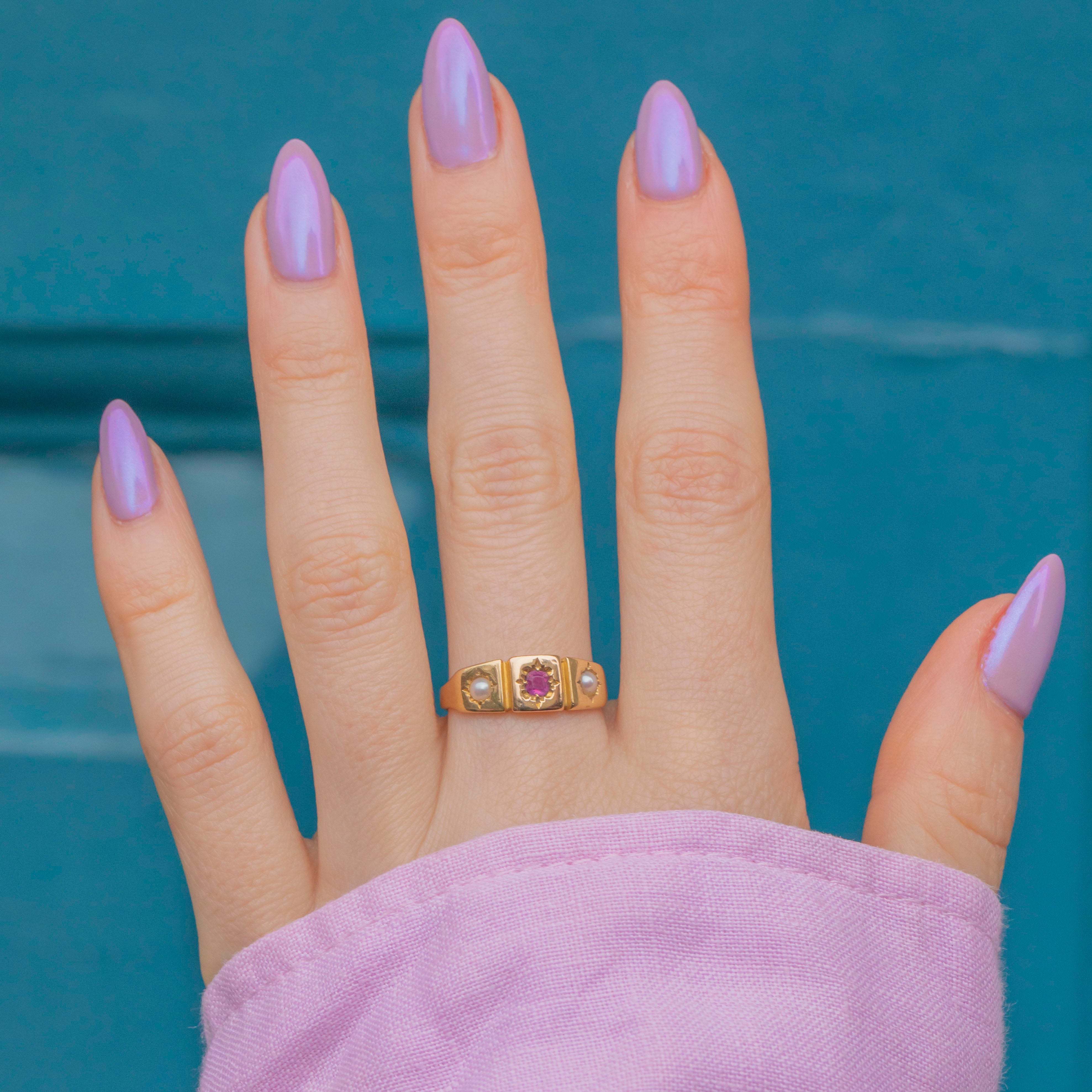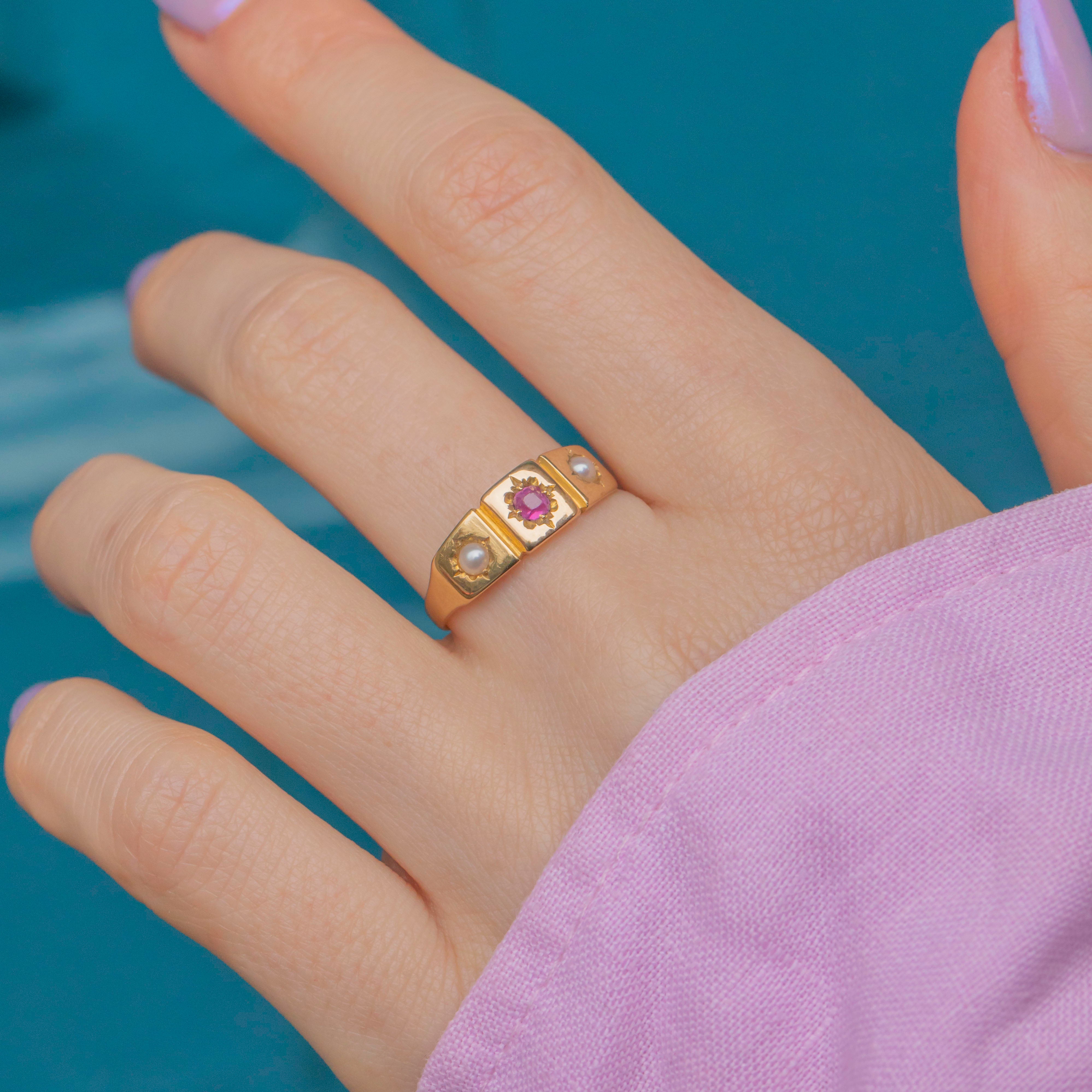 Add some Victorian charm to your ring stack with this delightful antique 18ct Gold Ruby Pearl gypsy ring! The buttery 18ct Gold band displays a delectable row of gemstones, with a rich fuchsia Ruby taking centre stage flanked by plump Pearls on either side.