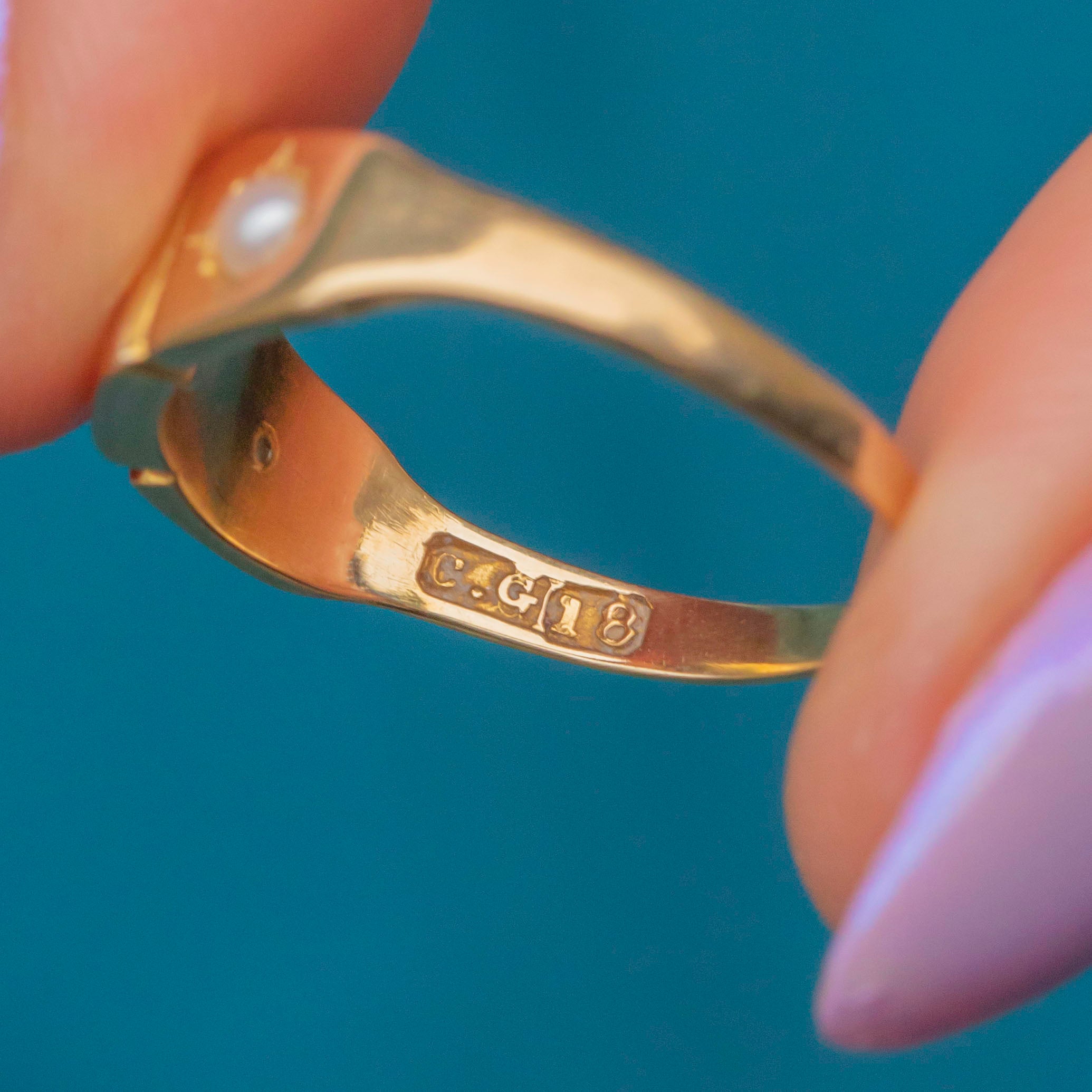 VERY GOOD-EXCELLENT. This antique 18ct Gold Ruby and Pearl gypsy ring is in great condition. Her Ruby and Pearls are all radiant and sit securely in their settings. There are some signs of wear to the Gold, particularly on the inside of the band, however this is difficult to spot, and won't be noticeable during wear. With little else to note, she is a must-have!