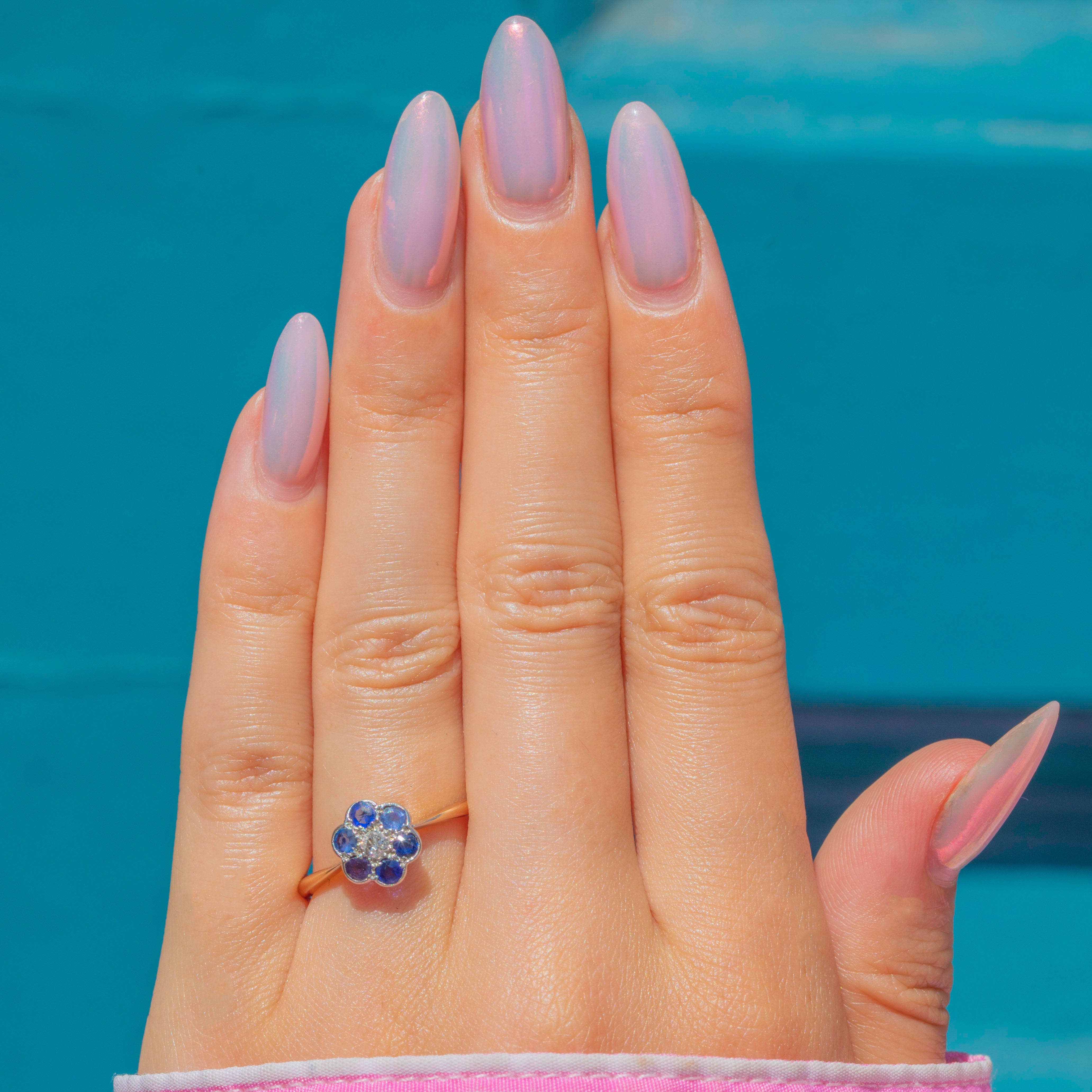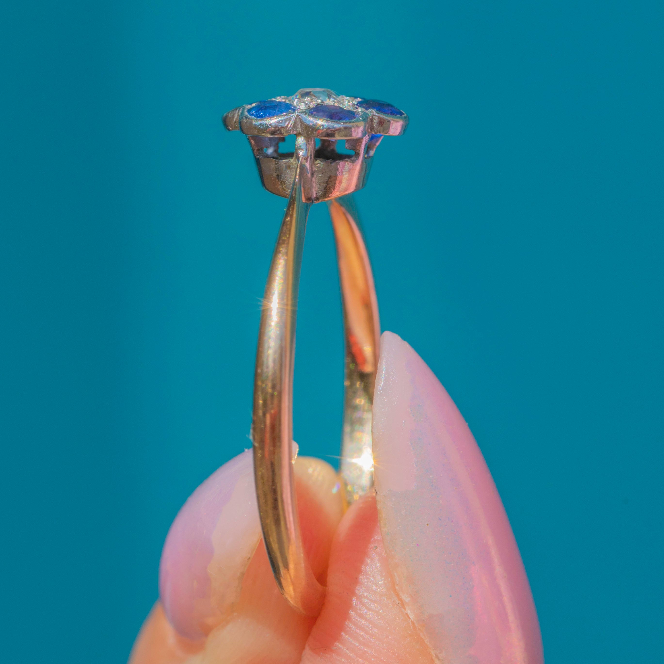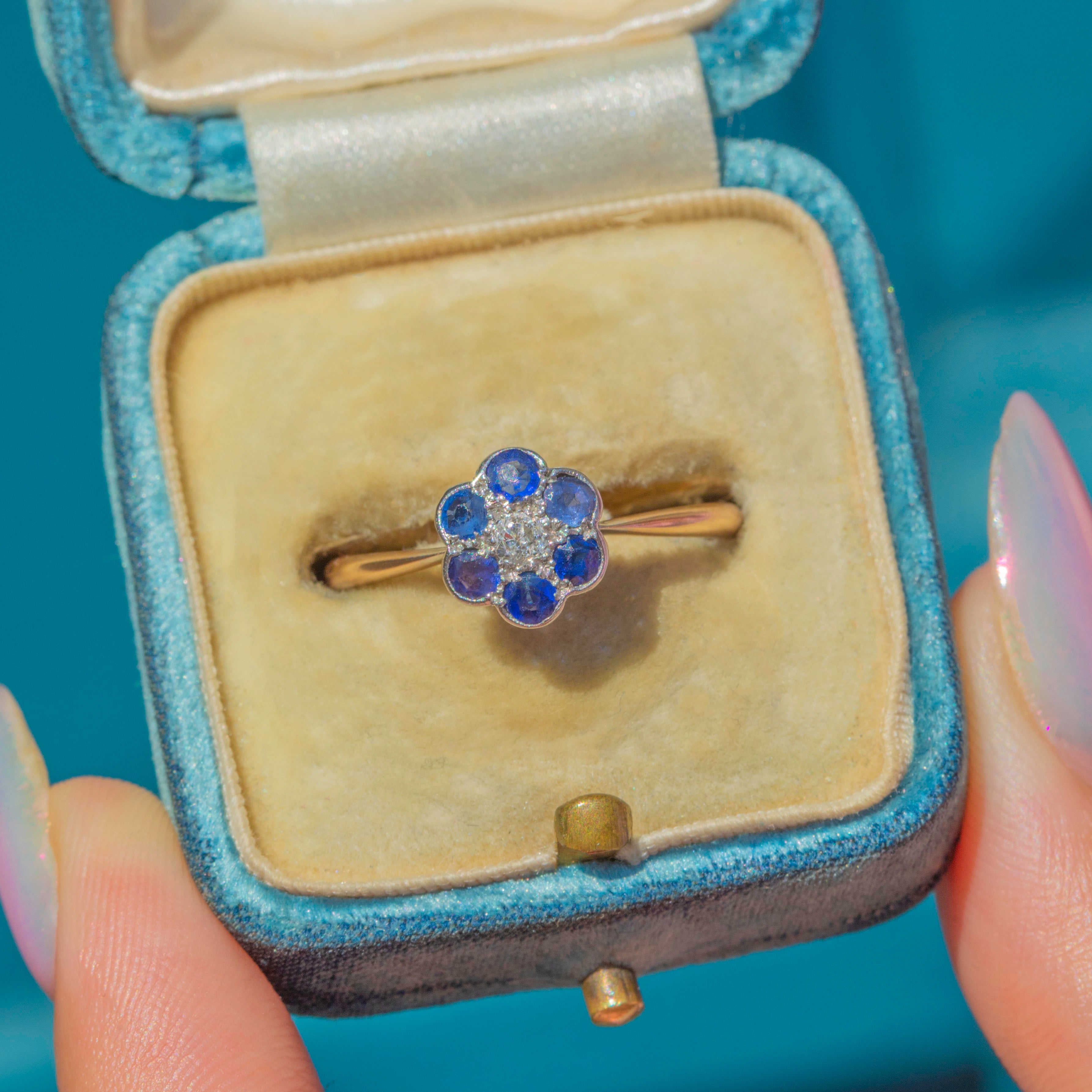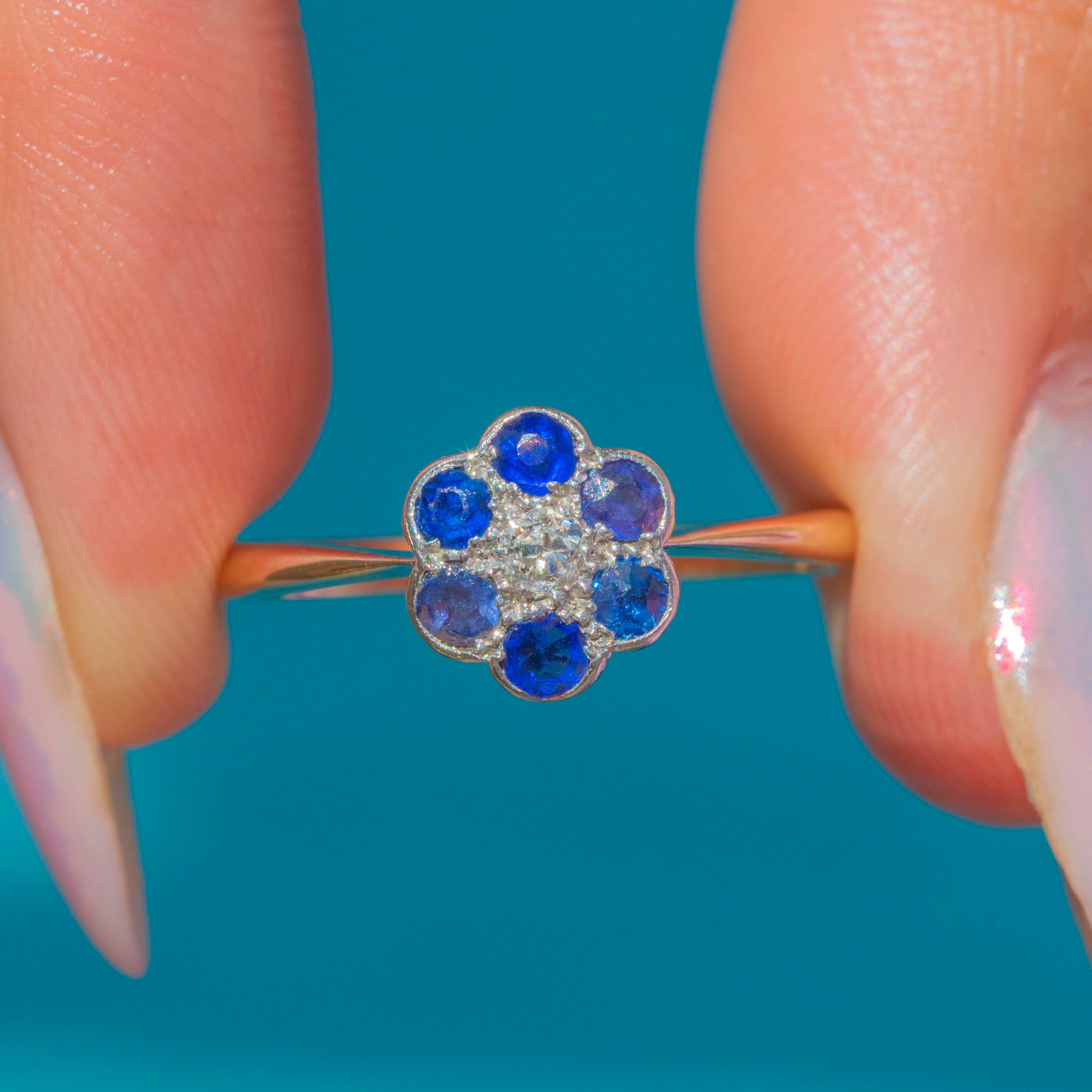 This dainty Edwardian cluster ring is crafted into an adorable antique floral motif, with 0.25 carats of radiant royal blue Sapphire petals. It is centred by a scintillating 0.10ct Old-European cut Diamond, with each gemstone set in glossy Platinum settings.