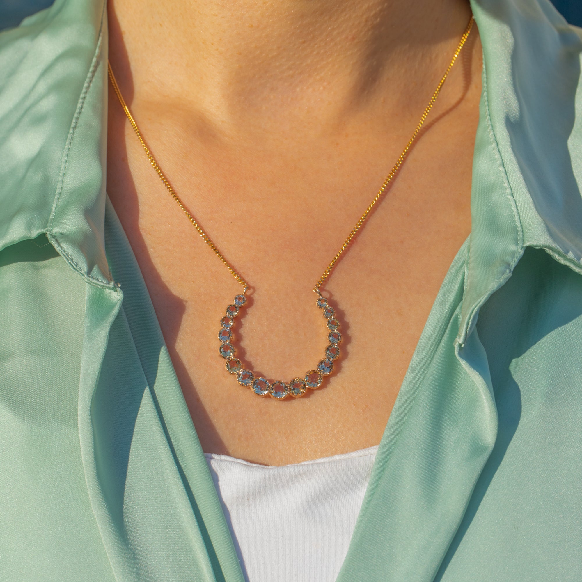 EXCELLENT: The Topaz stones are bright and lively with no noticeable chips or abrasions, and only very light age-consistent wear under magnification. The Gold collet settings and crescent frame are secure and well-preserved with crisp edges. The 18ct chain, jump rings and fittings are all in excellent working order, fastening securely and ready for regular wear.