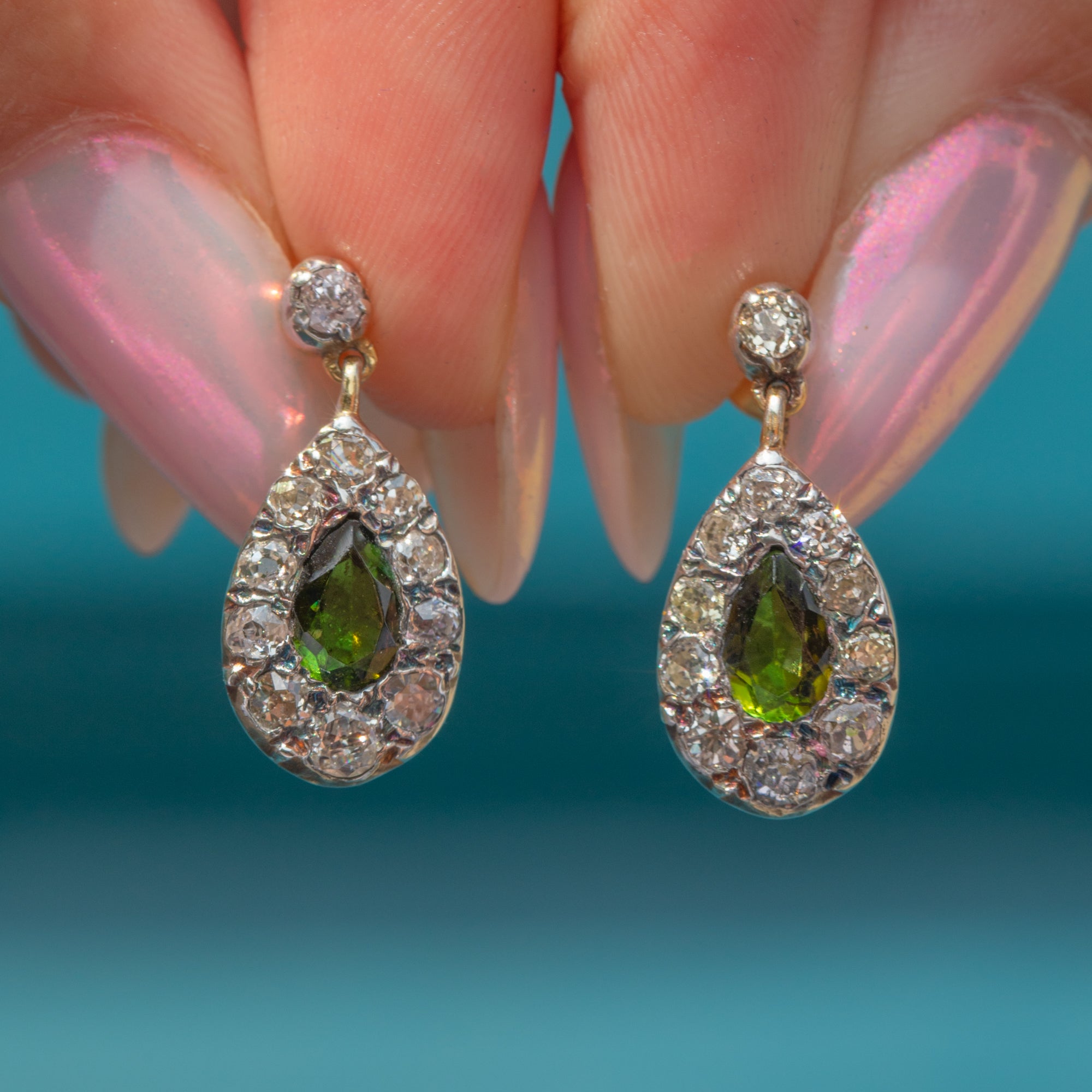 EXCELLENT: These antique 18ct Gold Tourmaline Diamond pear drop earrings are in wonderful condition. Each gemstone is radiant, free from any scuffs or scratches and secure in its setting. One Tourmaline has a small inclusion - what we like to see as a little nod to Mother Nature. There are some minor dings to the Gold on the back of the earrings, though this cannot be seen during wear and is difficult to spot without a loupe. With secure butterfly backs, these drop earrings can be worn with utmost confidence!
