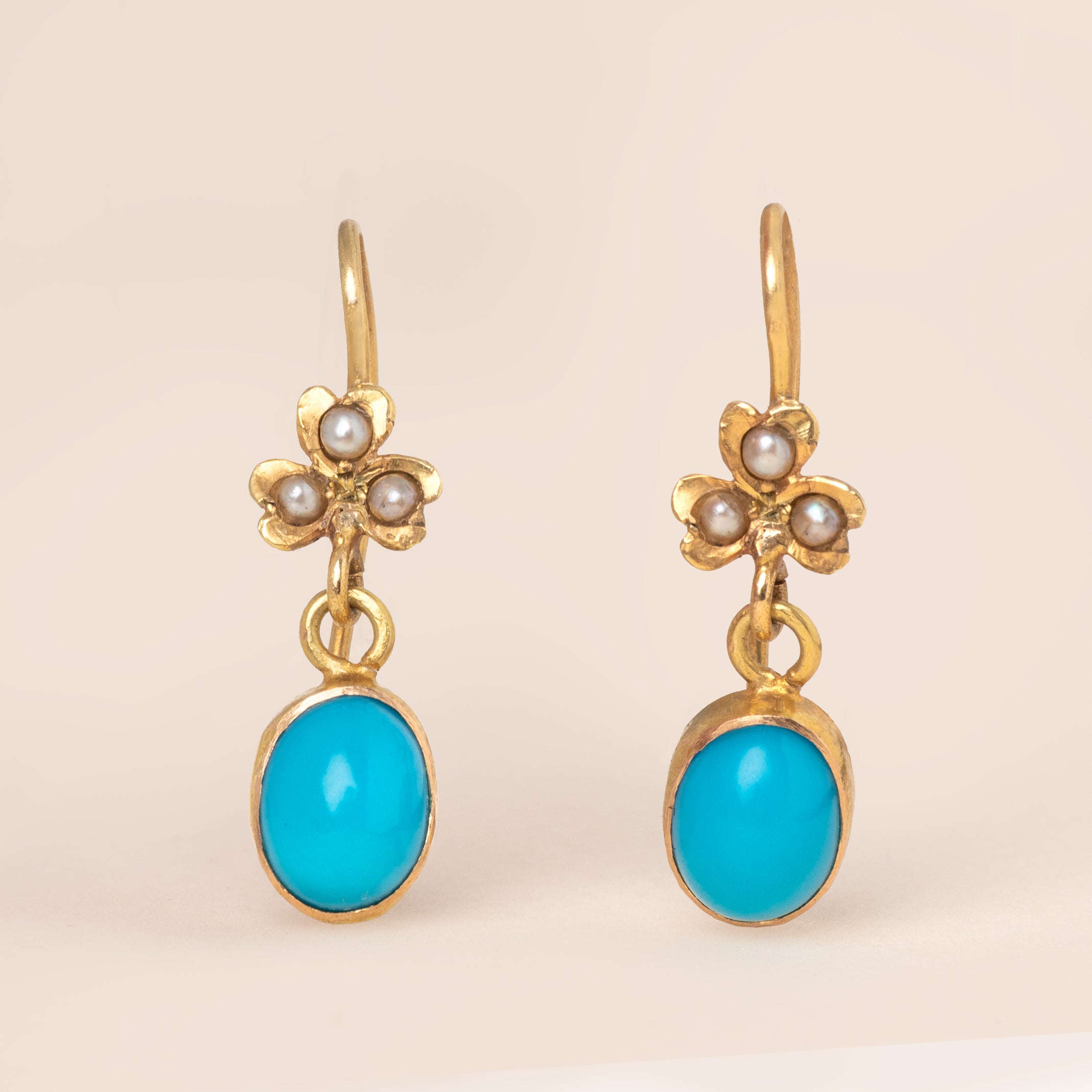 EXCELLENT. With secure set gemstones, buttery Gold, and each component firmly connected, these antique 18ct Gold Turquoise Pearl drop earrings are in excellent condition!