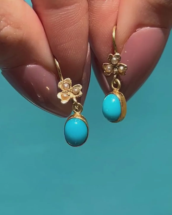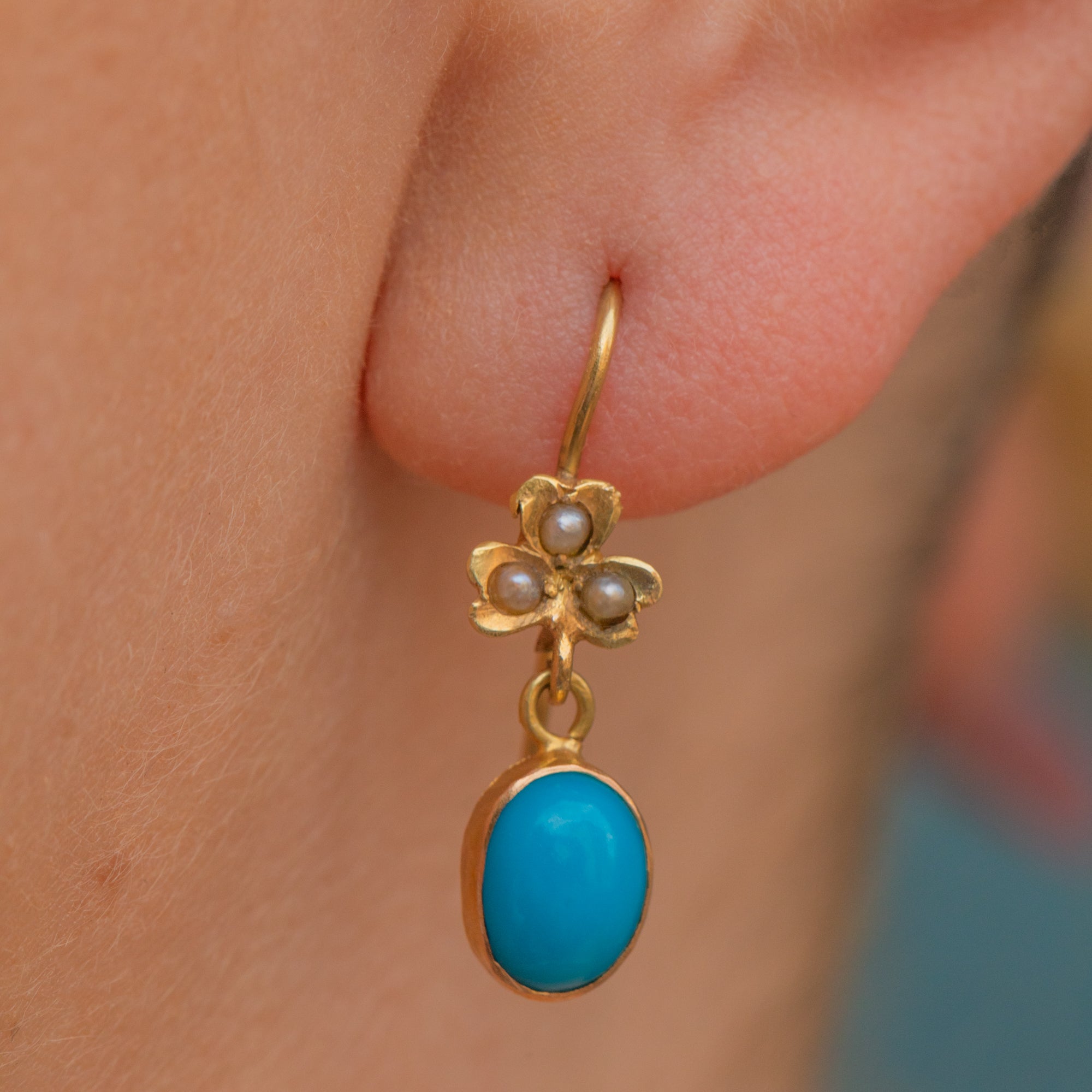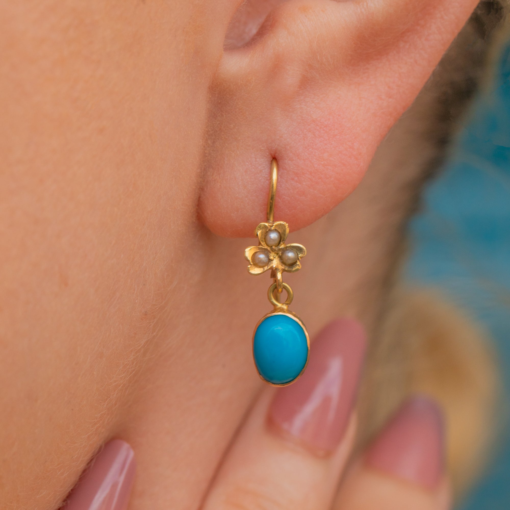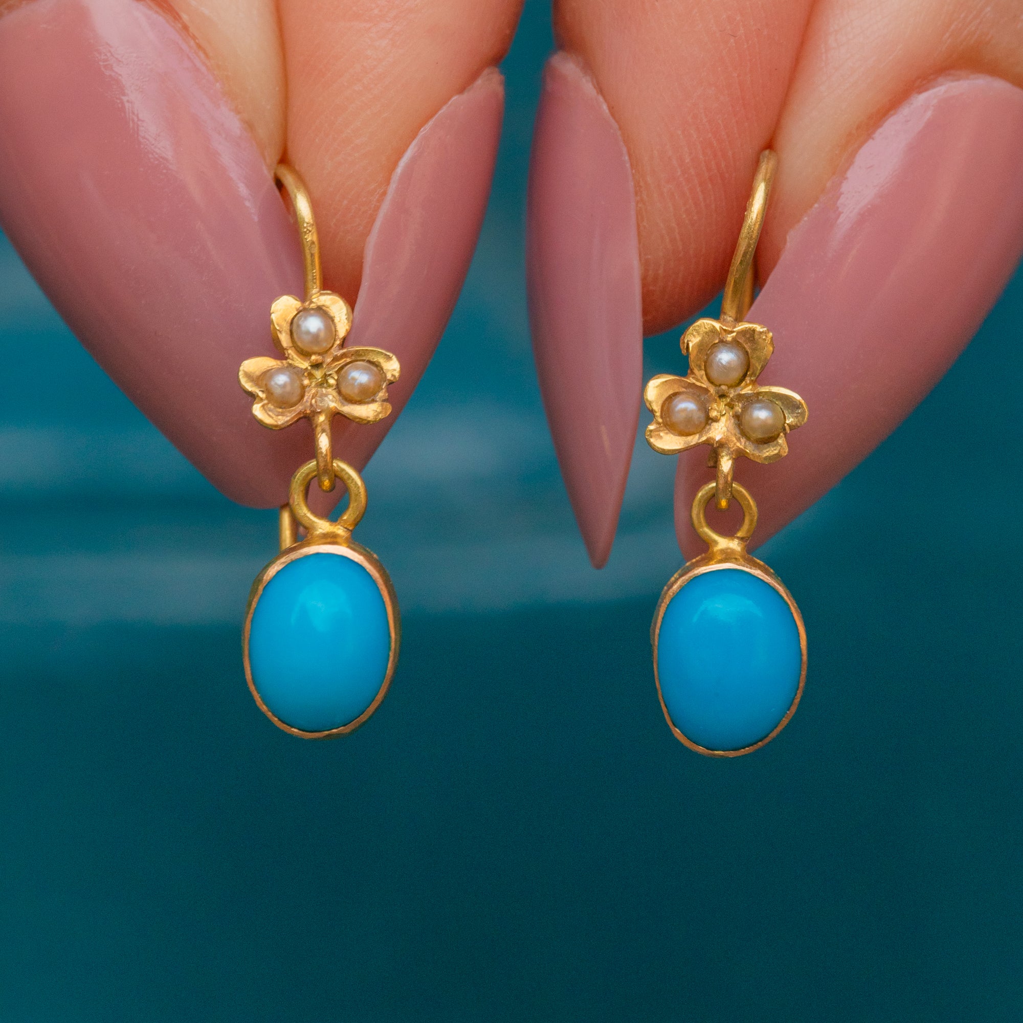 Antique 18ct Gold Turquoise Pearl Drop Earrings