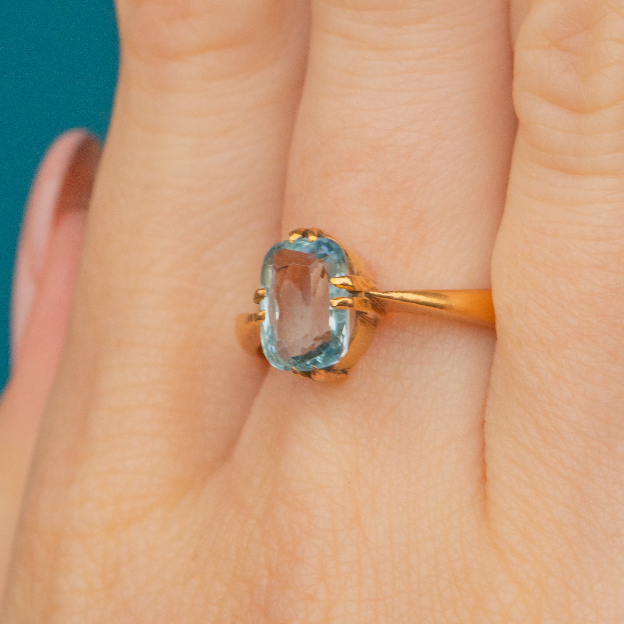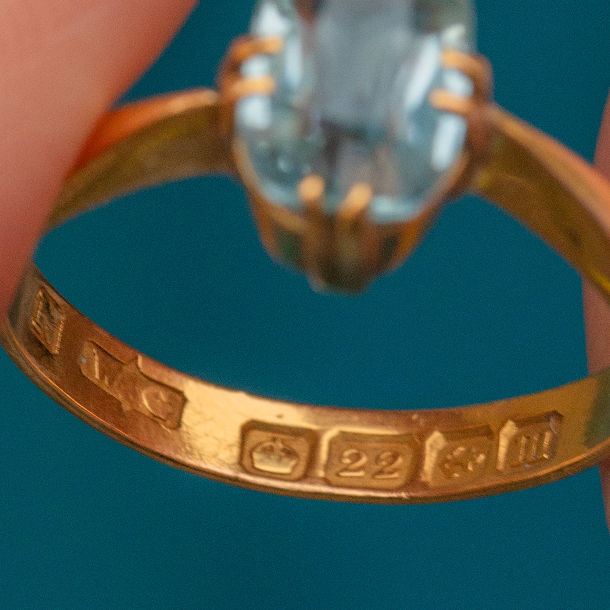 VERY GOOD-EXCELLENT. This antique 22ct Gold Aquamarine solitaire ring is in wonderful condition. The Gold is sumptuous with an even saturation throughout, with only minor age-related wear on the back of the band. The Aquamarine is pristine, with no chips or abrasions, and is secure within its claw settings. One of the double claws appears to have been previously repaired, but this is only noticeable under close inspection and has been carried out very well. The full set of hallmarks are chunky and easy to read, dating this exquisite antique Aquamarine ring to 1911.