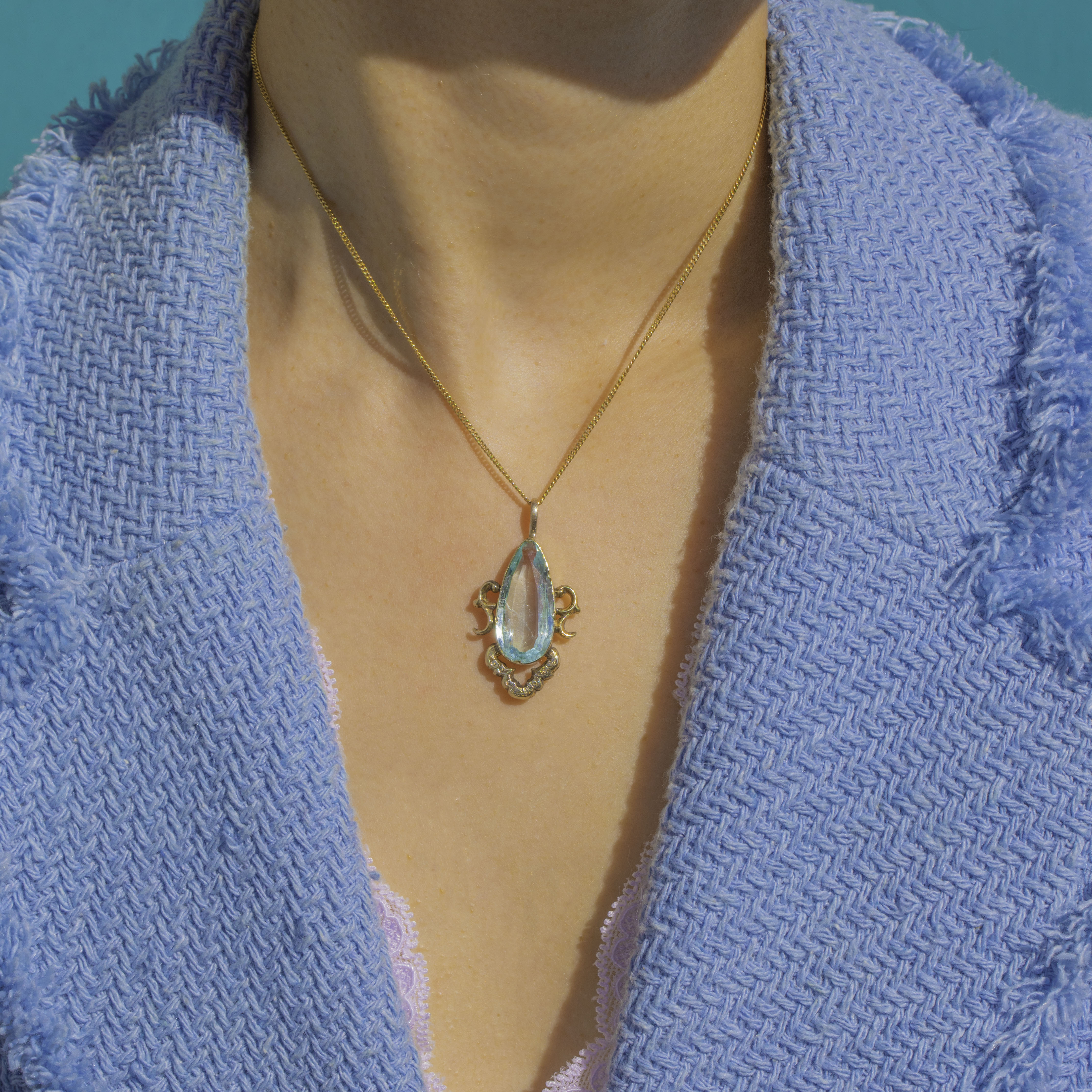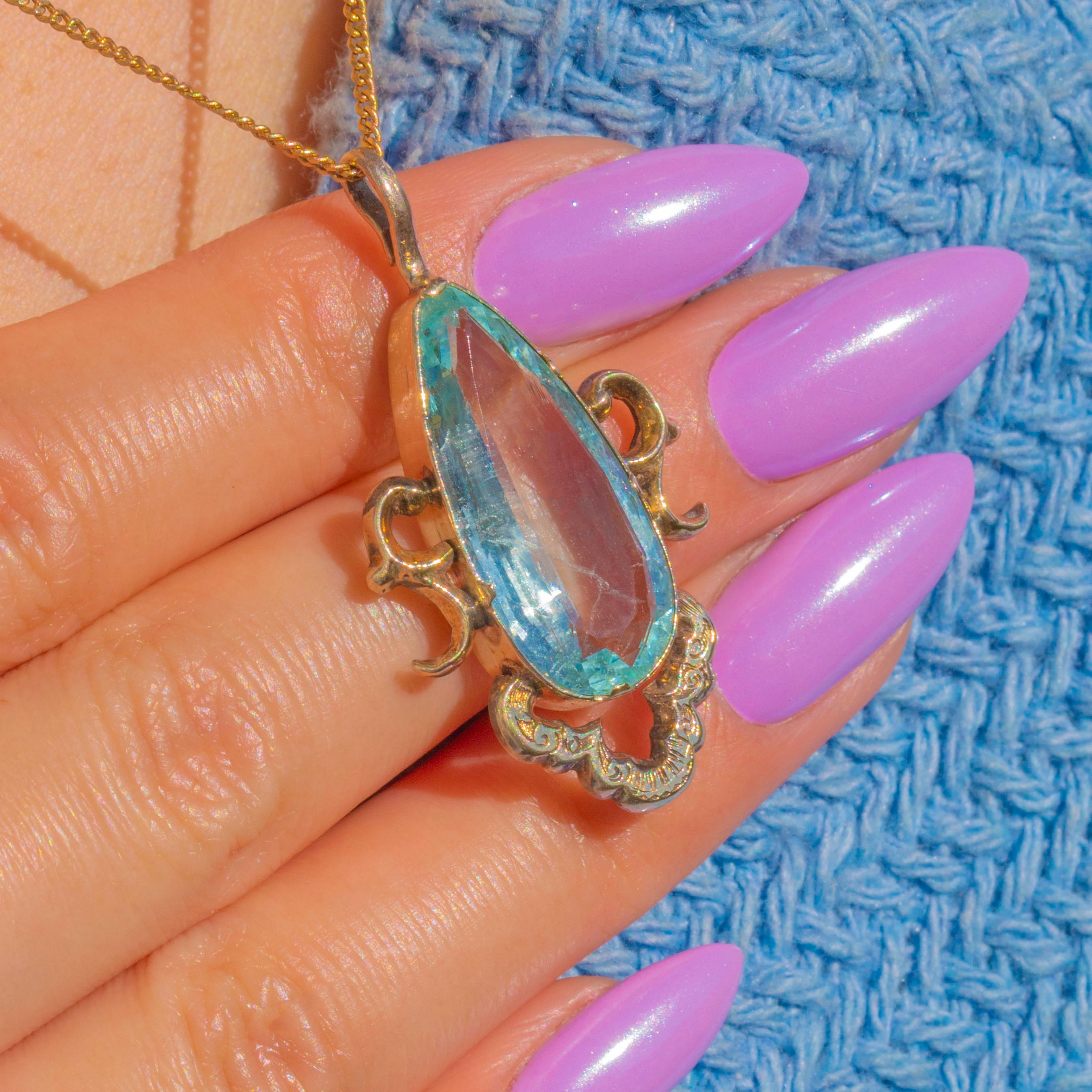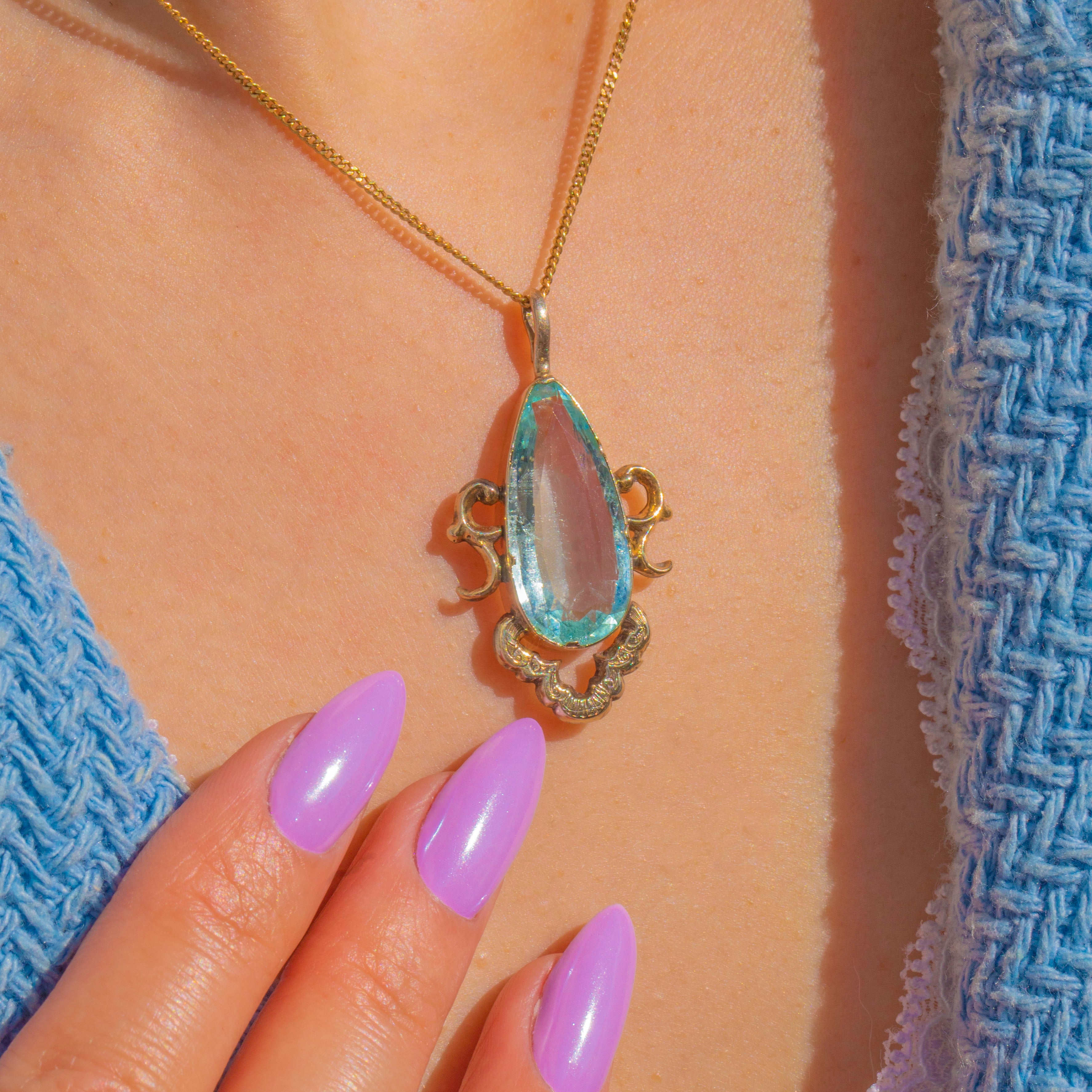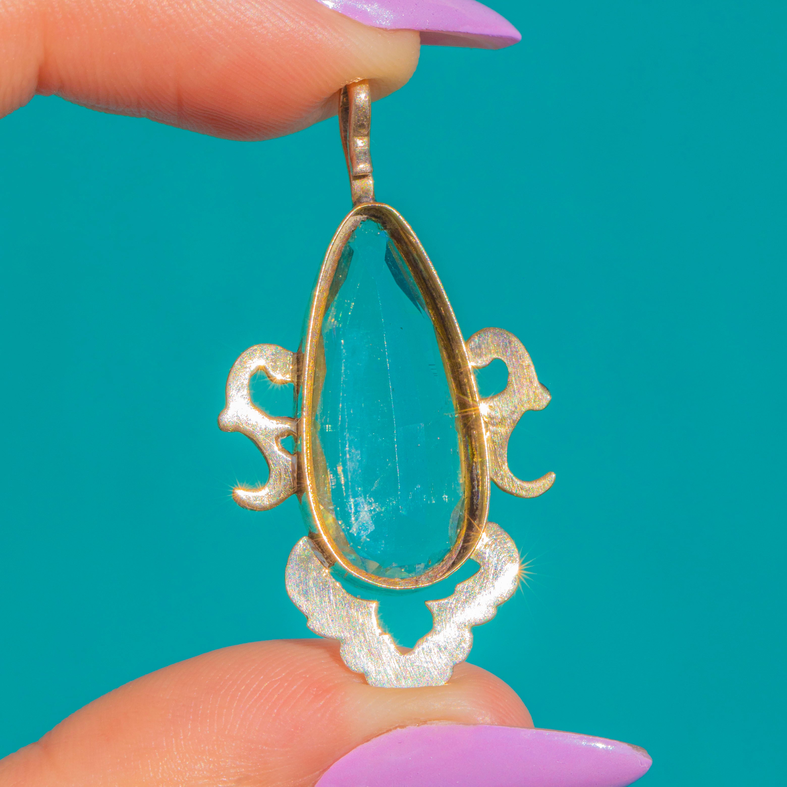 Graceful and romantic, this Victorian teardrop pendant showcases an elongated, faceted Aquamarine of approximately 4.30ct in a warm 9ct Gold setting. The pale sea‑blue gem glows beautifully against its Gold surround, enhanced by a pierced foliate gallery and an exquisitely chased, scalloped cartouche that lends an ornate Rococo flourish.