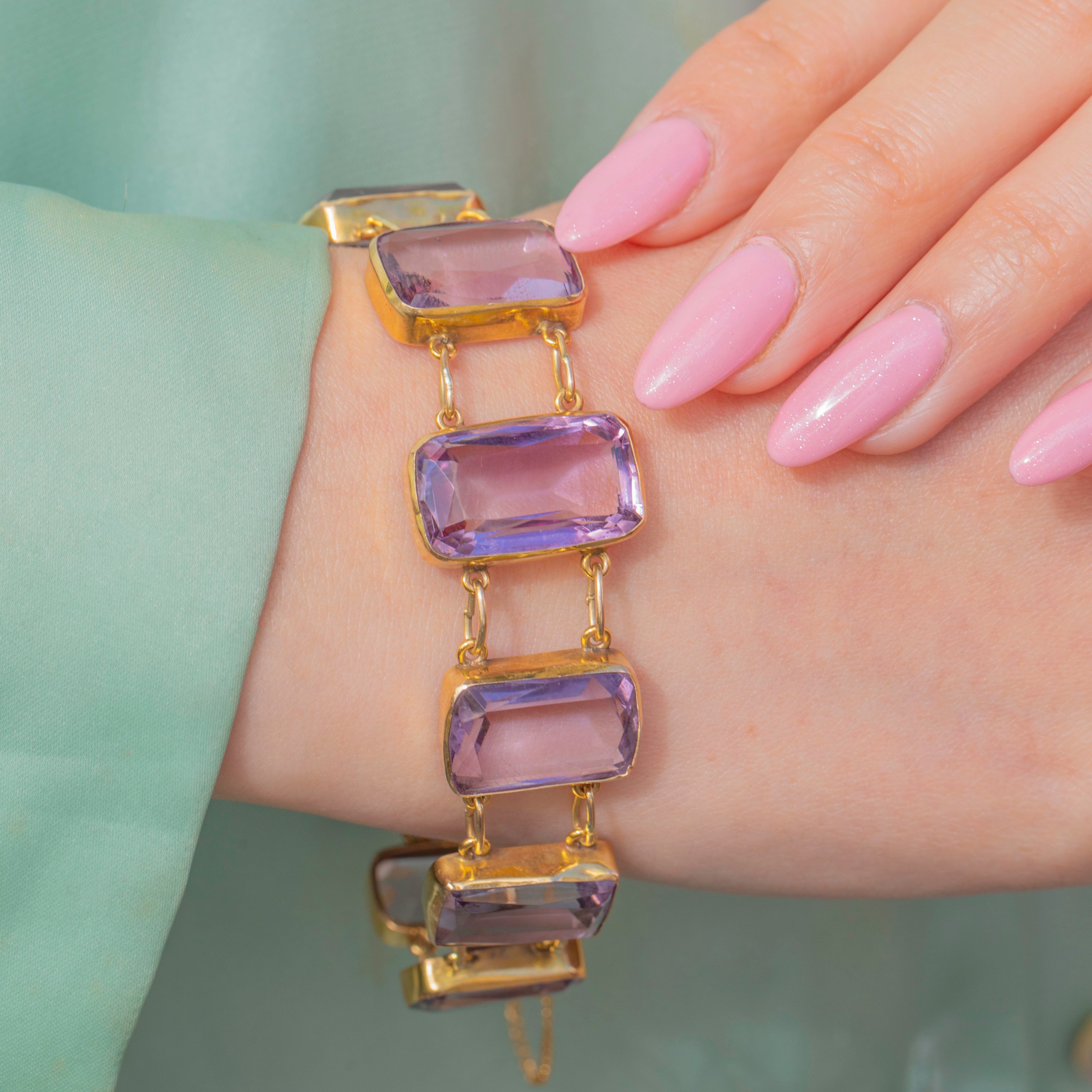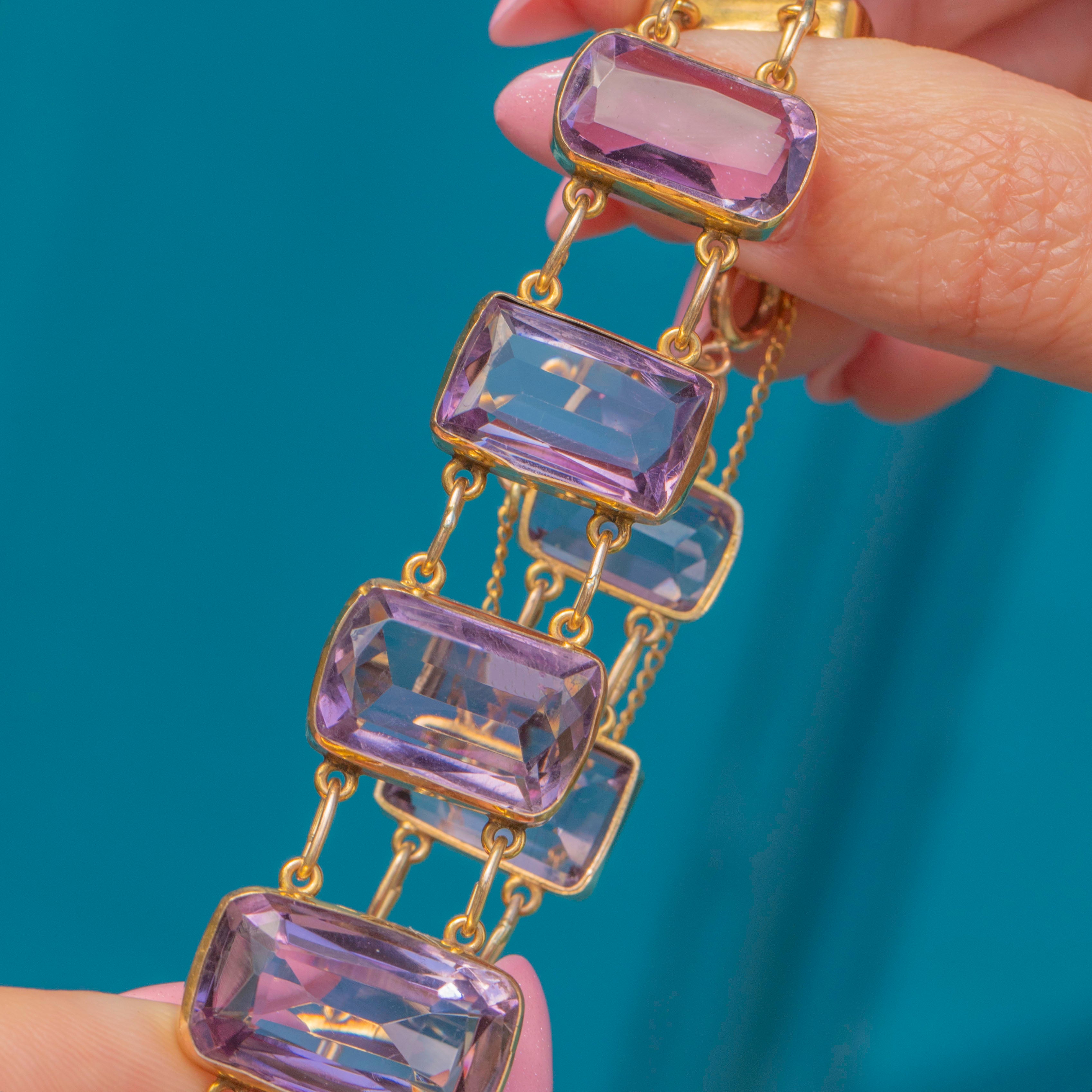 Each gemstone is expertly cut to allow the light to dance across its facets, creating a radiant display of lavender hues. The lovely lilac tones are perfectly complemented by warm 9ct Gold, which carries a bright honey-hued blush, enhancing the bracelet’s antique charm.