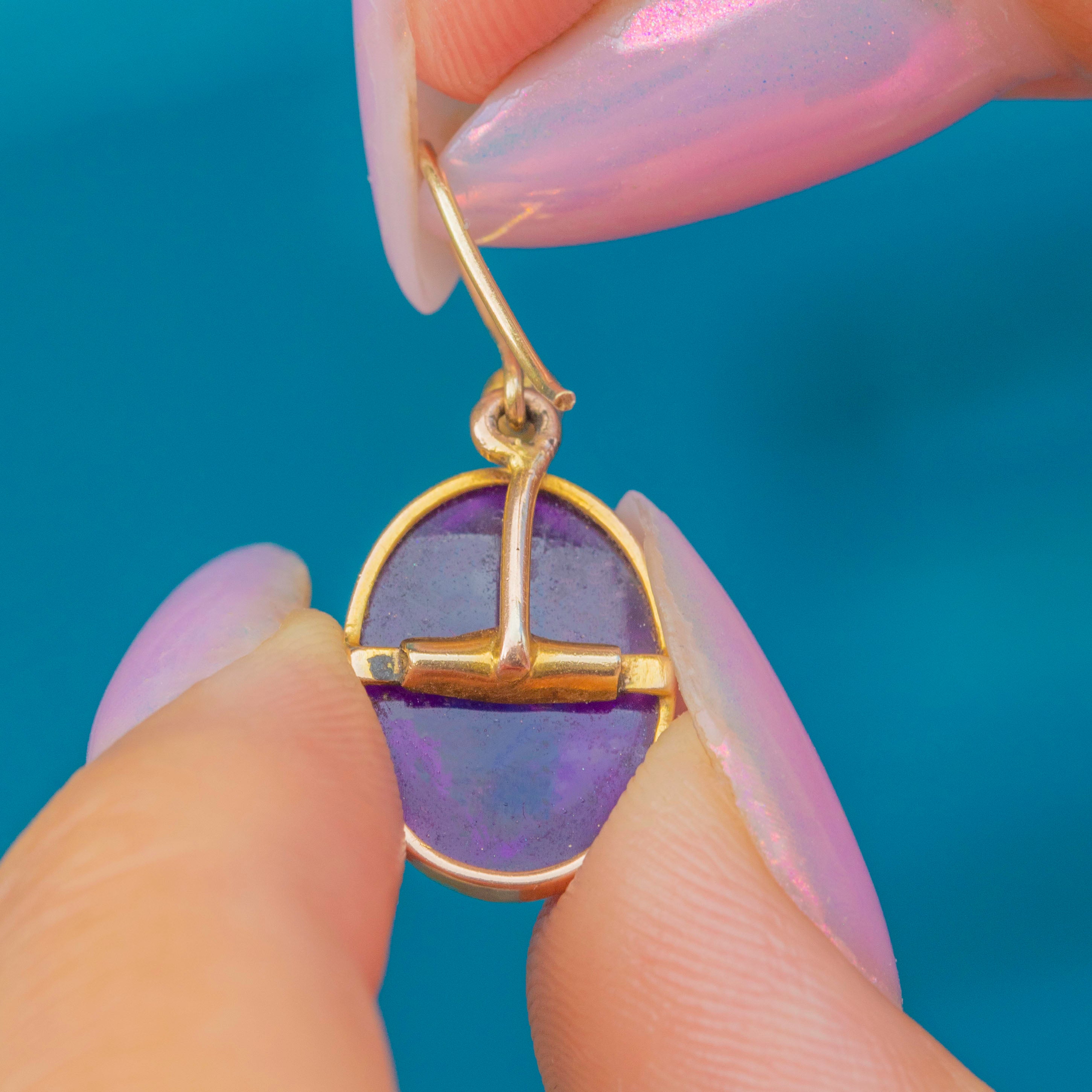 Each Amethyst has been cut into a striking sugarloaf cabochon, with its glossy domed profile radiating saturated deep Royal purple hues. Hugged by sumptuous 9ct Gold bezels and dancing with movement as they suspend from matching hooks, these Art Deco earrings are a colourful delight!
