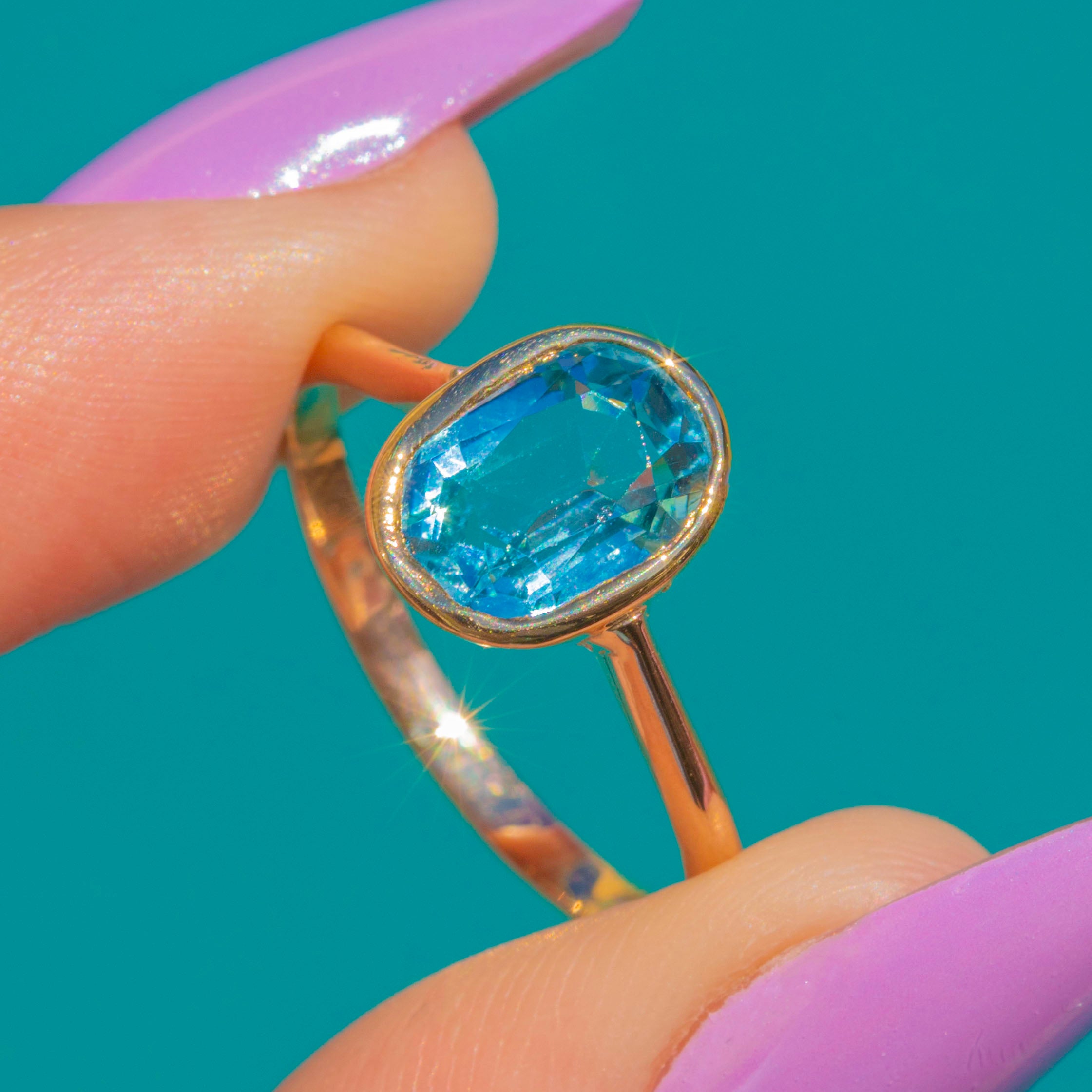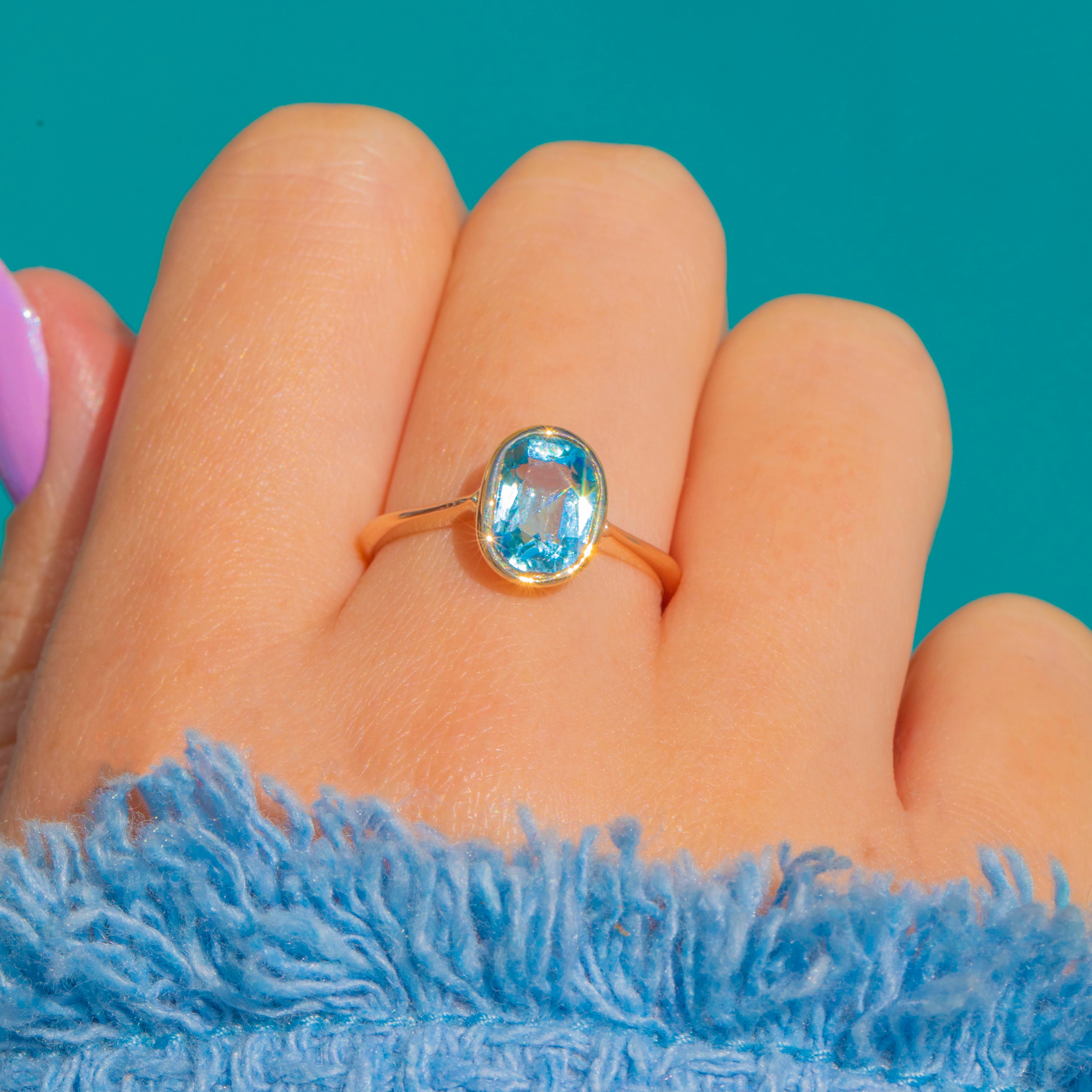 A luminous Edwardian Aquamarine solitaire, this refined ring pairs a cool, watery 1.10ct Aquamarine with buttery 9ct Gold. The oval gem is embraced by a sleek rub-over bezel, creating a smooth, modern line that feels wonderfully secure and effortlessly elegant.