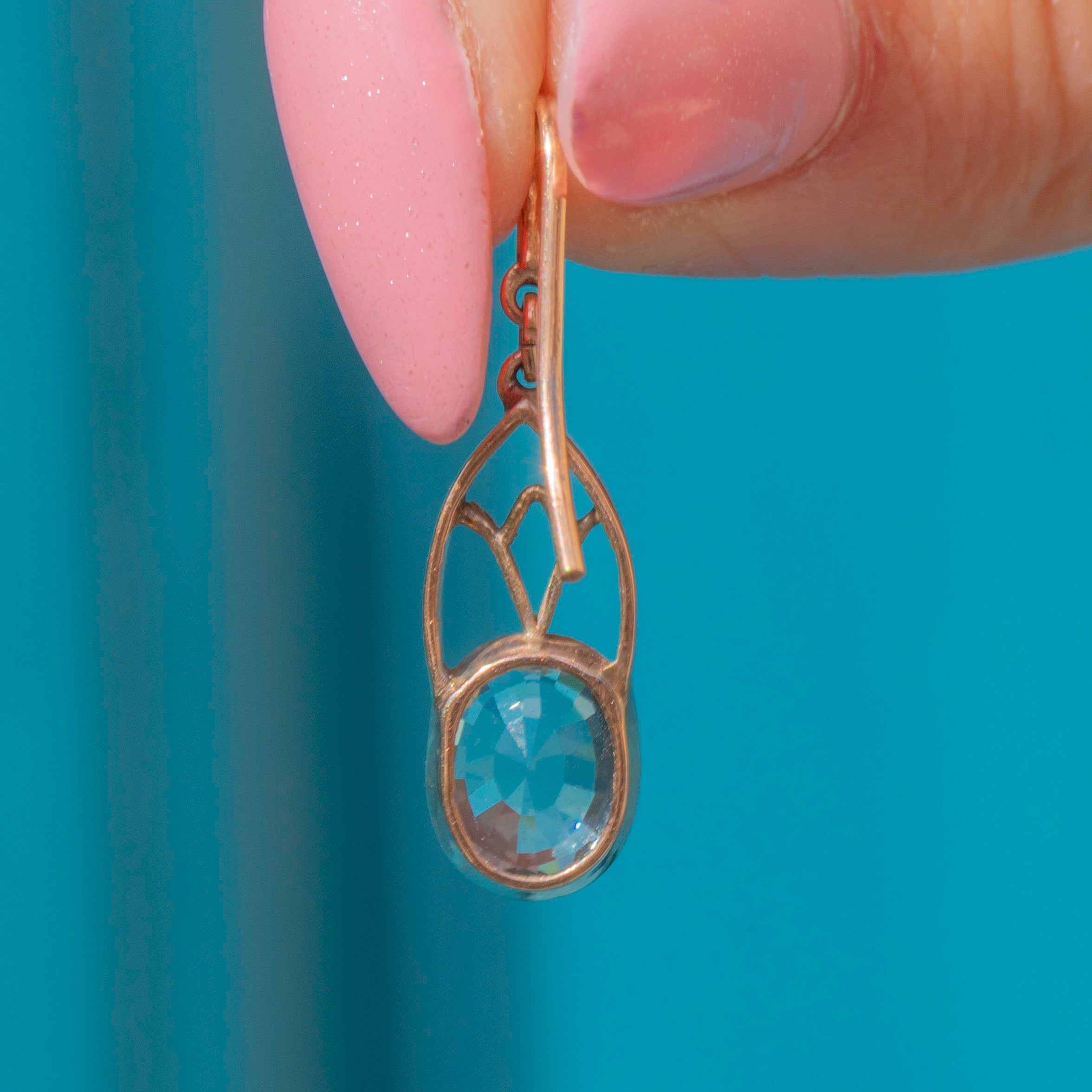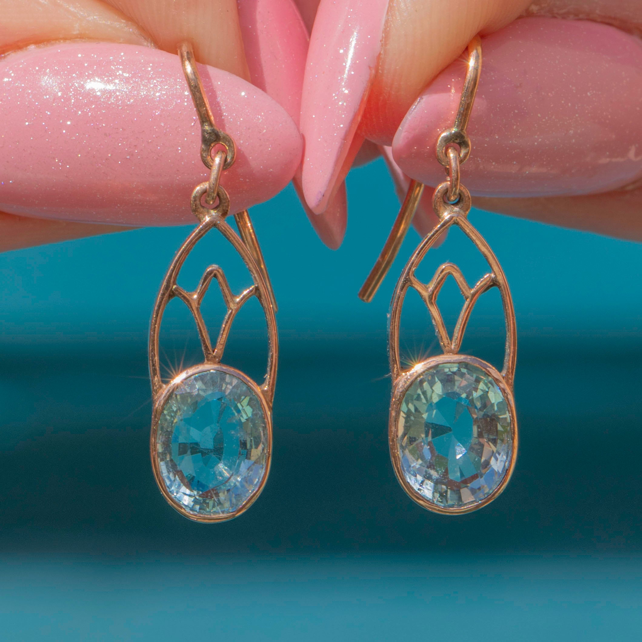 Their Aquamarine are crowned by an archway of Gold work, crafted entirely from blushed 9ct Gold. The crisp blue hues contrast beautifully against the rosy 9ct Gold sure to make a sweeping statement as these Victorian Aquamarine earrings adorn your ears.