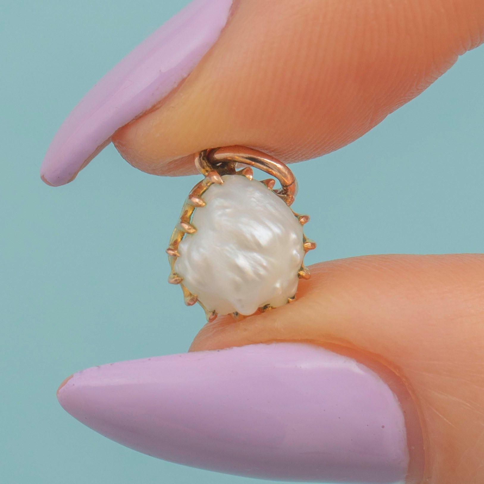 EXCELLENT. This antique 9ct Gold Baroque Pearl charm is in divine condition. Her Pearl has a naturally irregular form and beautiful luminosity, and is securely set within 9ct Gold claws. The Gold is bright and buttery, free from damage. She will easily suspend from a fine chain!