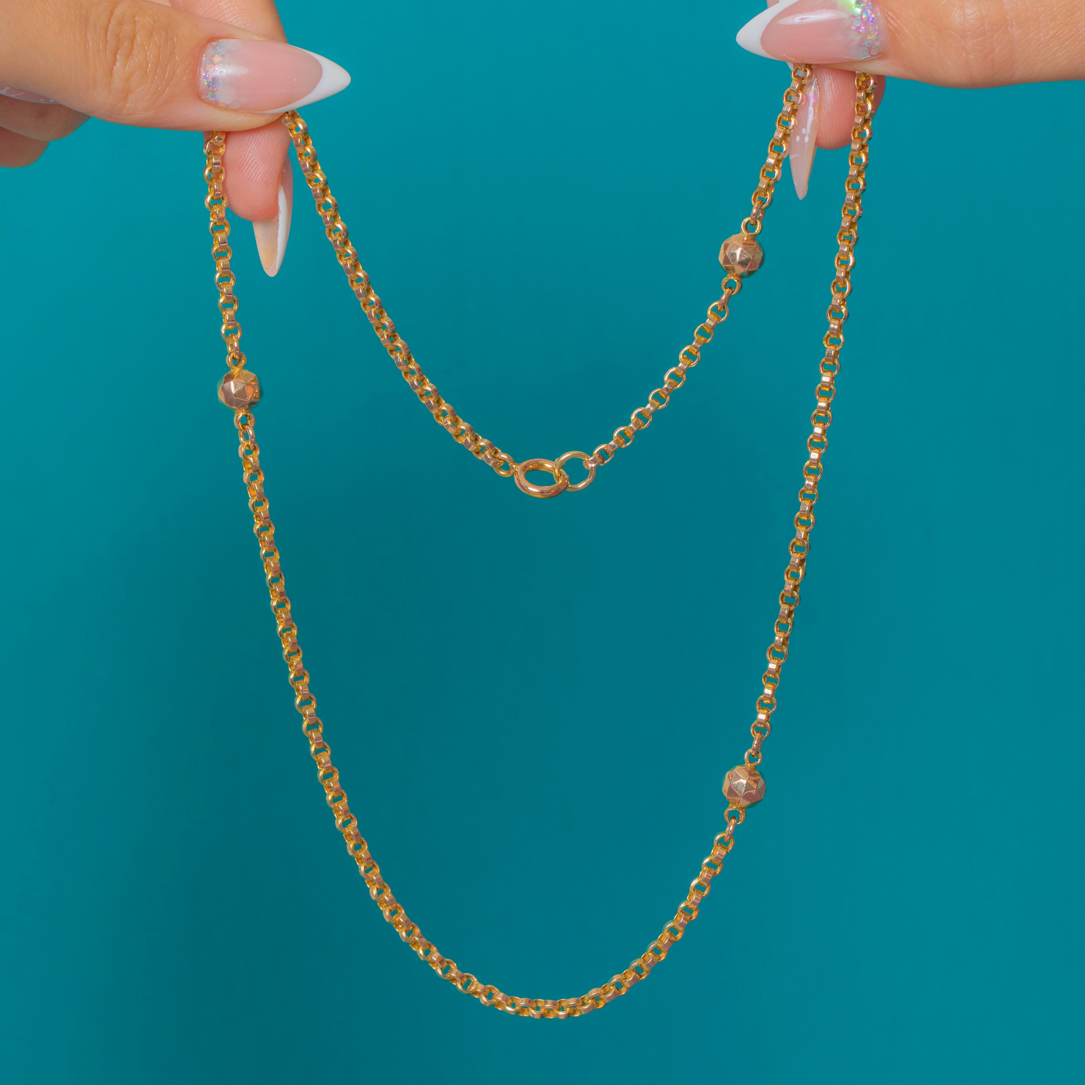 This Victorian 9ct Gold belcher chain is a charming and unusual example, featuring faceted Gold beads spaced along the length of the chain. These subtle facets catch the light beautifully, adding sparkle and texture while keeping the look classic and refined.