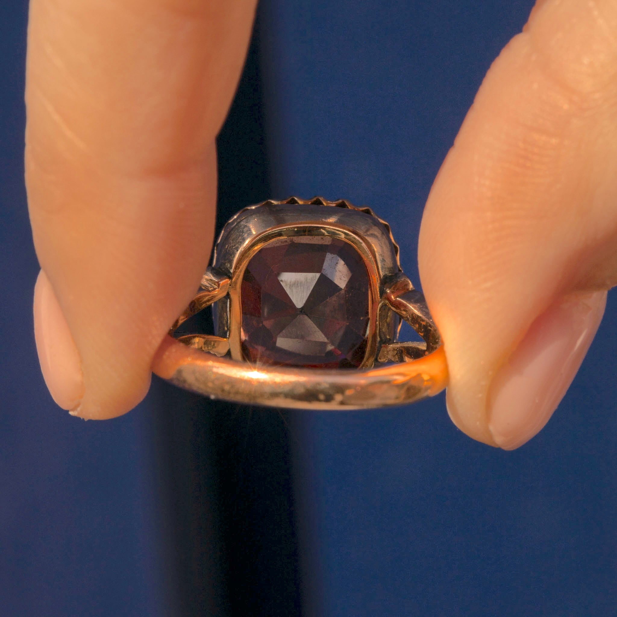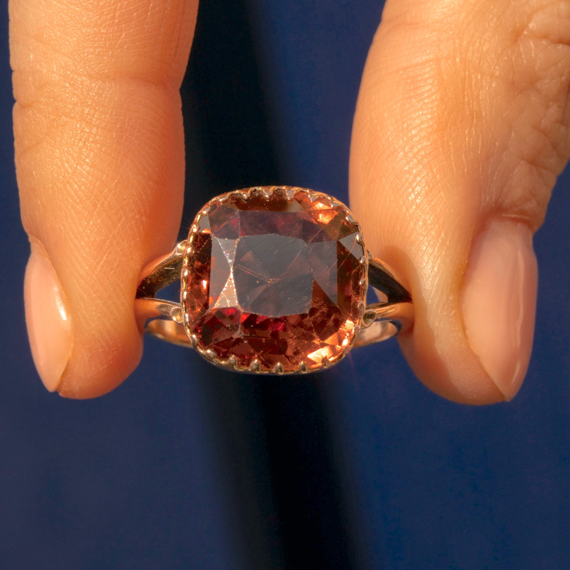 VERY GOOD. This antique 9ct Gold brown Zircon ring is in very good condition. The Zircon has kept beautifully and has wonderful double refraction lines visible- a typical trait of Zircons; she is free of chips and looks gorgeous. The setting does have some discolouration present but nothing that draws the eye. The ring has been resized once upon a time, which has left a solder mark, but the ring band wears super smoothly and comfortably.