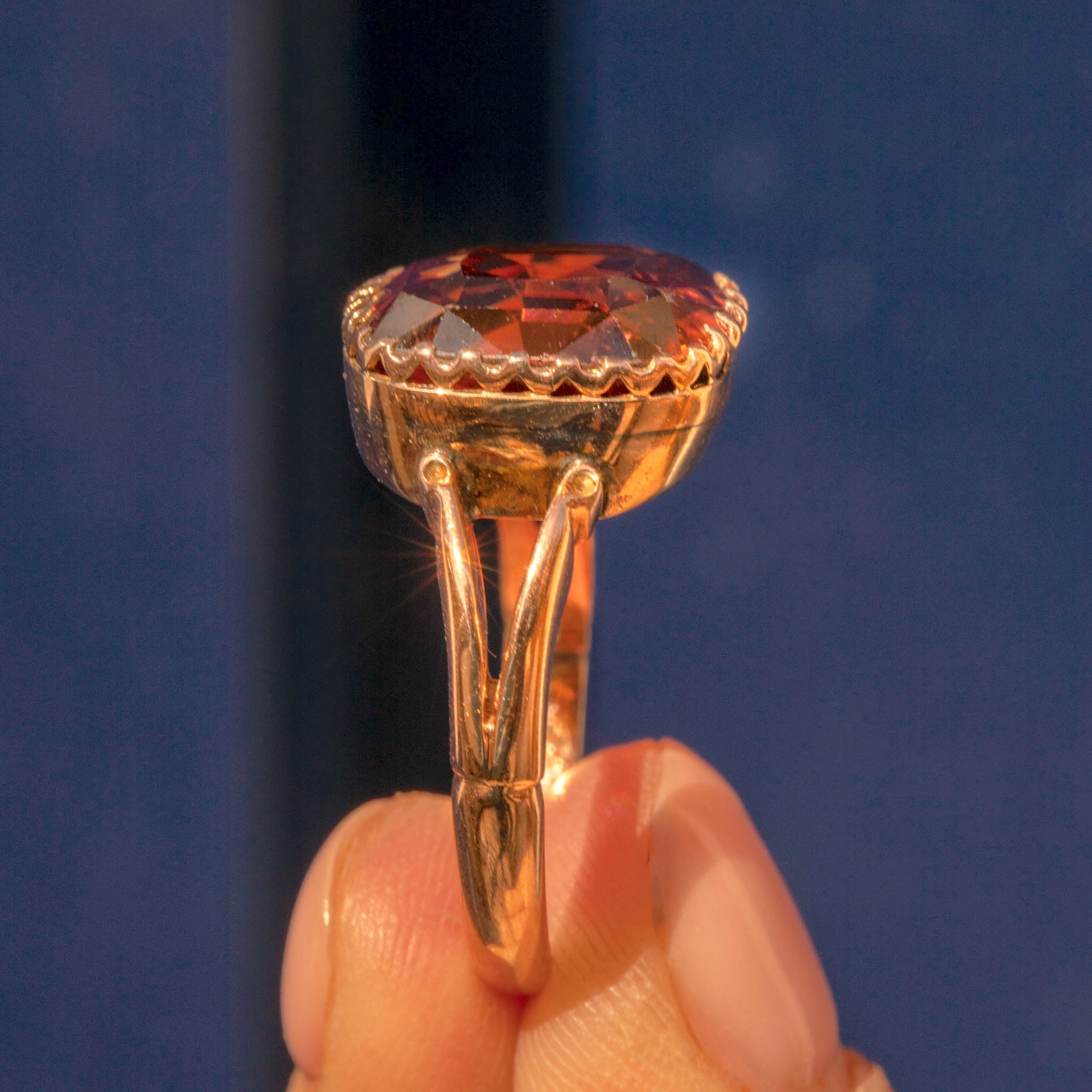 This is a sublime 9ct Gold brown Zircon ring! An incredibly rare find, this impressive ring is home to an 8.50ct brown Zircon that possesses an alluring peachy undertone.