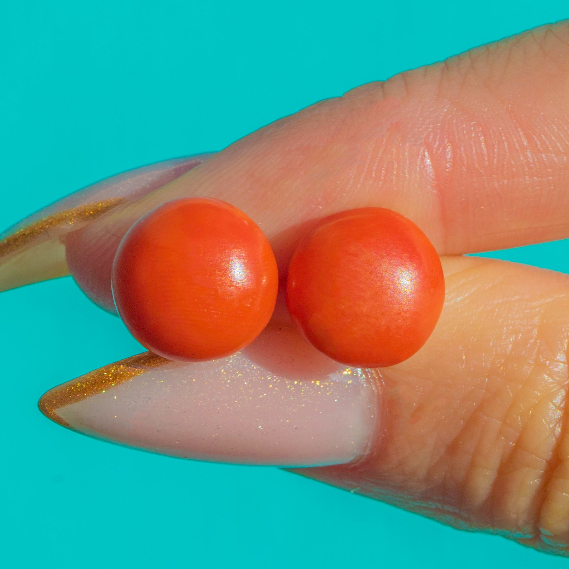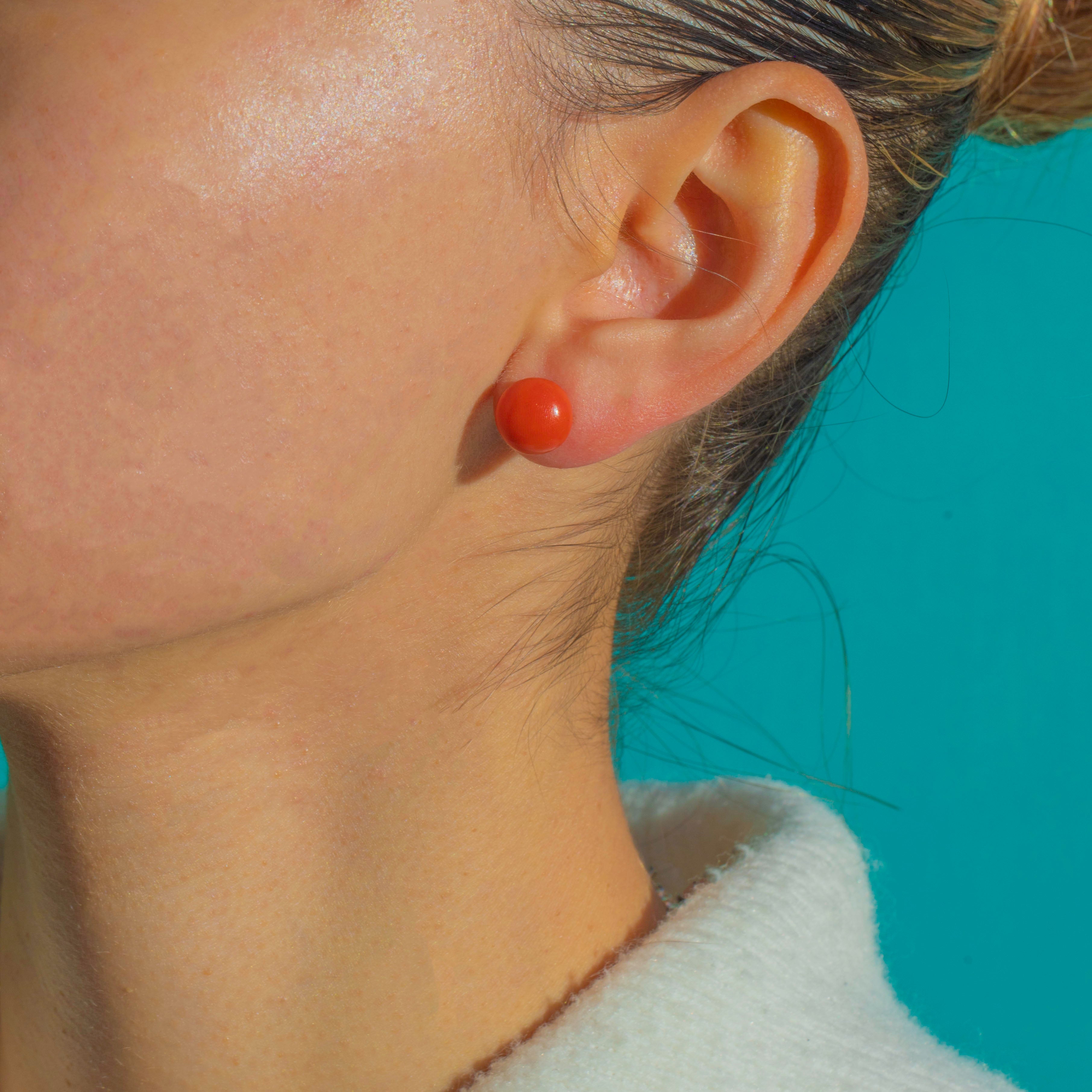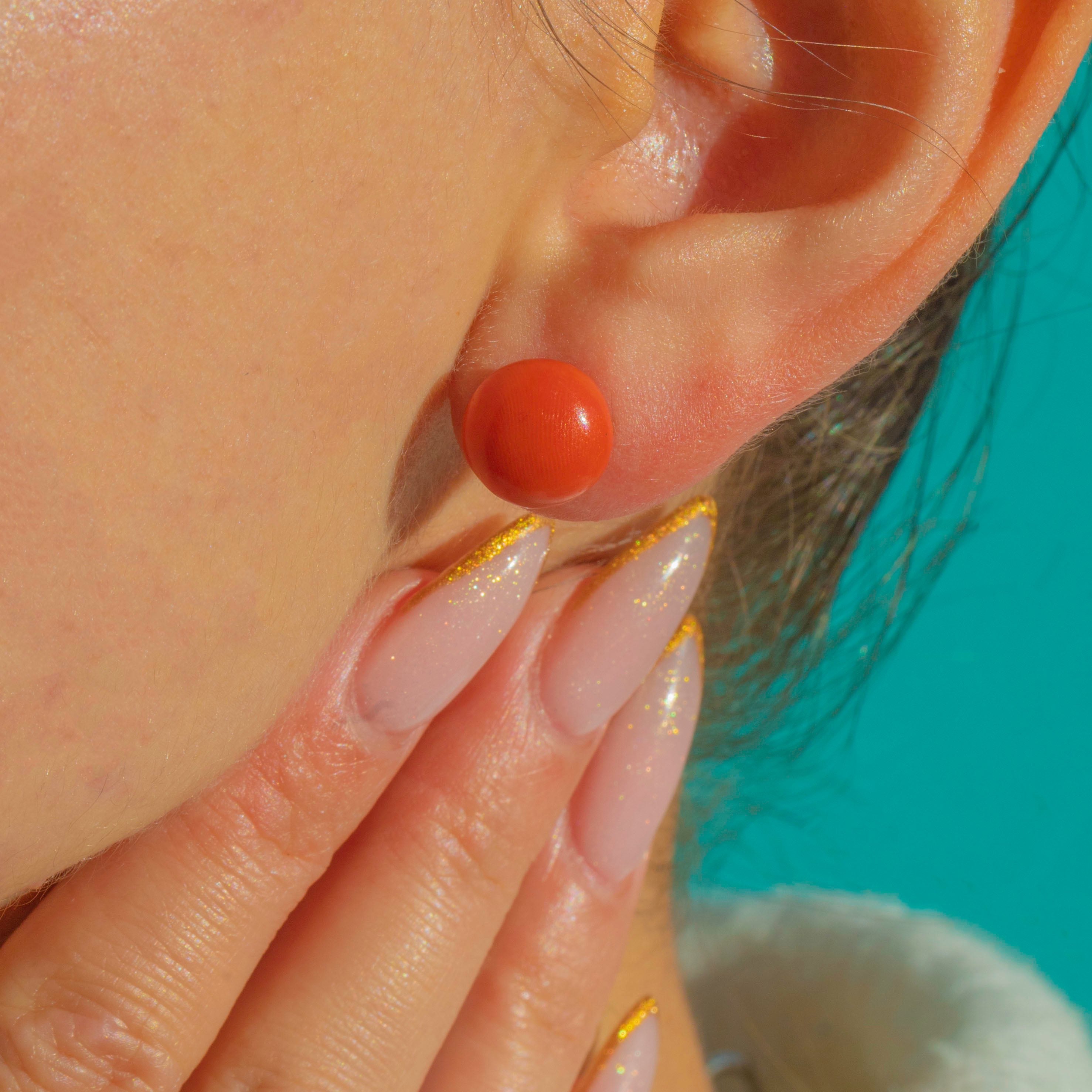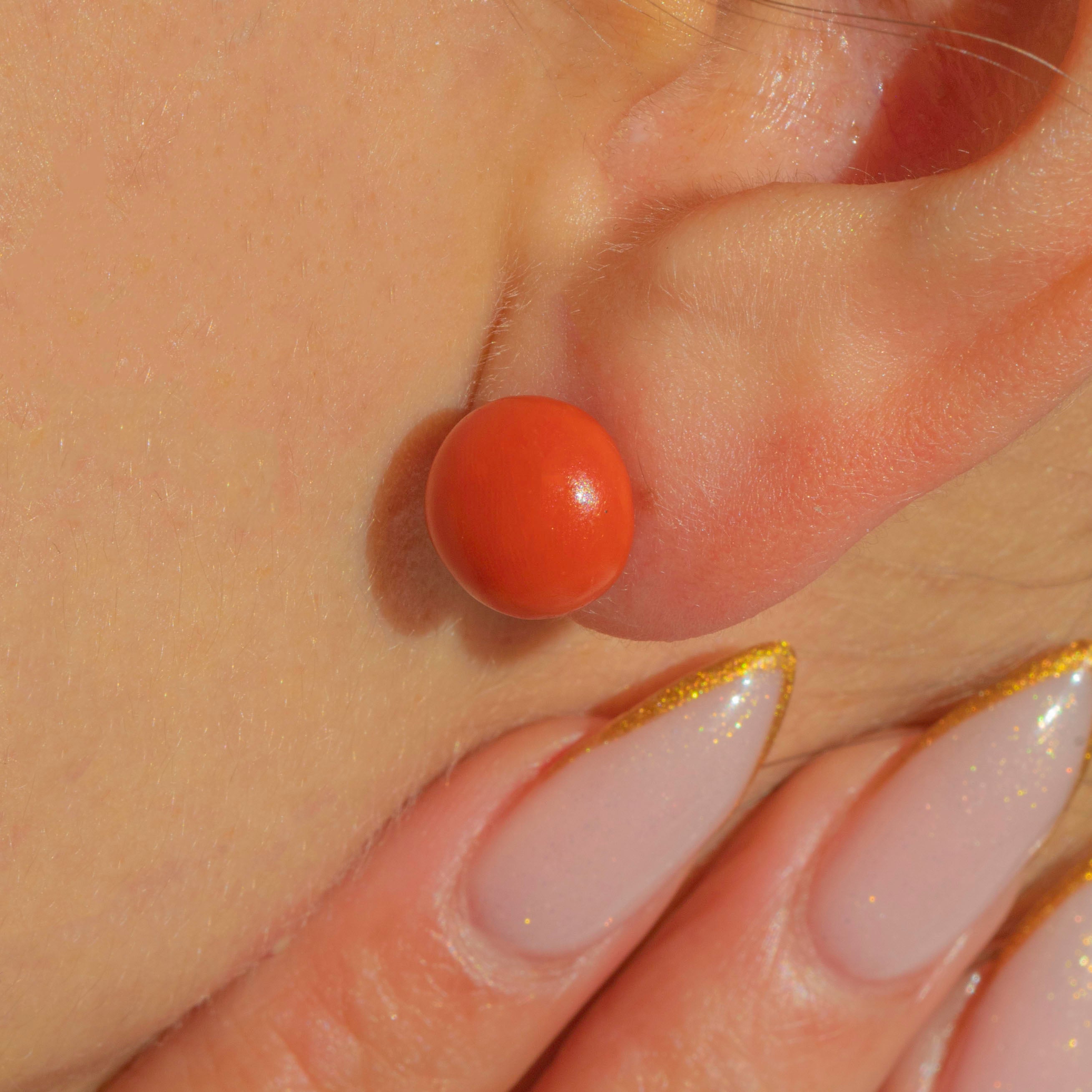 These antique Coral button earrings are effortless little bursts of colour for every day. Each earring is set with a smooth, softly domed Coral cabochon whose rich orange hue glows beautifully against the skin, bringing instant warmth to any look.
