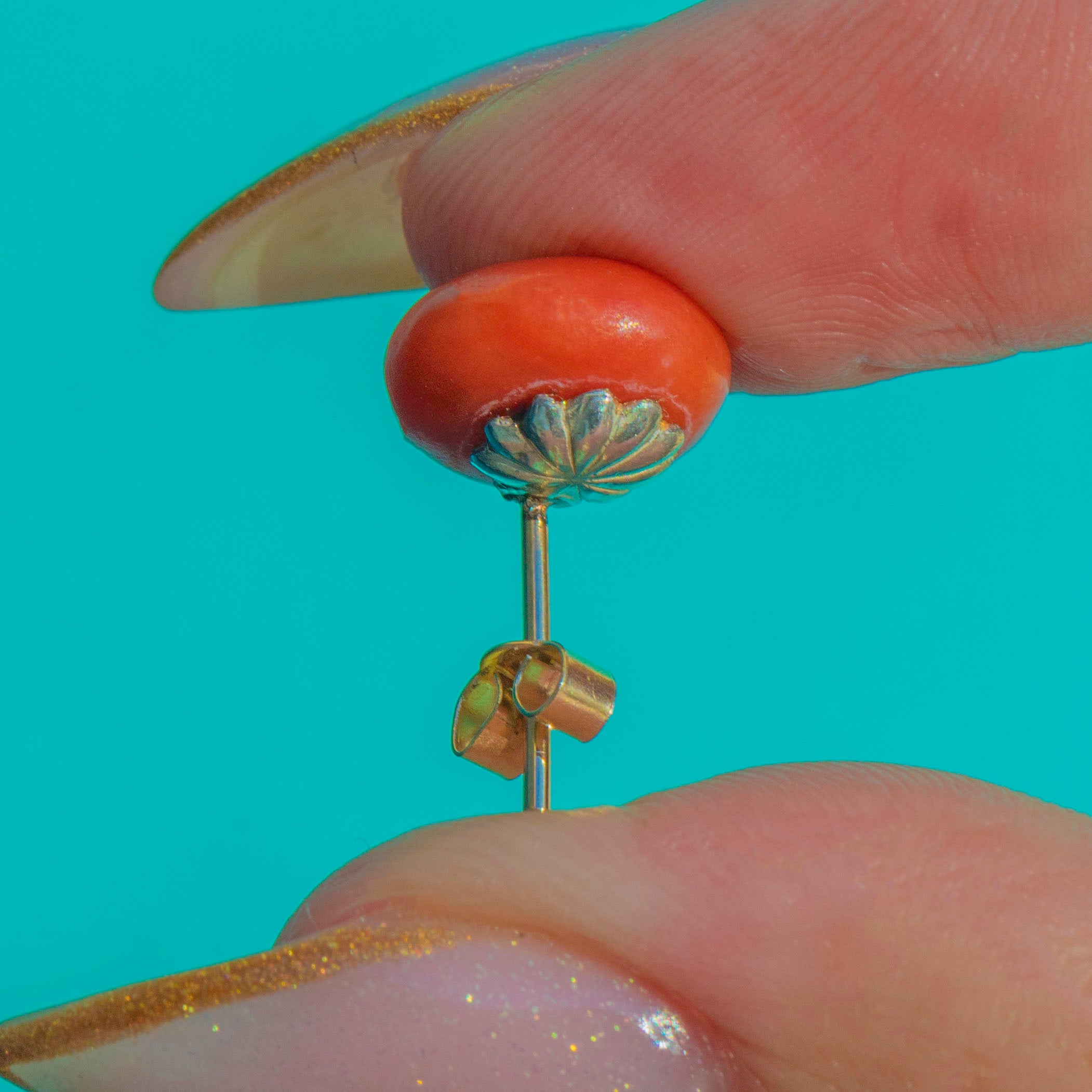 EXCELLENT: The Coral cabochons are smooth and lustrous with no notable chips or cracks, retaining a lovely even colour. The Gold settings and fittings are secure with only light surface wear commensurate with age. These earrings have clearly been well cared for and are ready to wear and enjoy.