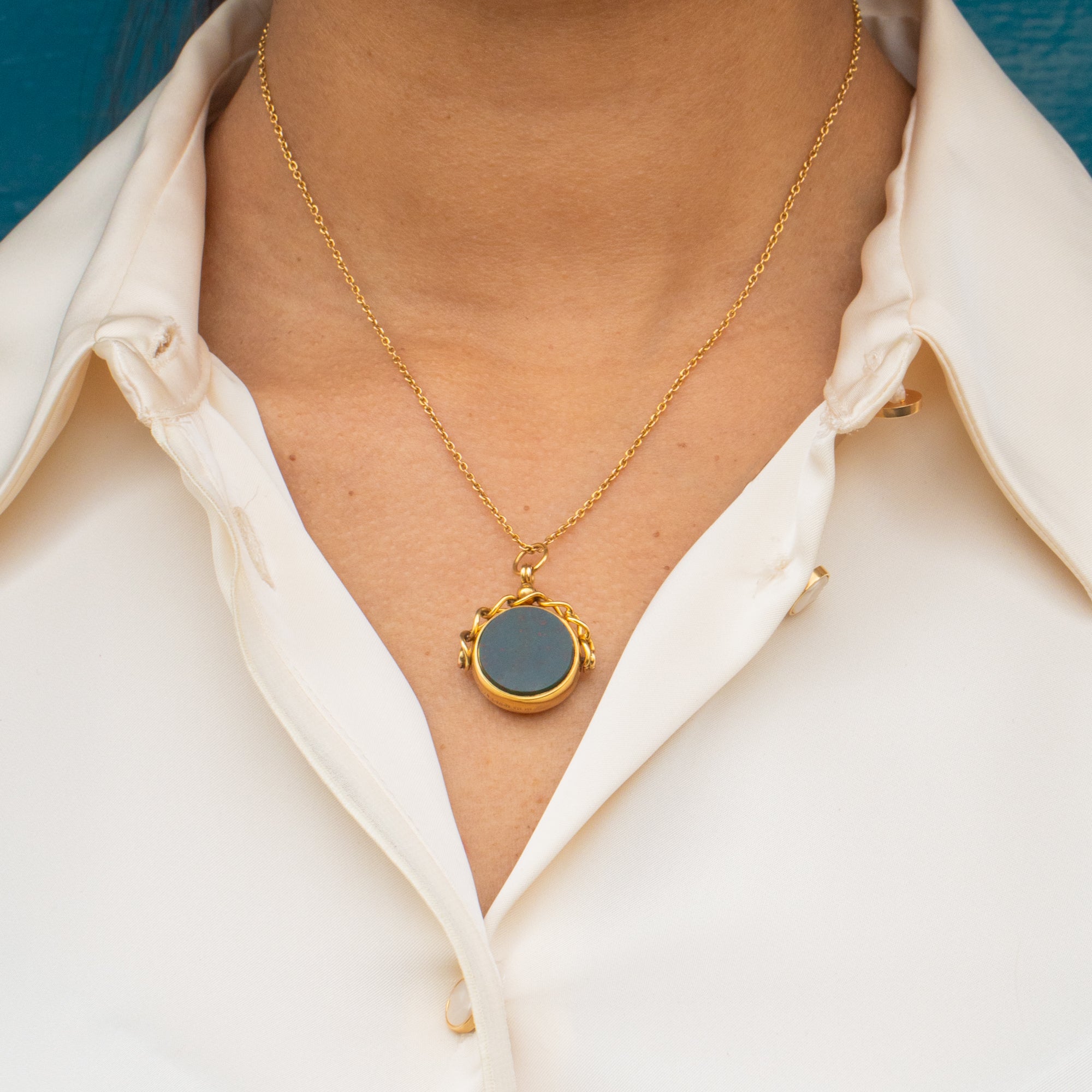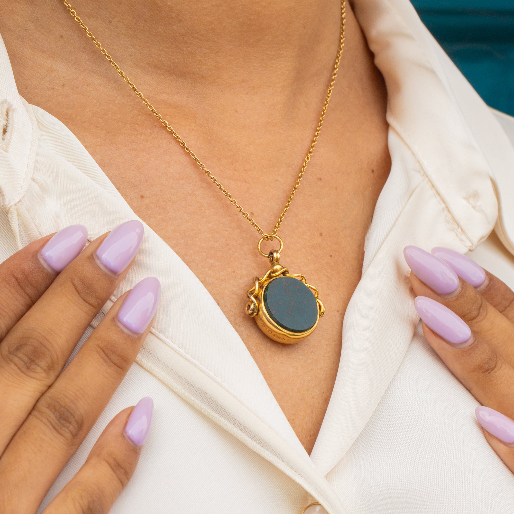 This antique 9ct Gold Carnelian Bloodstone swivel fob pendant is an Edwardian delight. Inlaid with a smooth wine red Carnelian and a gorgeous Bloodstone, this piece has a full set of hallmarks dating to 1900, so she's a true antique treasure!