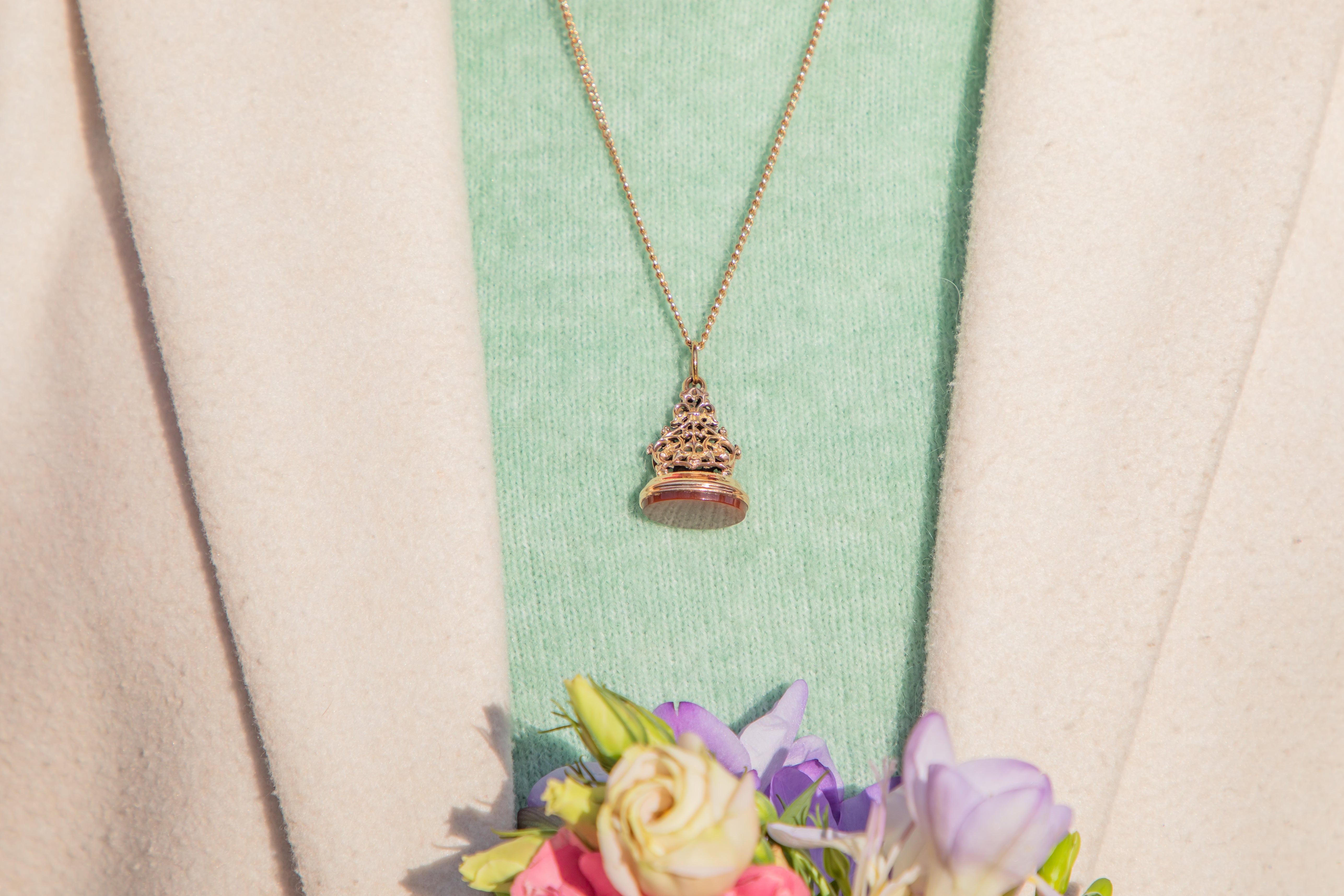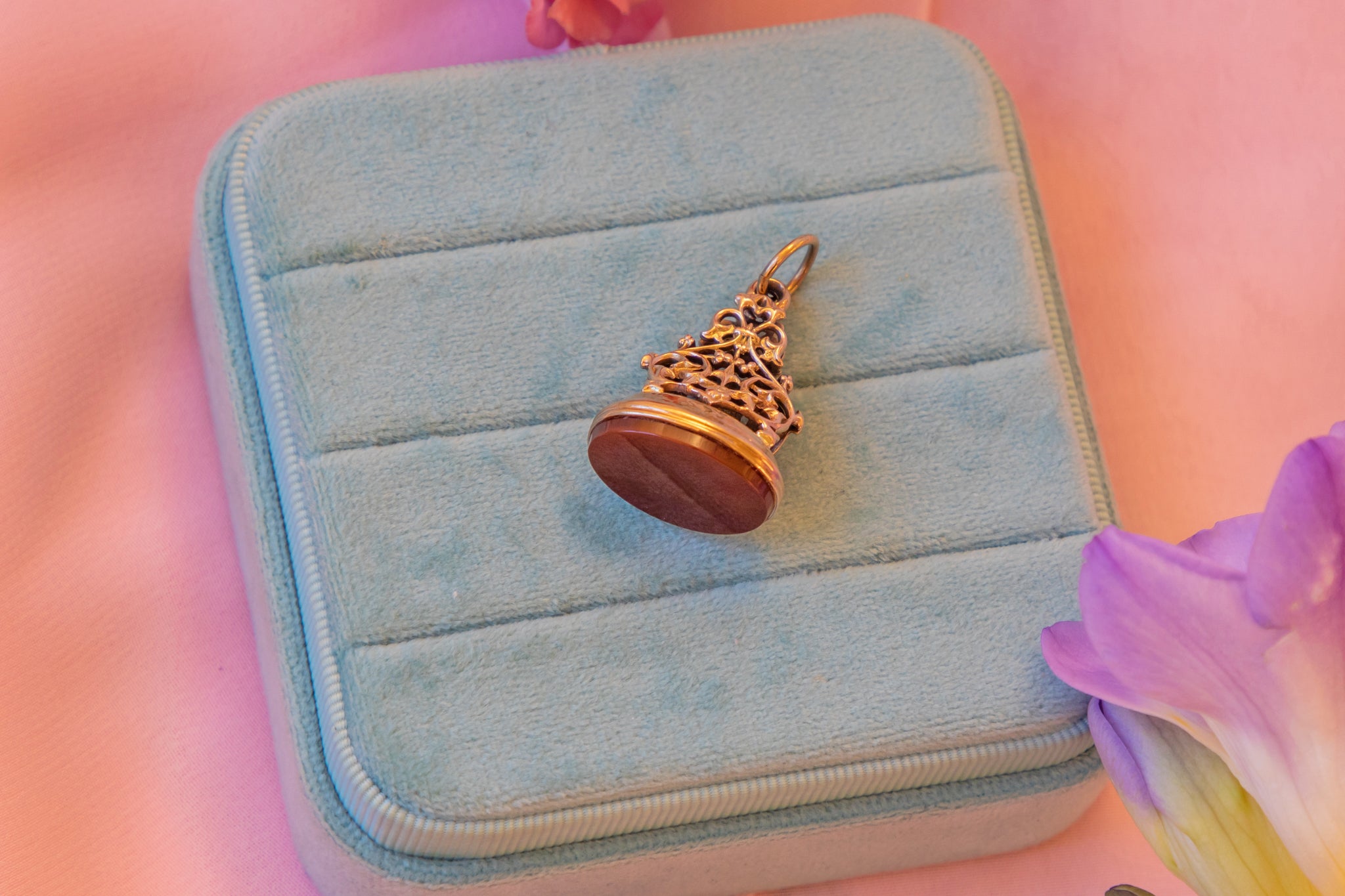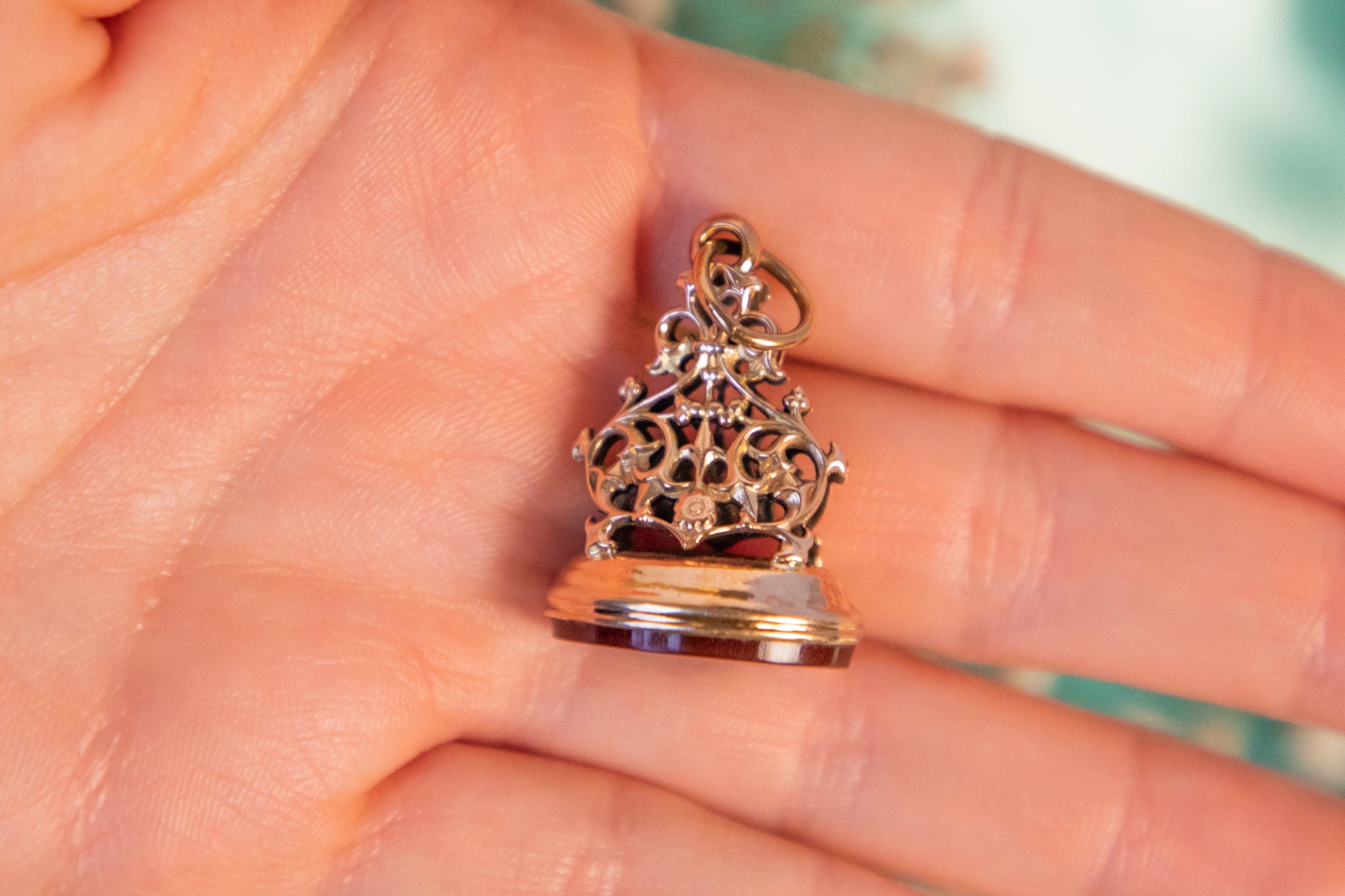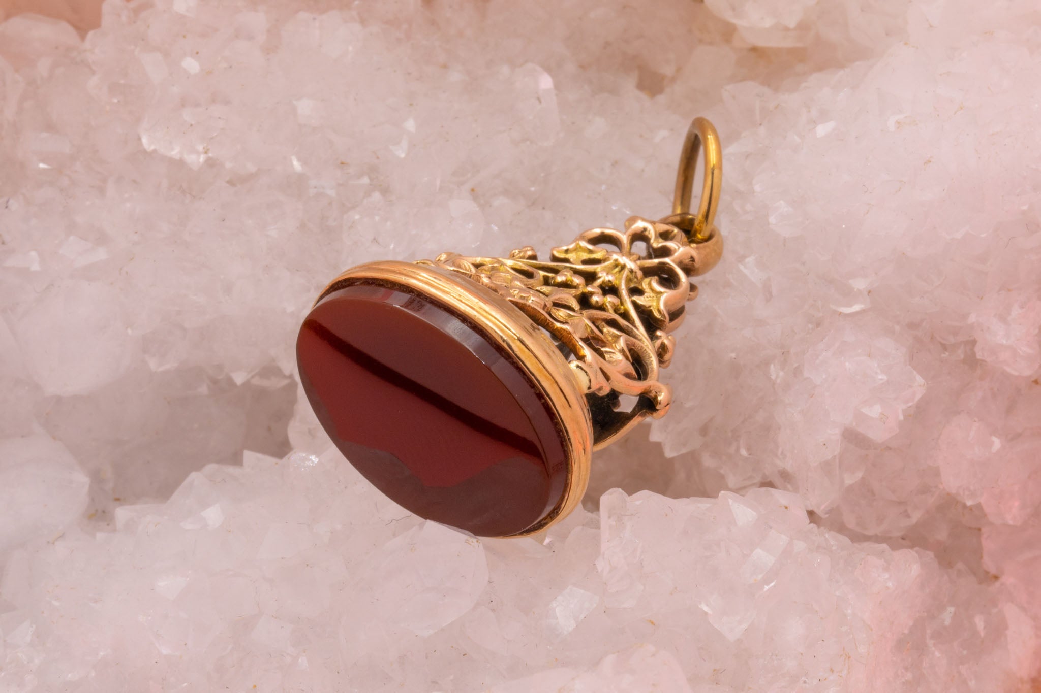 We adore this 9ct Gold Carnelian fob seal pendant! This beauty has the most divine display of Gold openwork, with a stunning pillar inspired by nature which draws your eye in.