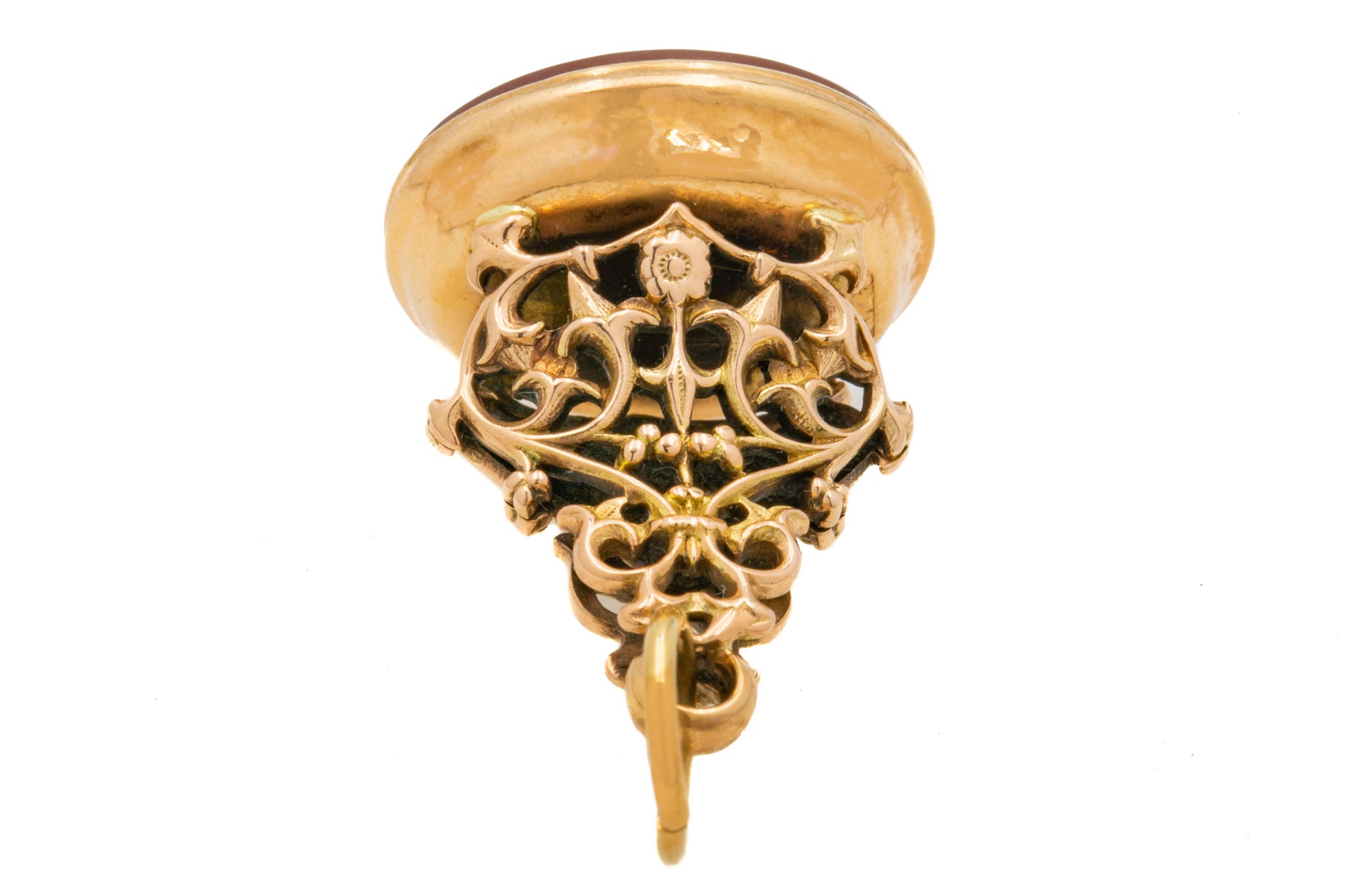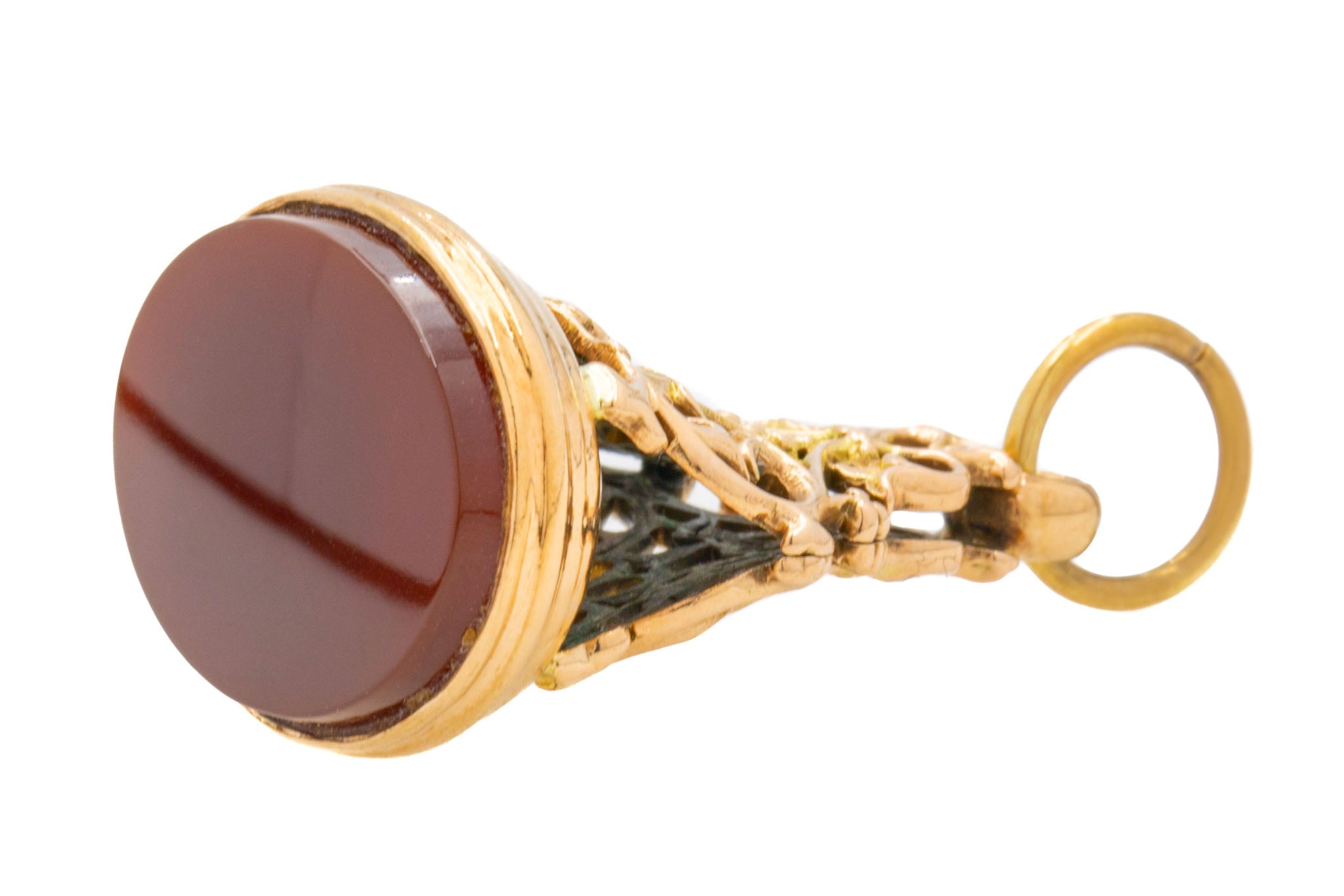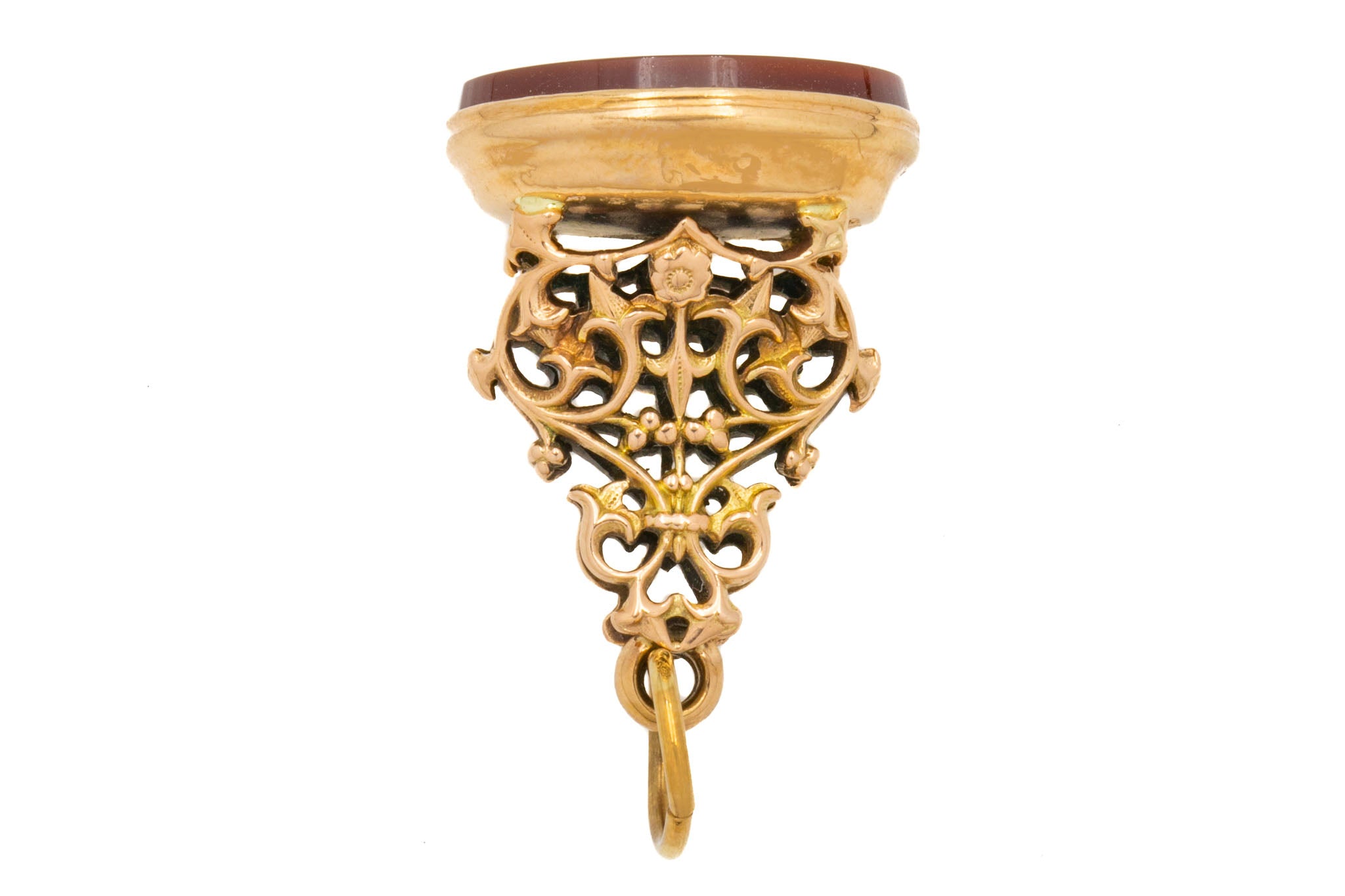 EXCELLENT. This antique 9ct Gold Carnelian fob seal pendant is in excellent condition. The Carnelian is smooth and securely set in place, free from any chips or surface wear. The Gold is buttery and smooth, and the Gold open work is stunning, having maintained all of its structural integrity over the course of its life. There is very minimal wear to note, she's a lovely piece of Victorian jewellery.