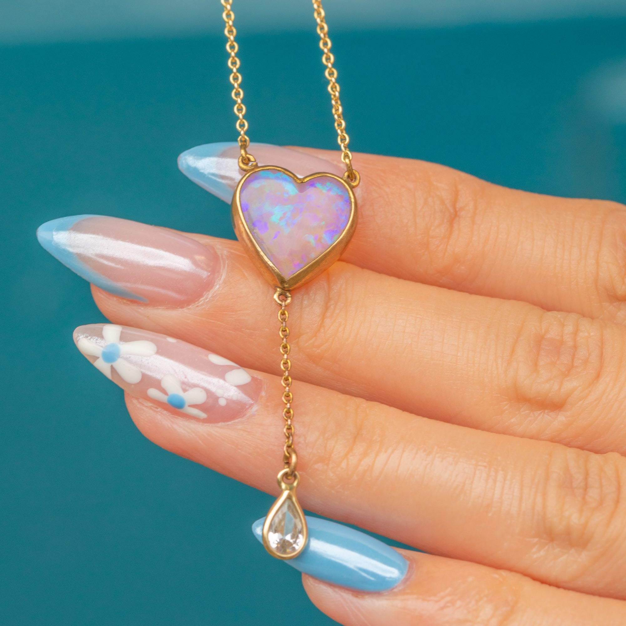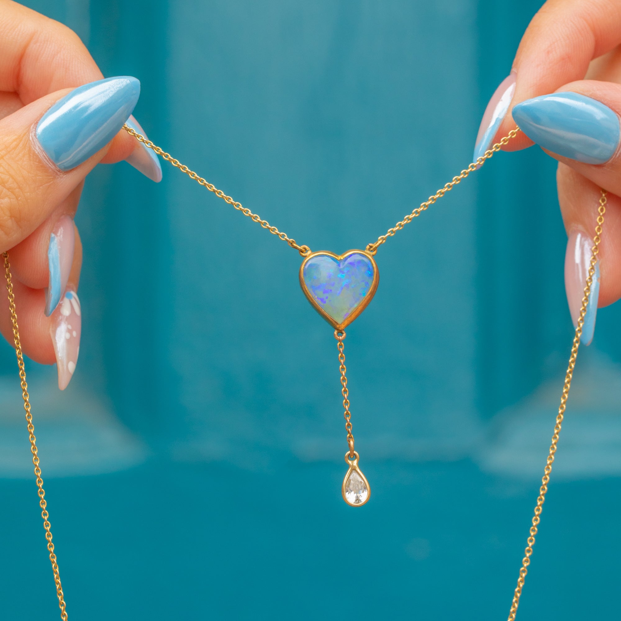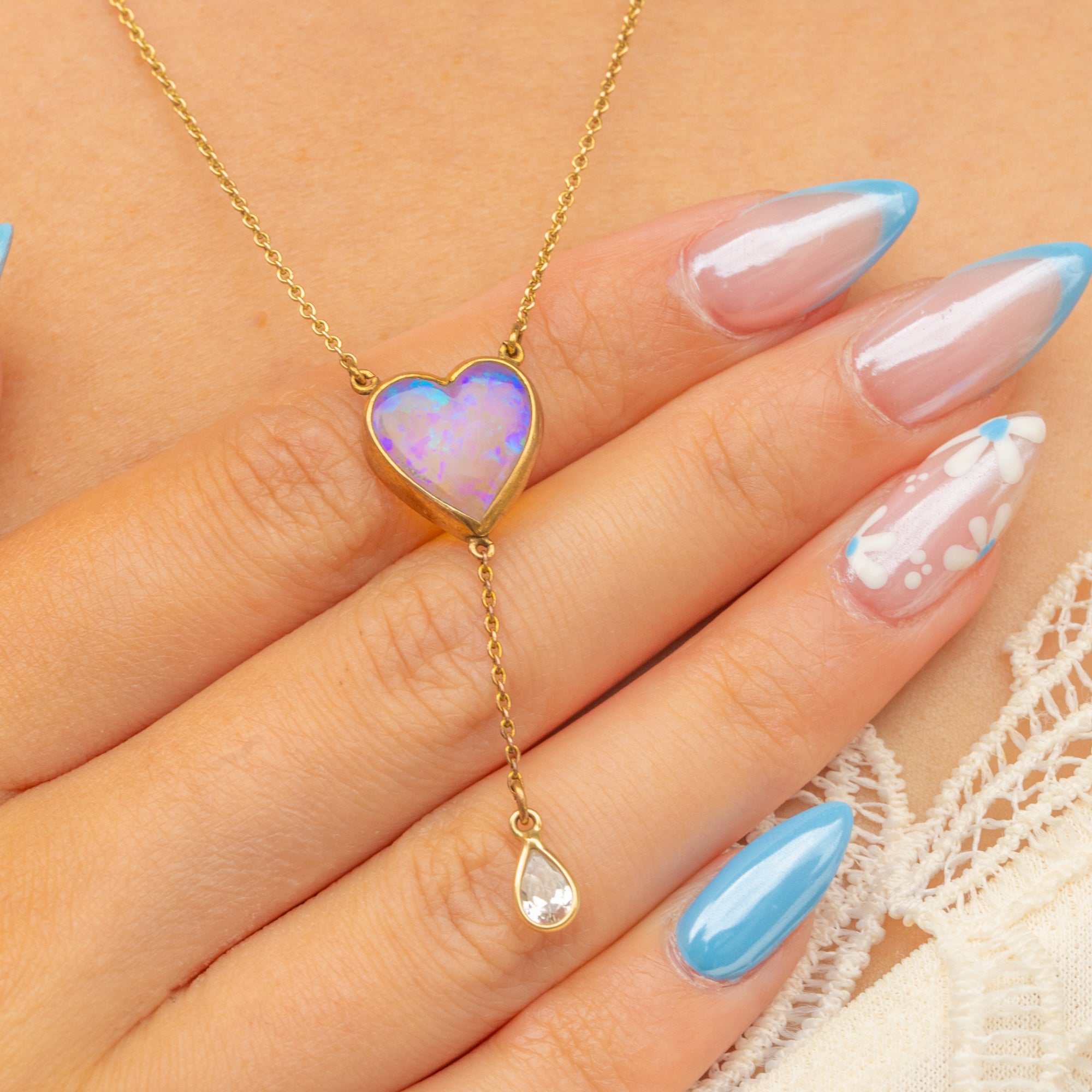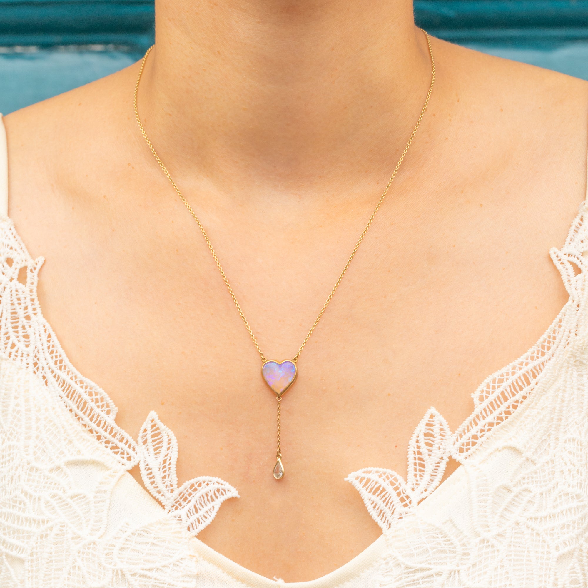 A pretty antique 9ct Gold cased necklace, with an eye-catching heart-shaped Opal cabochon and Diamond Paste drop that rests beautifully against the décolletage.