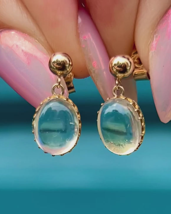 Clasped tightly in luxurious 9ct Gold settings, the exquisite antique 2.10ct Moonstones sway gently just below the earlobe. A luminous silver adularescence glows from the Moonstones as they catch the light, like a speck of magic caught beneath each surface!