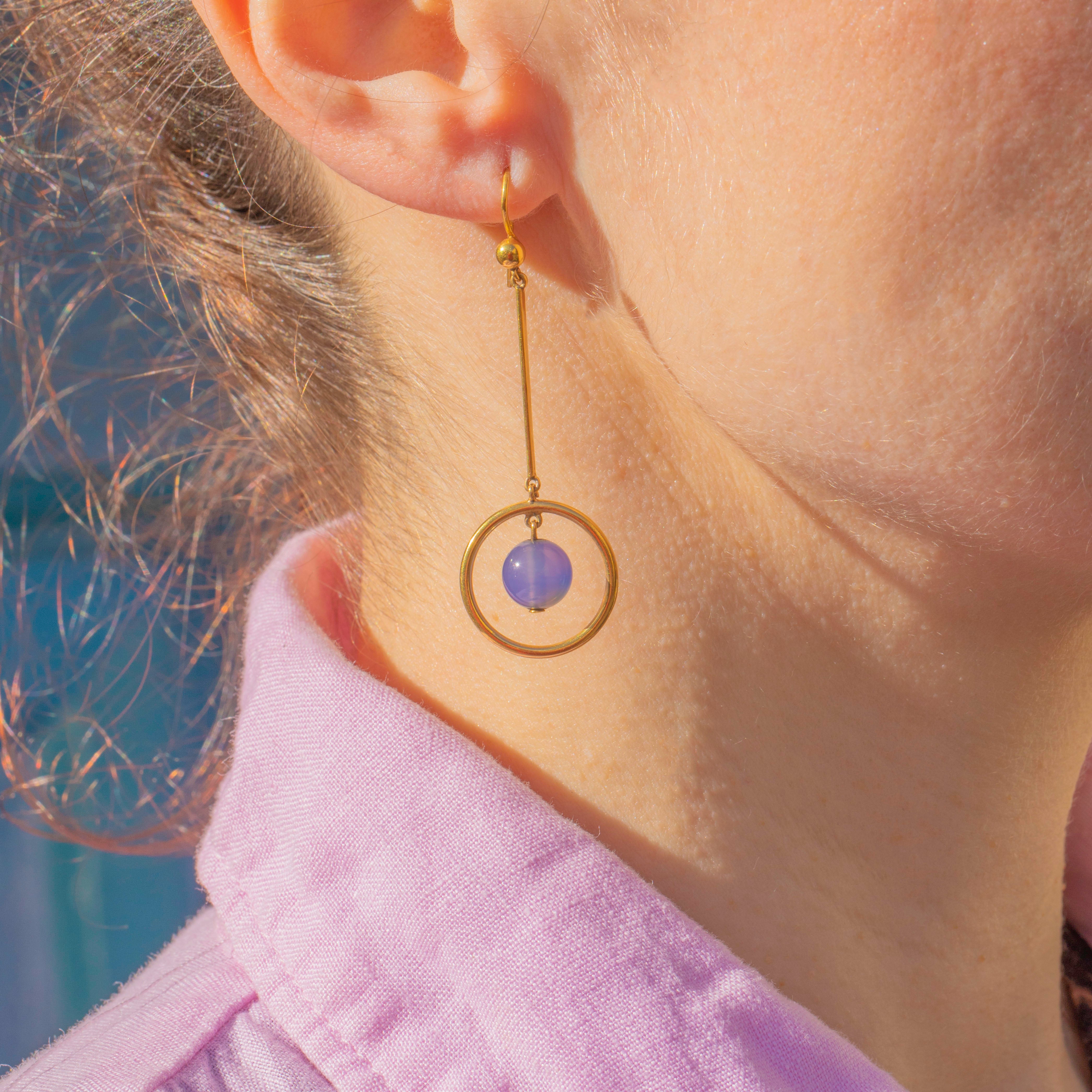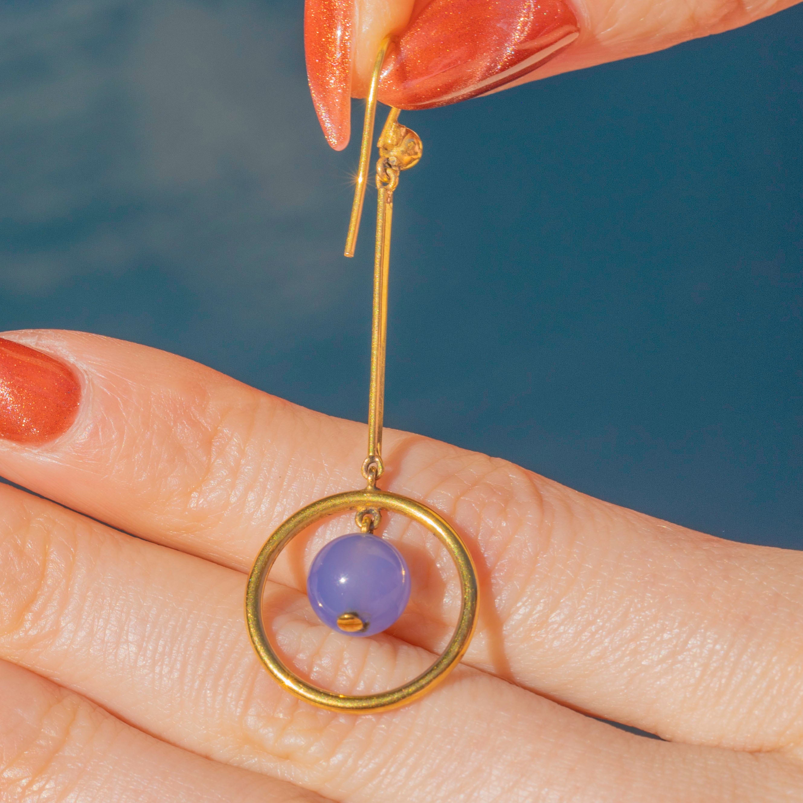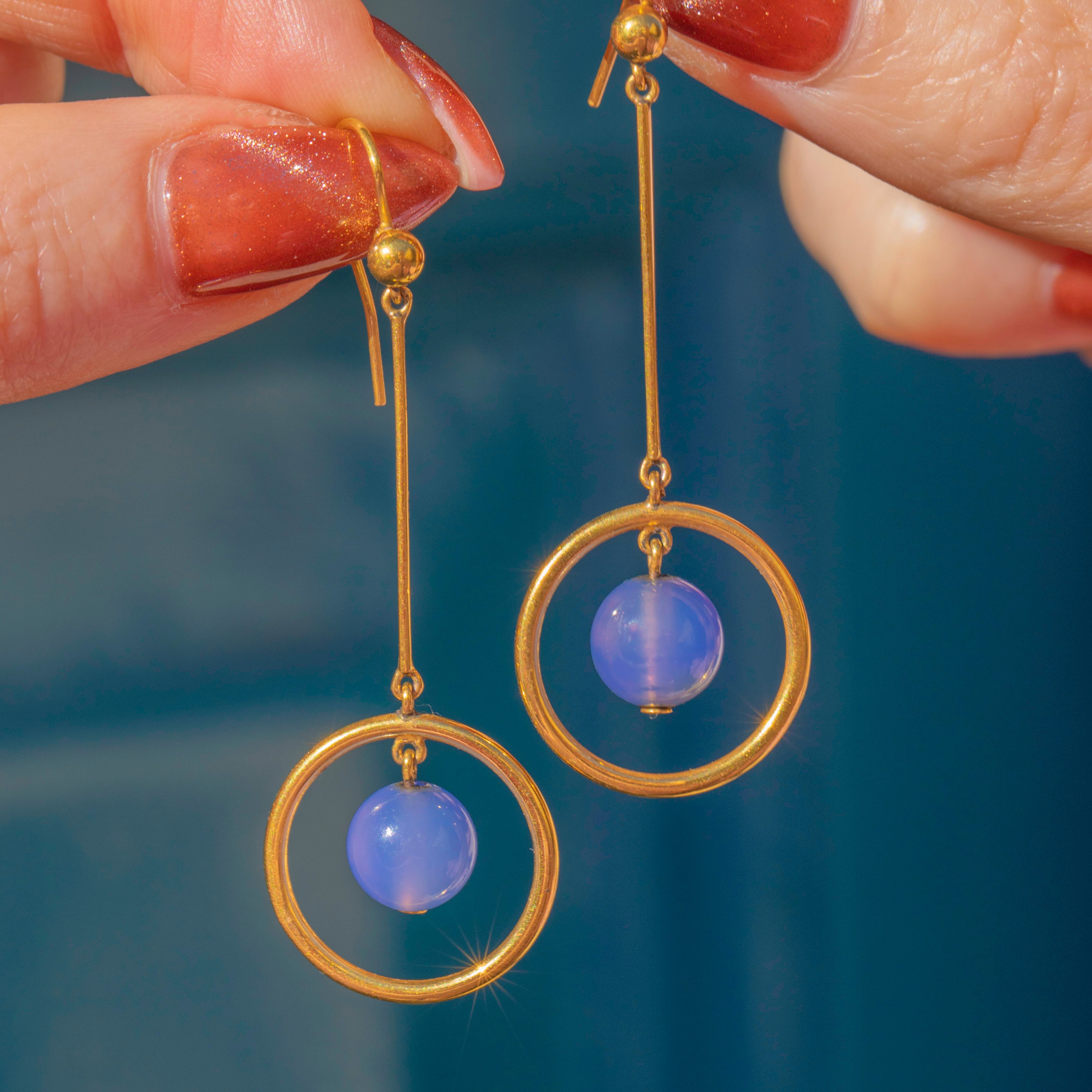 The smoothly cut Chalcedony spheres have a delightful periwinkle hue, perfectly complemented by the saturated Gold to create a stand-out pair of Victorian earrings! Each section is articulated, providing a lovely movement, and the earrings fall perfectly along the jawline, elegantly framing the face.