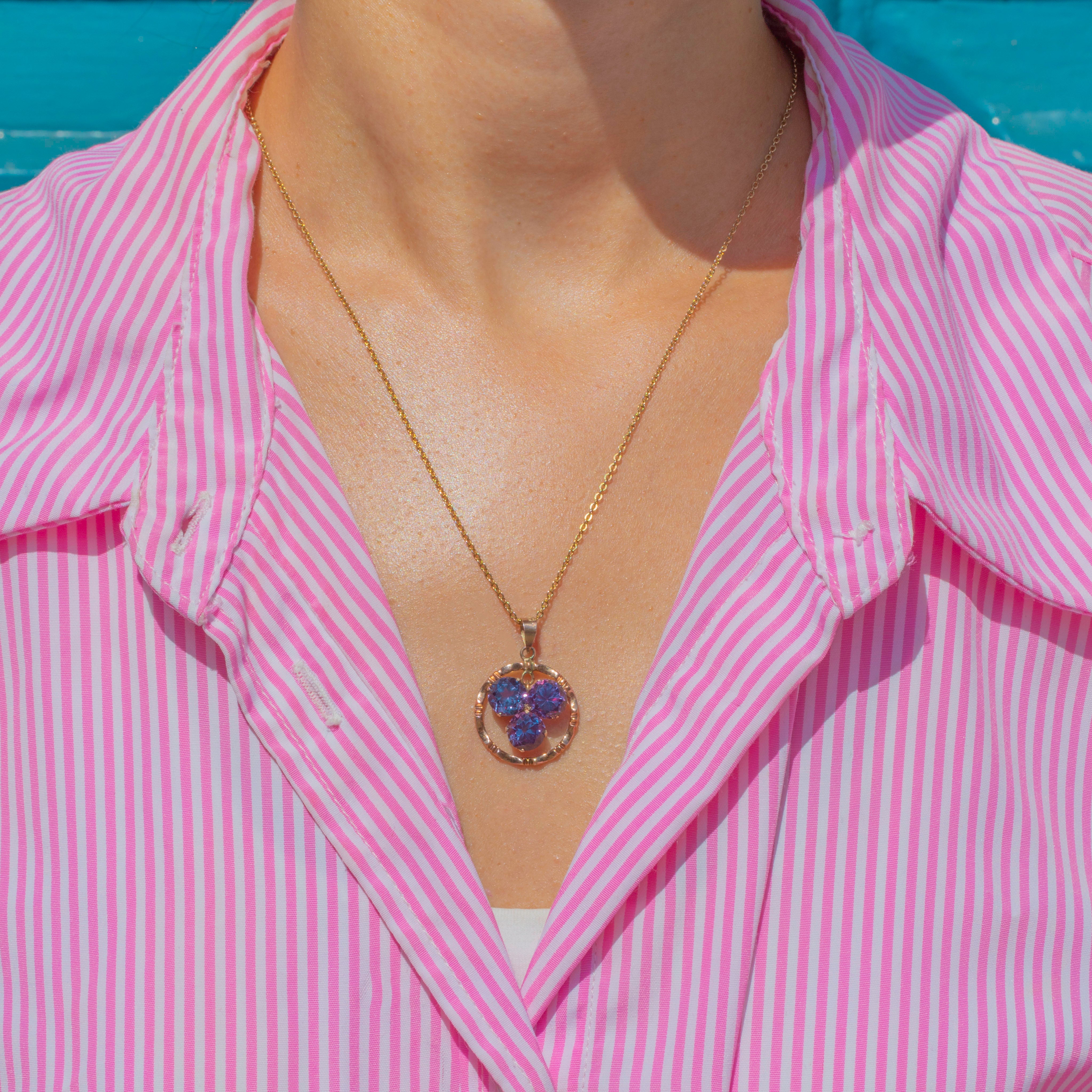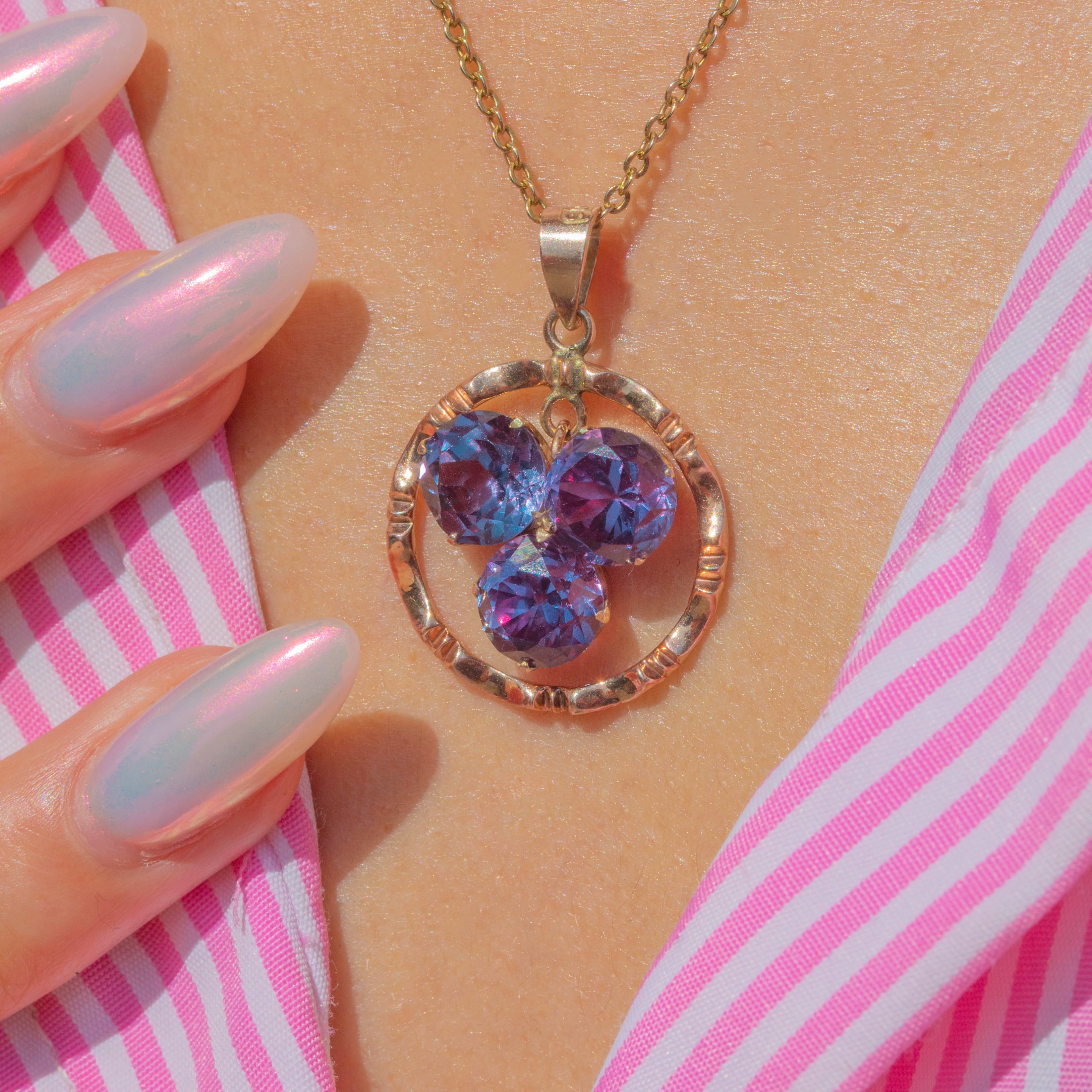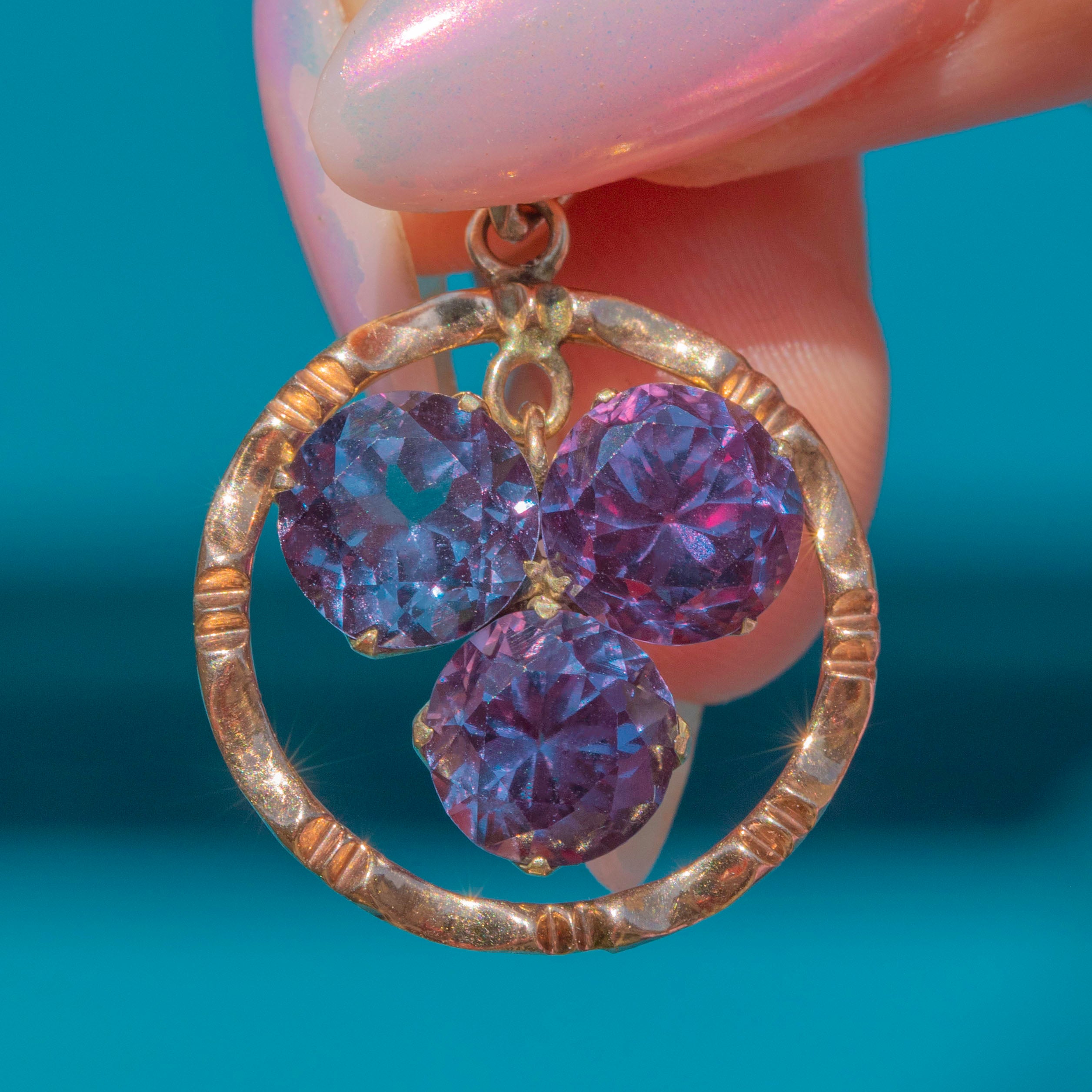 This Edwardian shamrock pendant suspends three resplendent colour-changing synthetic Sapphires, boasting 7.30ct combined. Each faceted Sapphire is a saturated blue-purple that transforms into a gorgeous teal as it catches the light.
