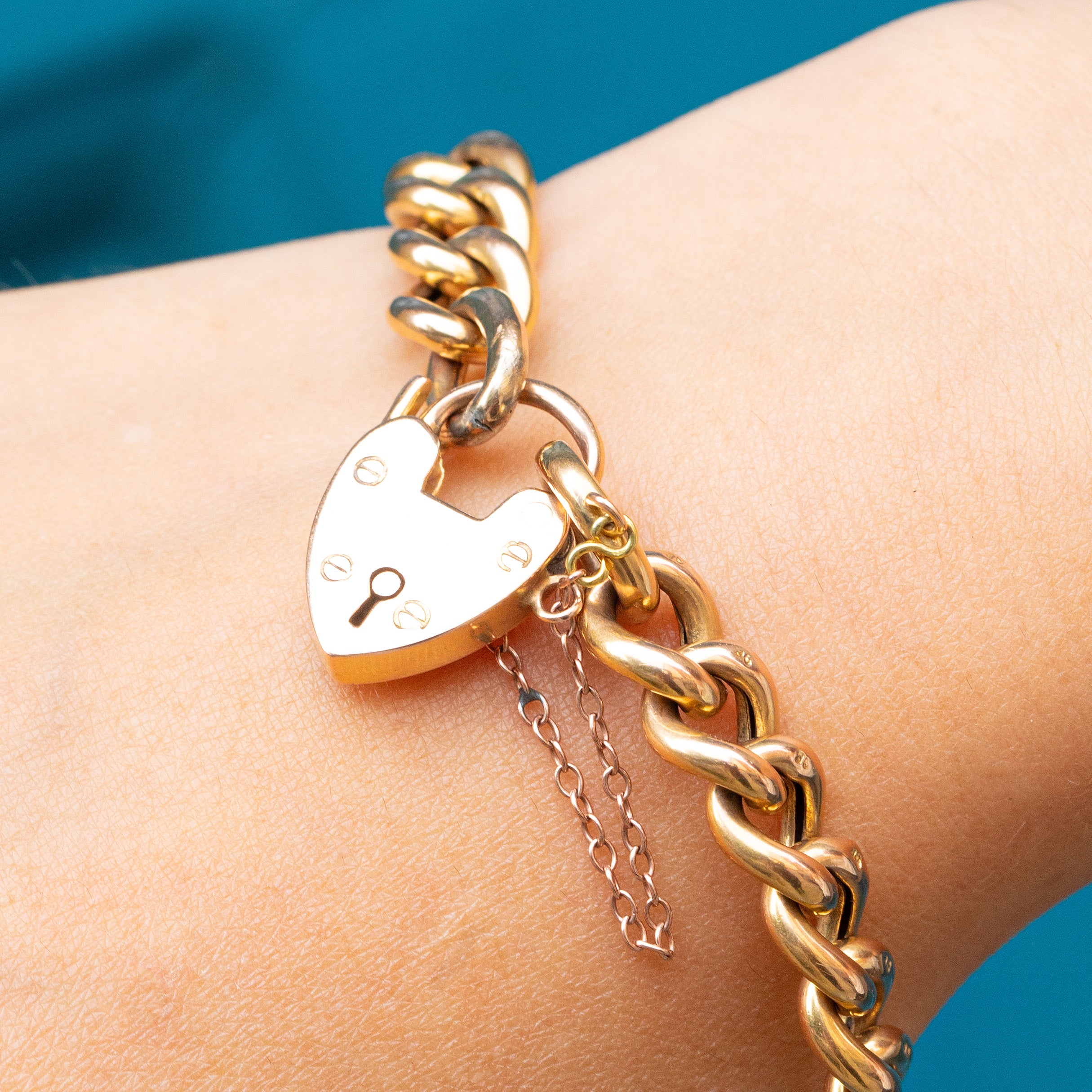 Antique 9ct Gold Curb Link Bracelet with Heart Padlock
