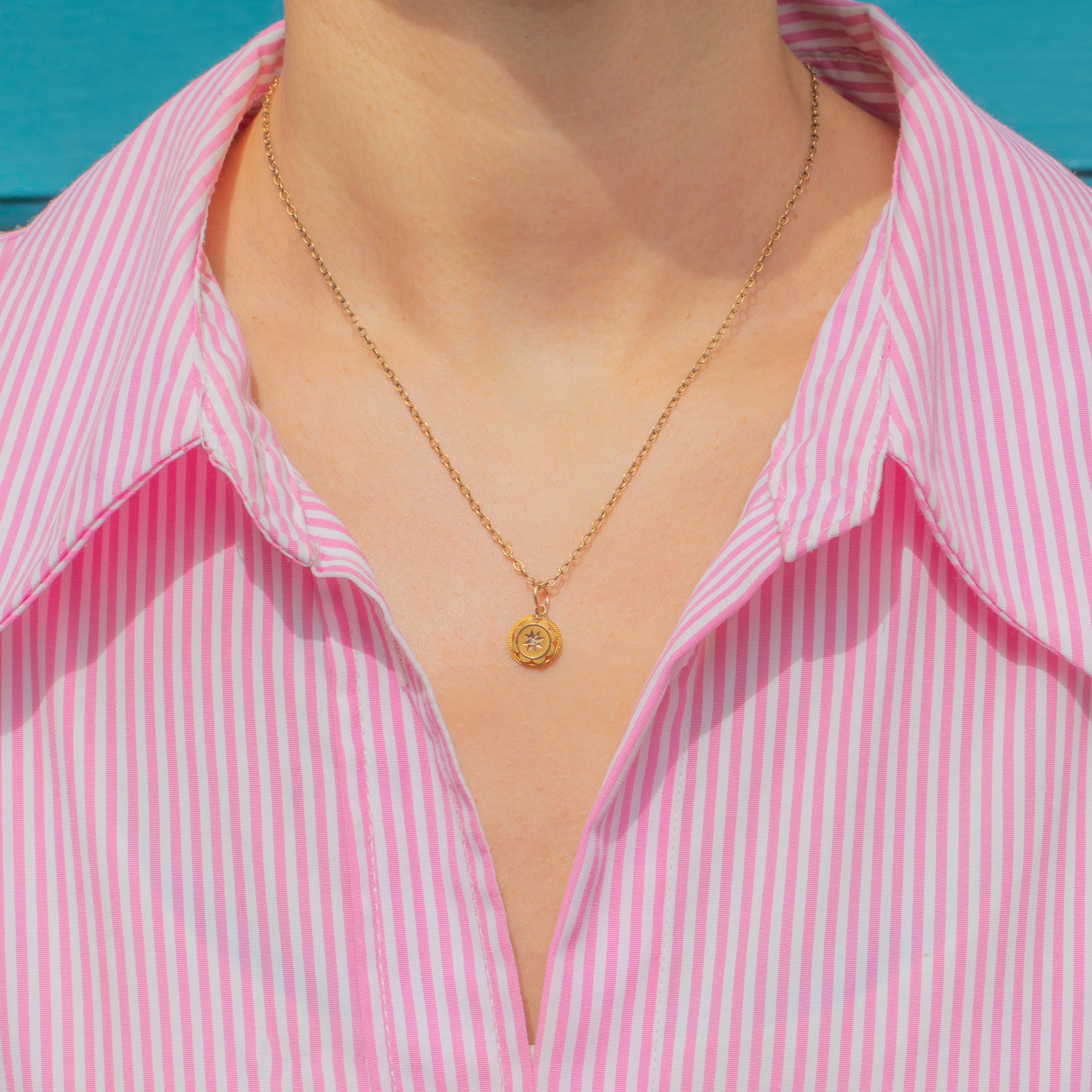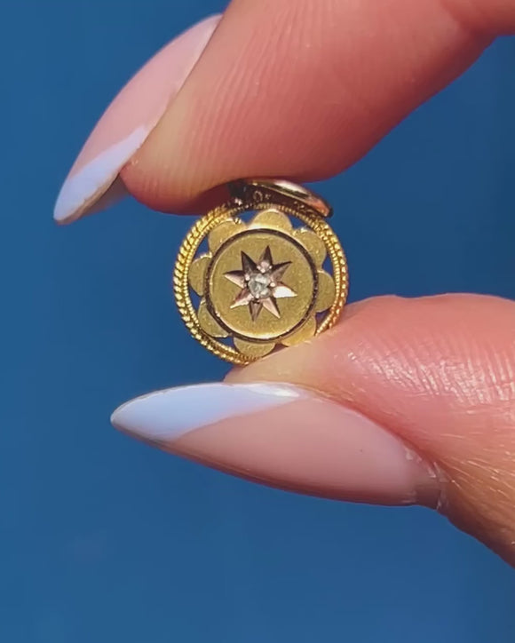 Crafted from buttery 9ct Gold, this antique charm is crafted into a dainty floral motif and adorned with a scintillating rose-cut Diamond in her centre. The Diamond is displayed within bold star settings, adding a touch of celestial charm.