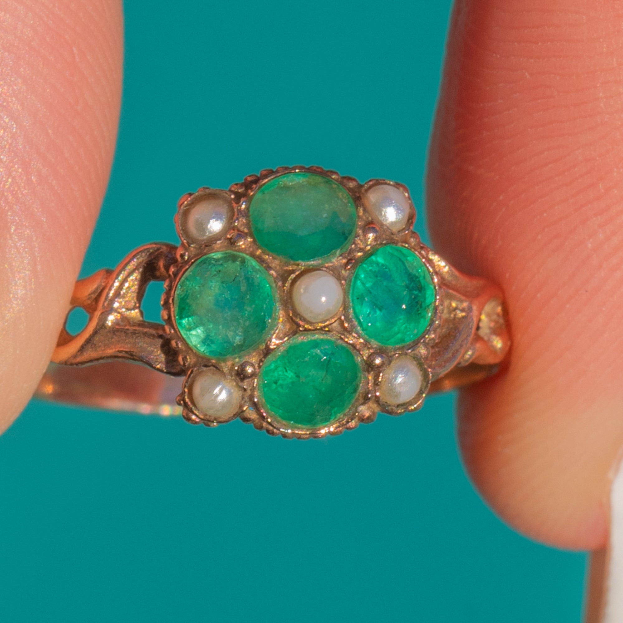 This charming Victorian Emerald and Pearl cluster ring is full of colour, character, and classic 19th-century elegance. Crafted in warm 9ct Gold, the rounded cluster is set with four vibrant green Emeralds accented by delicate Pearls, creating a soft and romantic antique glow.