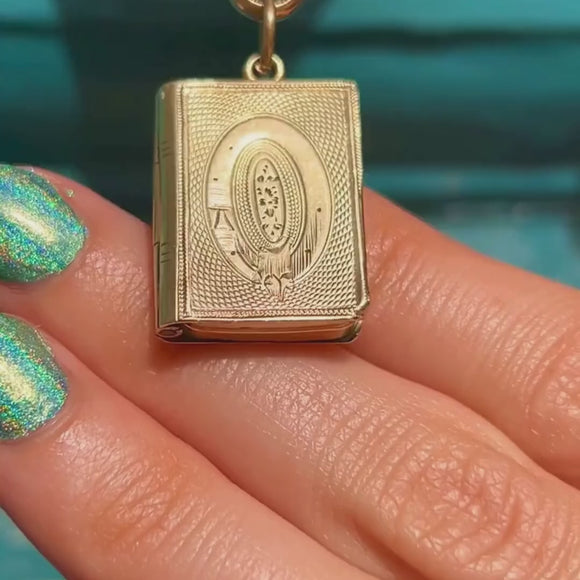 We are obsessed with this antique 9ct Gold engraved book locket! Enriched with Victorian sentiment, this antique locket is crafted from buttery 9ct Gold forming her spirograph like detailing encased into the style of a miniture book.