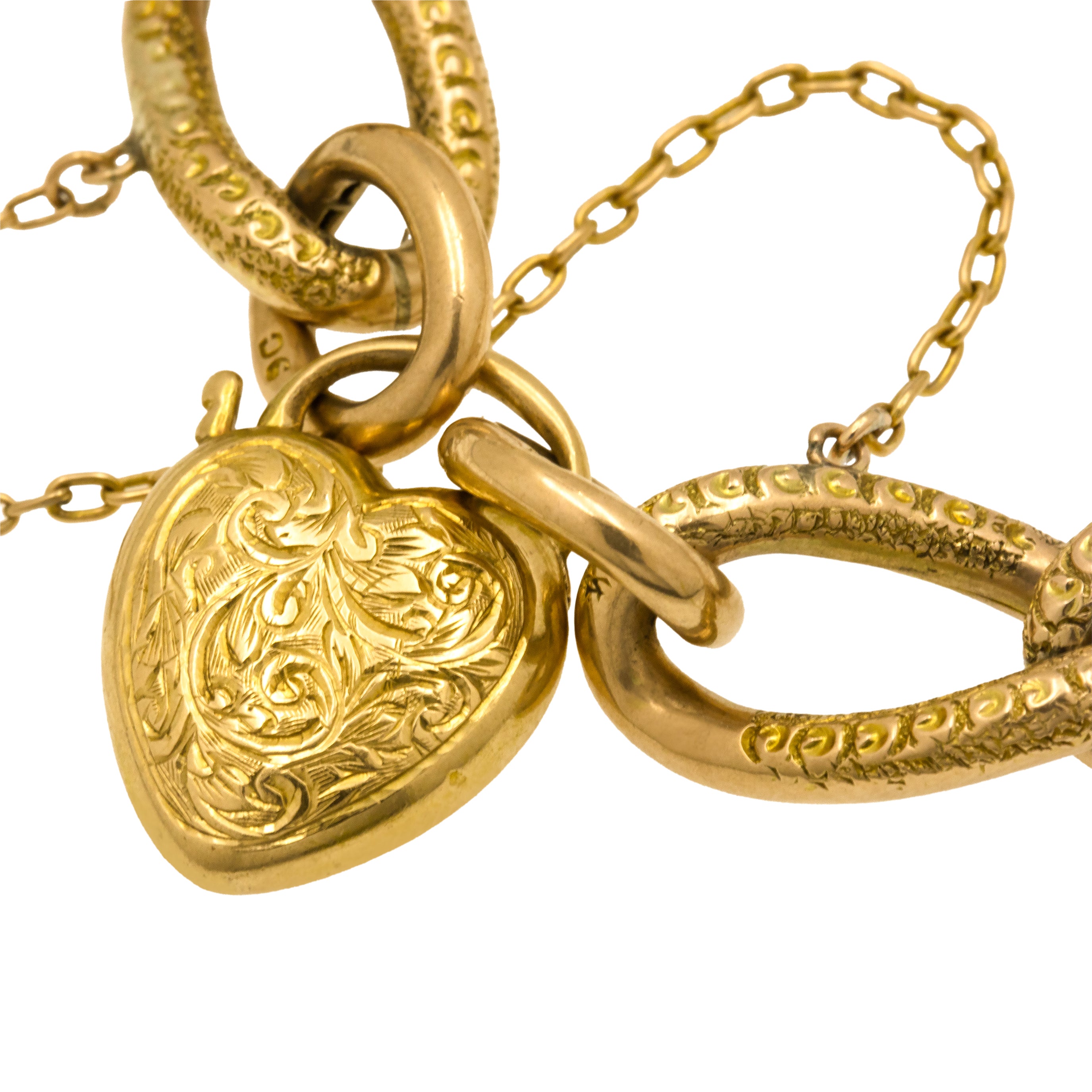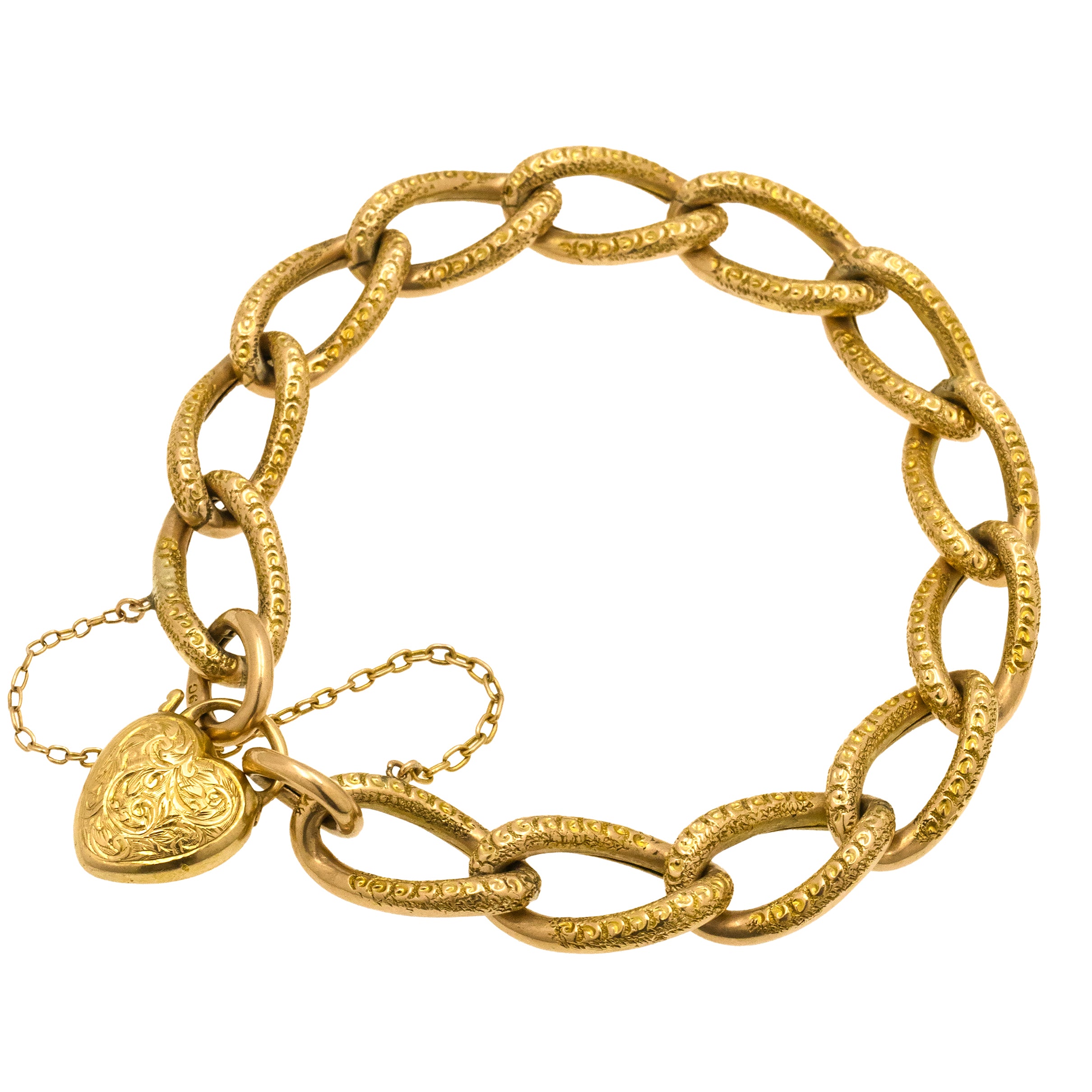 Antique 9ct Gold Engraved Curb Link Bracelet with Engraved Heart Padlock