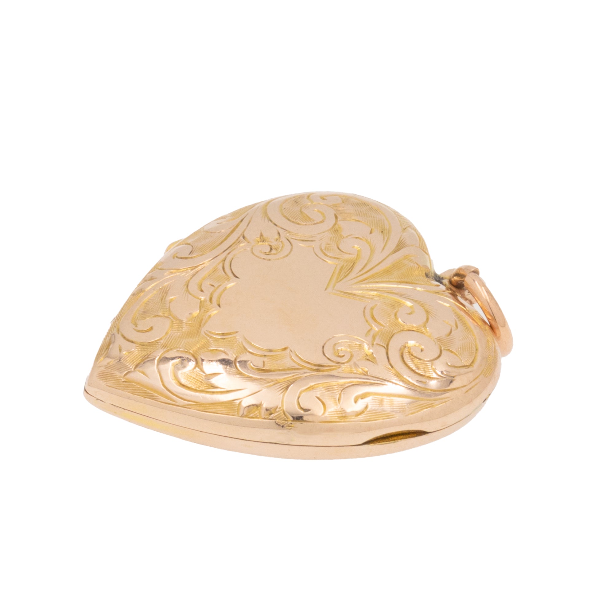 VERY GOOD. This antique 9ct Gold engraved heart locket is in very good condition. The engravings are crisp and her hinge mechanism and lock are in perfect working order, keeping her contents safely inside. There are some subtle scratch marks on the inside, with some darkening to the edge, but this does not detract from the overall beauty of the piece. With one frame perfectly fitting, she has space to hold a cherished photograph inside!
