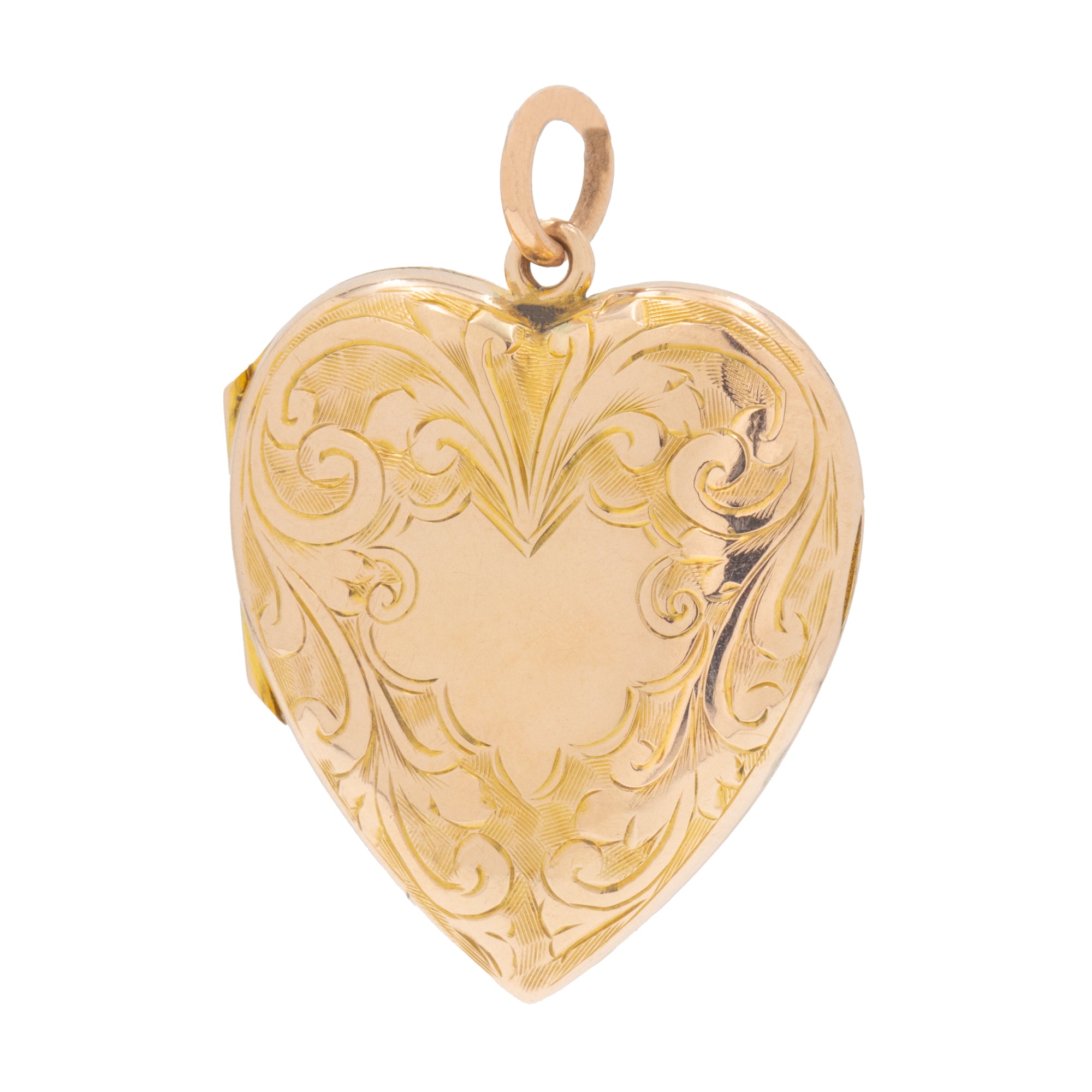 VERY GOOD. This antique 9ct Gold engraved heart locket is in very good condition. The engravings are crisp and her hinge mechanism and lock are in perfect working order, keeping her contents safely inside. There are some subtle scratch marks on the inside, with some darkening to the edge, but this does not detract from the overall beauty of the piece. With one frame perfectly fitting, she has space to hold a cherished photograph inside!