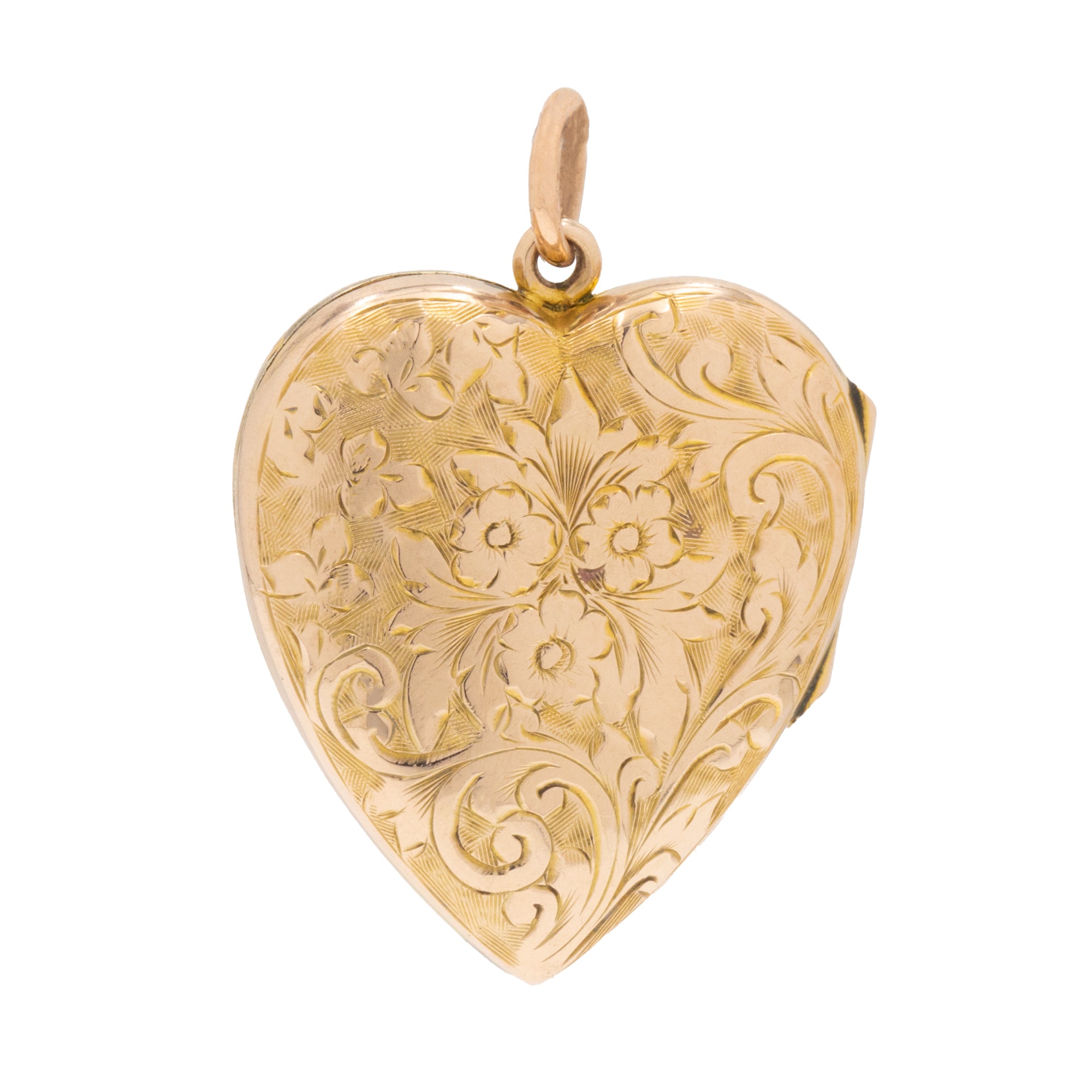 VERY GOOD. This antique 9ct Gold engraved heart locket is in very good condition. The engravings are crisp and her hinge mechanism and lock are in perfect working order, keeping her contents safely inside. There are some subtle scratch marks on the inside, with some darkening to the edge, but this does not detract from the overall beauty of the piece. With one frame perfectly fitting, she has space to hold a cherished photograph inside!