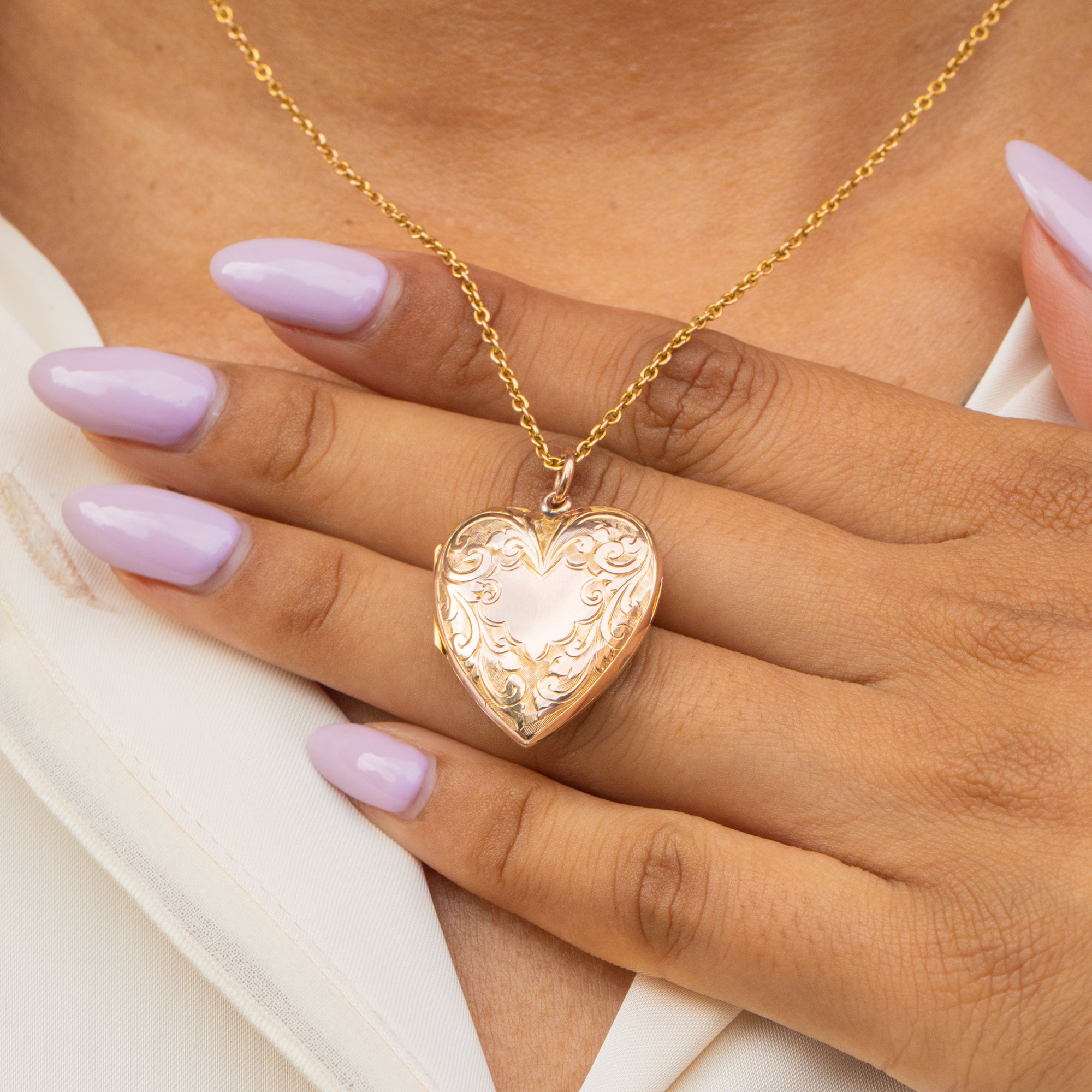 Crafted from gleaming 9ct Gold, her front presents the opportunity for personalised engravings with a blank cartouche at the centre. Nothing says romance more than this Victorian heart locket if you're looking for a gift for your other half!