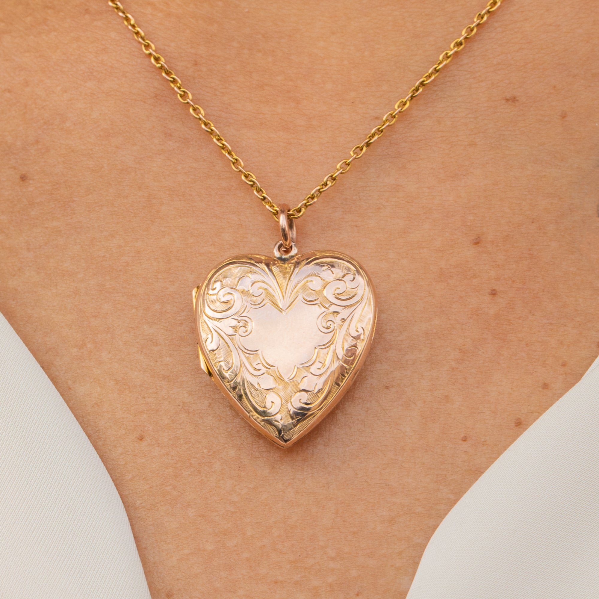VERY GOOD. This antique 9ct Gold engraved heart locket is in very good condition. The engravings are crisp and her hinge mechanism and lock are in perfect working order, keeping her contents safely inside. There are some subtle scratch marks on the inside, with some darkening to the edge, but this does not detract from the overall beauty of the piece. With one frame perfectly fitting, she has space to hold a cherished photograph inside!