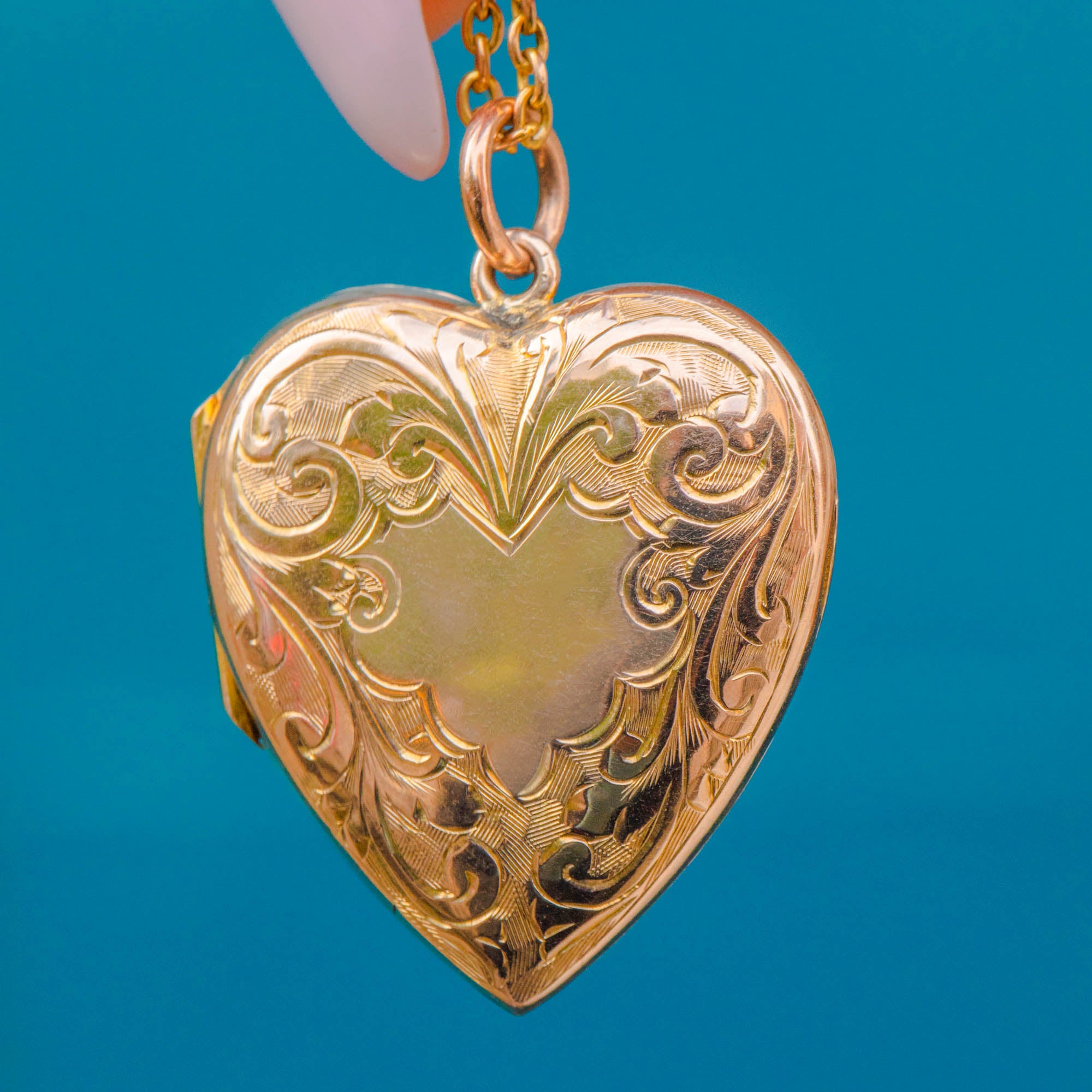 VERY GOOD. This antique 9ct Gold engraved heart locket is in very good condition. The engravings are crisp and her hinge mechanism and lock are in perfect working order, keeping her contents safely inside. There are some subtle scratch marks on the inside, with some darkening to the edge, but this does not detract from the overall beauty of the piece. With one frame perfectly fitting, she has space to hold a cherished photograph inside!