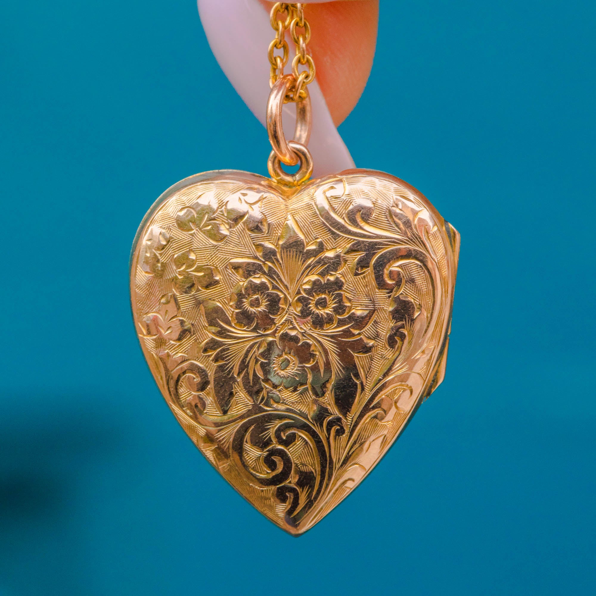 VERY GOOD. This antique 9ct Gold engraved heart locket is in very good condition. The engravings are crisp and her hinge mechanism and lock are in perfect working order, keeping her contents safely inside. There are some subtle scratch marks on the inside, with some darkening to the edge, but this does not detract from the overall beauty of the piece. With one frame perfectly fitting, she has space to hold a cherished photograph inside!