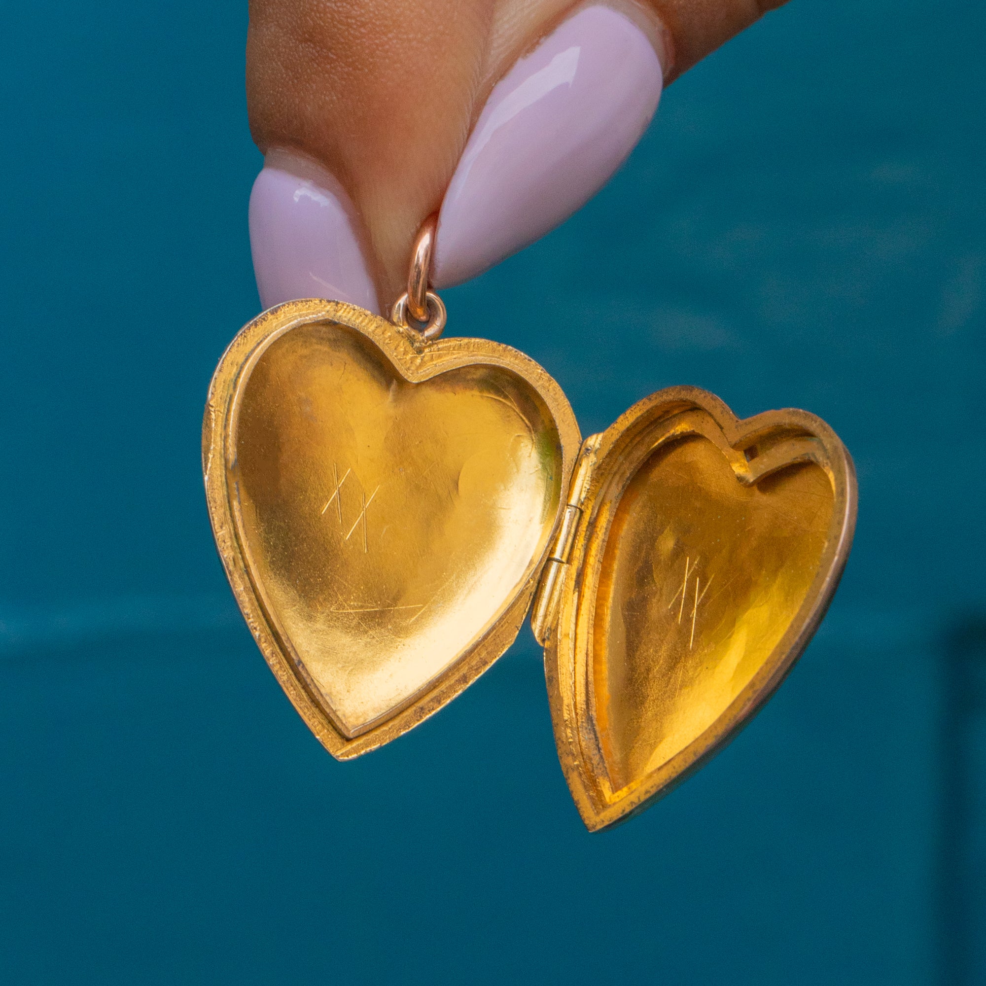 VERY GOOD. This antique 9ct Gold engraved heart locket is in very good condition. The engravings are crisp and her hinge mechanism and lock are in perfect working order, keeping her contents safely inside. There are some subtle scratch marks on the inside, with some darkening to the edge, but this does not detract from the overall beauty of the piece. With one frame perfectly fitting, she has space to hold a cherished photograph inside!