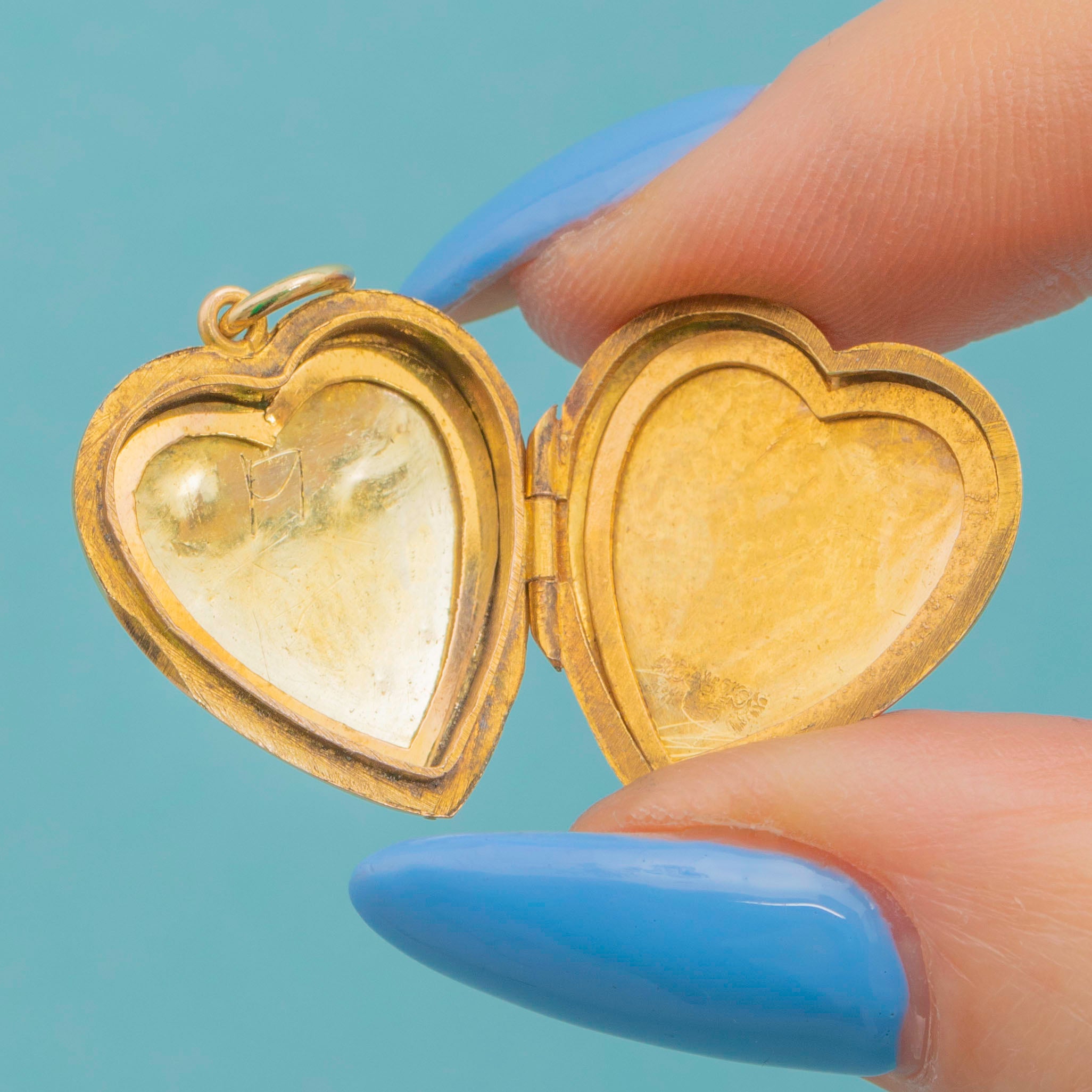 EXCELLENT. This antique 9ct Gold engraved heart locket is in excellent condition, especially when considering its grand age. The Gold is buttery and the engraved details have remained crisp, with only very minor age-related wear. Both original frames are present and the locket closes securely allowing you to enjoy it confidently for years to come!