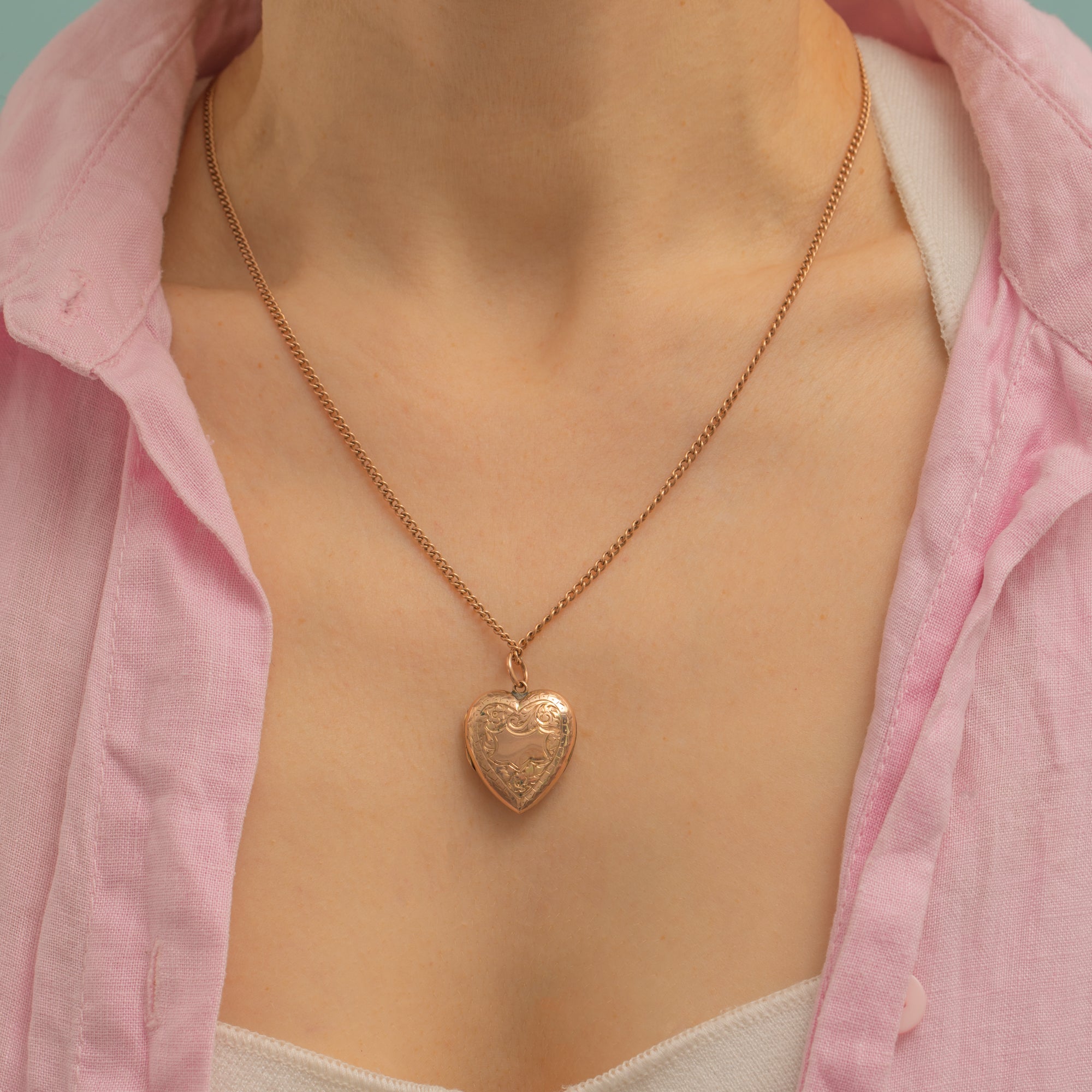 VERY GOOD-EXCELLENT. This antique 9ct Gold engraved heart locket is in wonderful condition. Her engravings are crisp and detailed, and her Gold is lustrous and warm. There are some signs of wear to the Gold commensurate with age, particularly inside the locket, however this does not detract from her beauty. Closing with a nice 'click', this Edwardian locket can be worn with confidence!