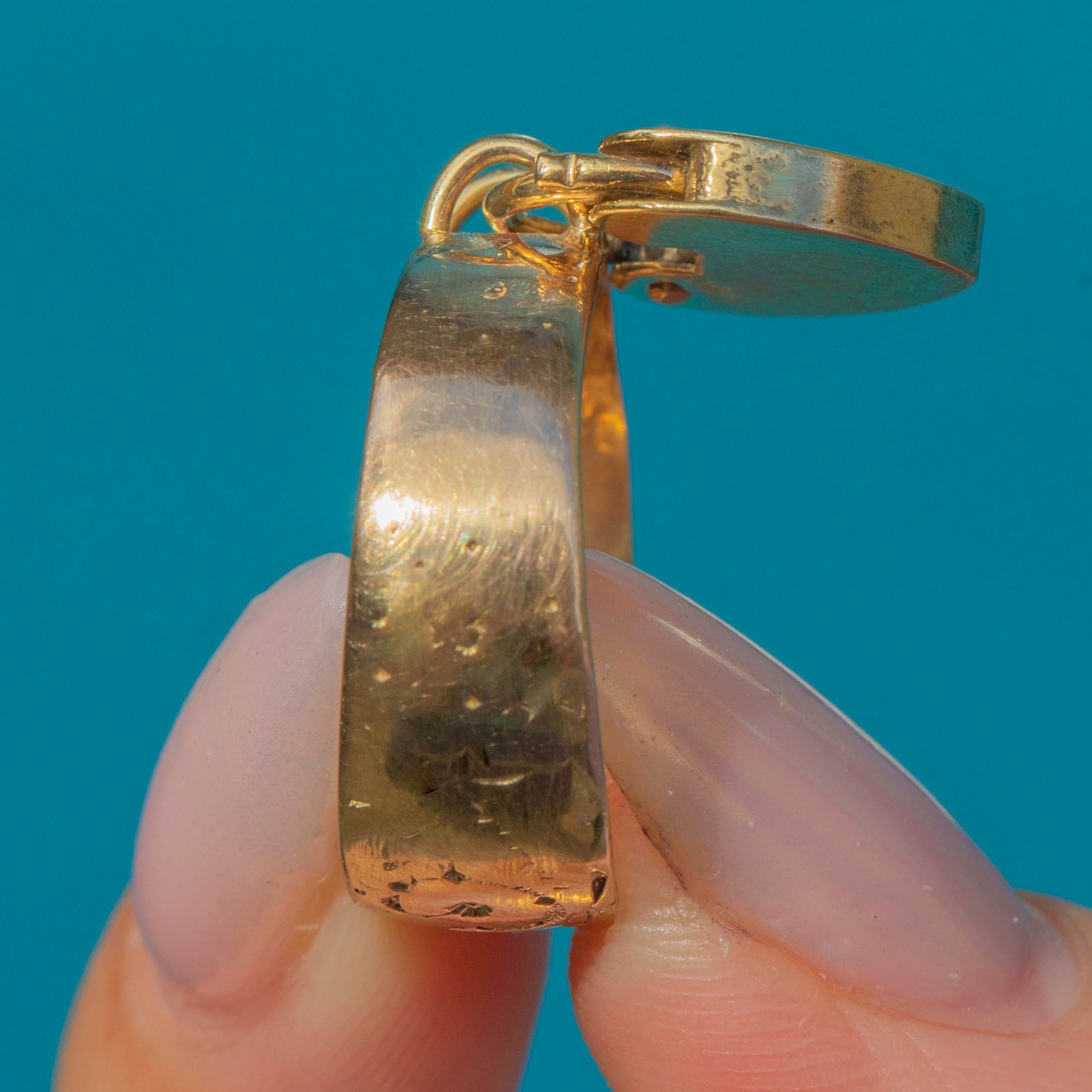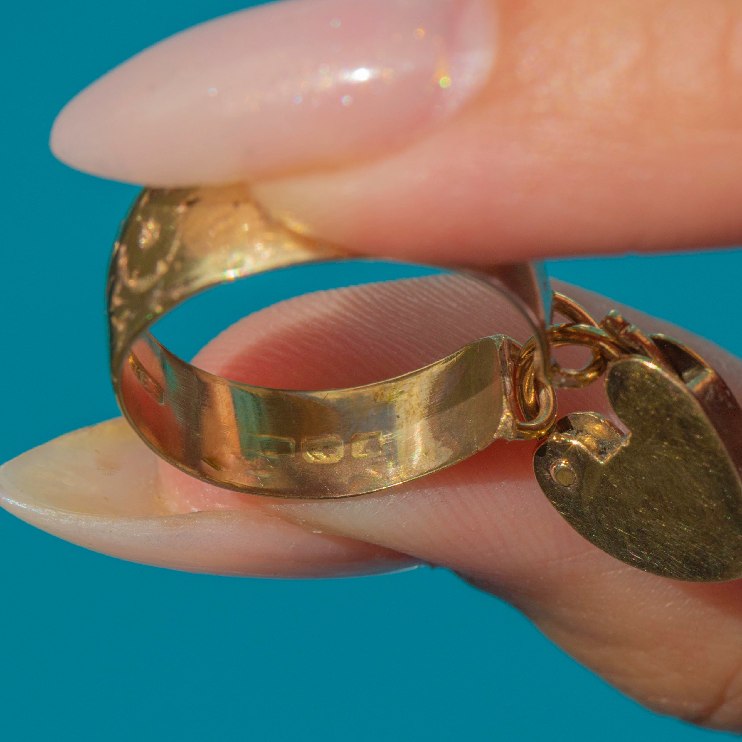 VERY GOOD: The band shows wear consistent with age, with much of the floral engraving worn at the front but more visible at the back. Hallmarks are worn but legible. The later padlock addition works securely and can be detached for use as a charm. No sizing marks present.