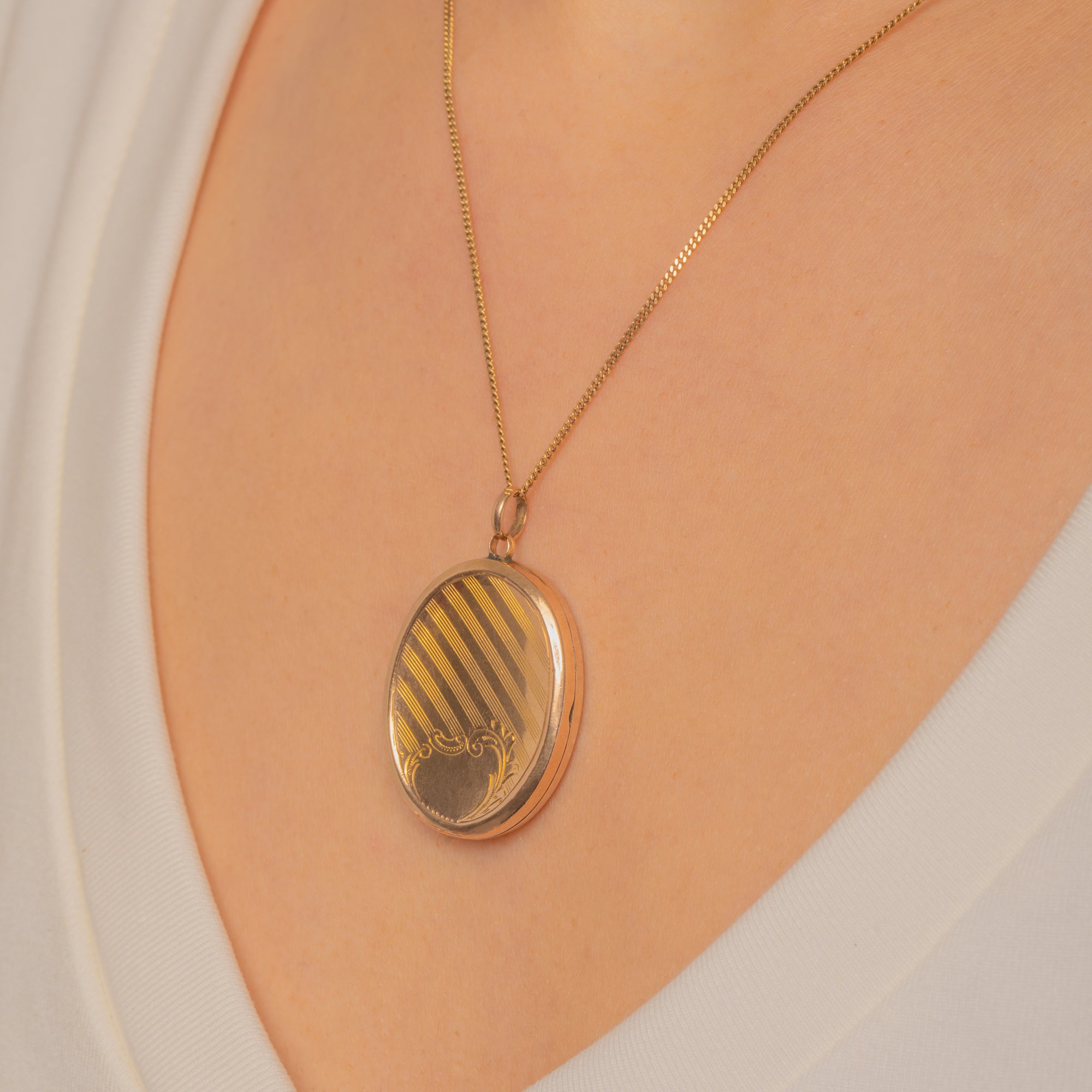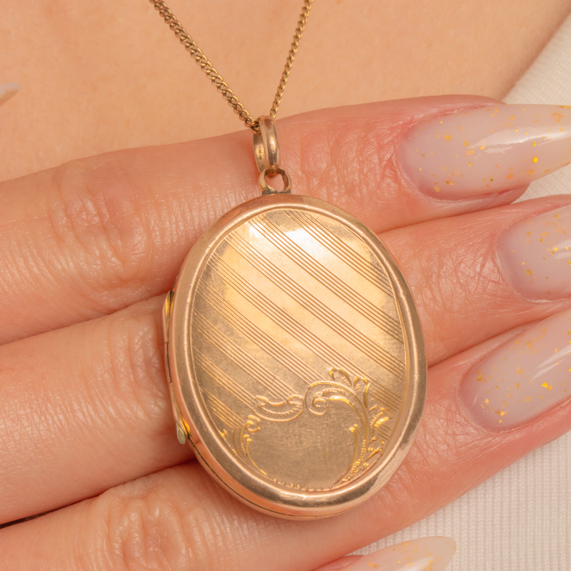 Refined and beautifully wearable, this Edwardian oval locket is crafted in 9ct Gold with a warm yellow-rosy glow. Both faces are adorned with crisp engine-turned diagonal stripes, anchored by a blank scroll cartouche ready for a personal engraving—classic, elegant and forever chic.