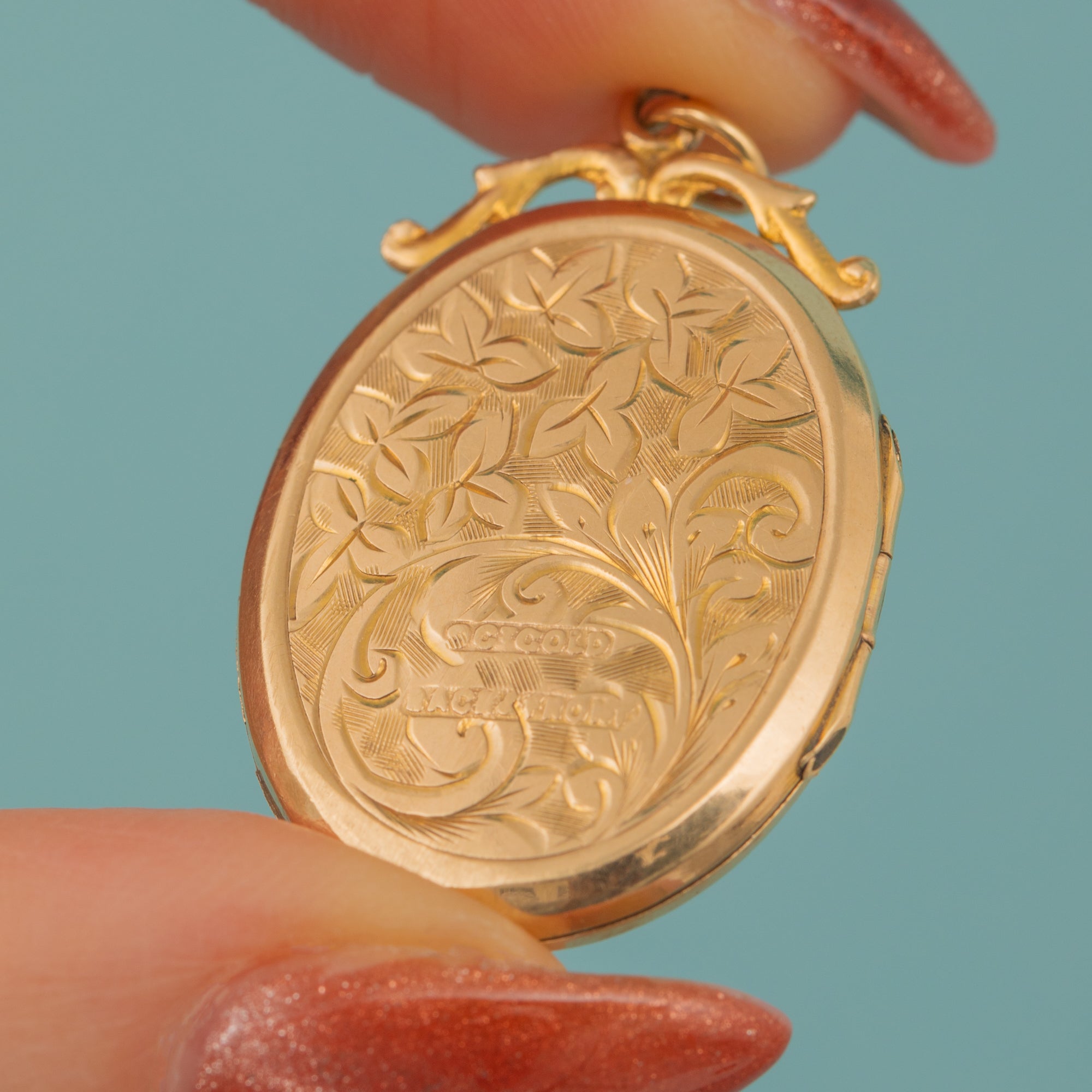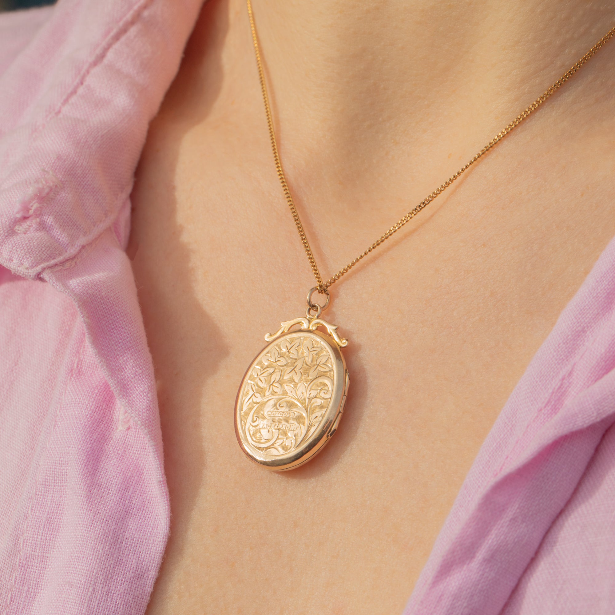 As though plucked straight out of a fairytale, this antique 9ct Gold engraved oval locket is dreamy! Luxurious 9ct Gold has been beautifully crafted to form this stunning locket, with floral acanthus leaf engravings spanning across both sides.