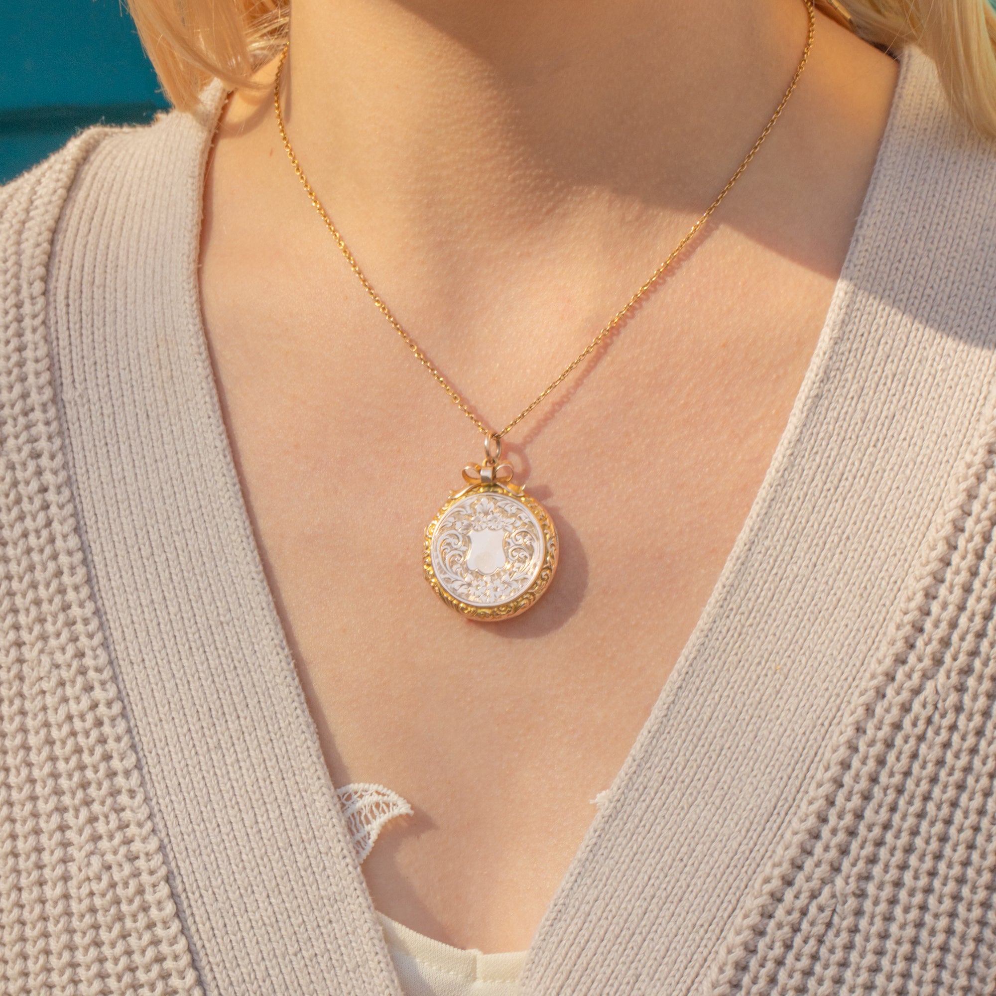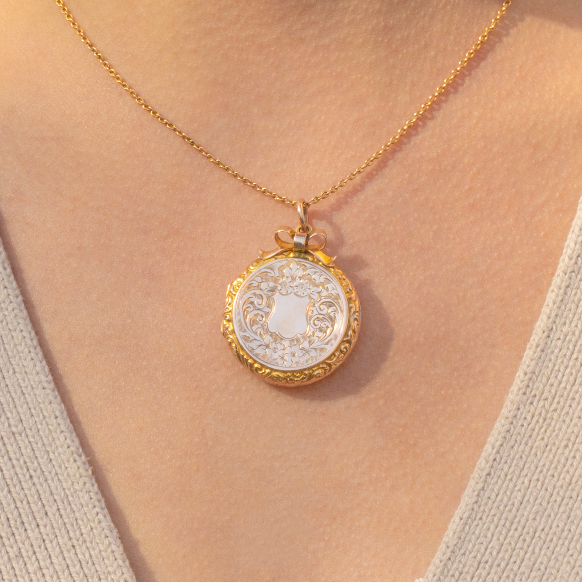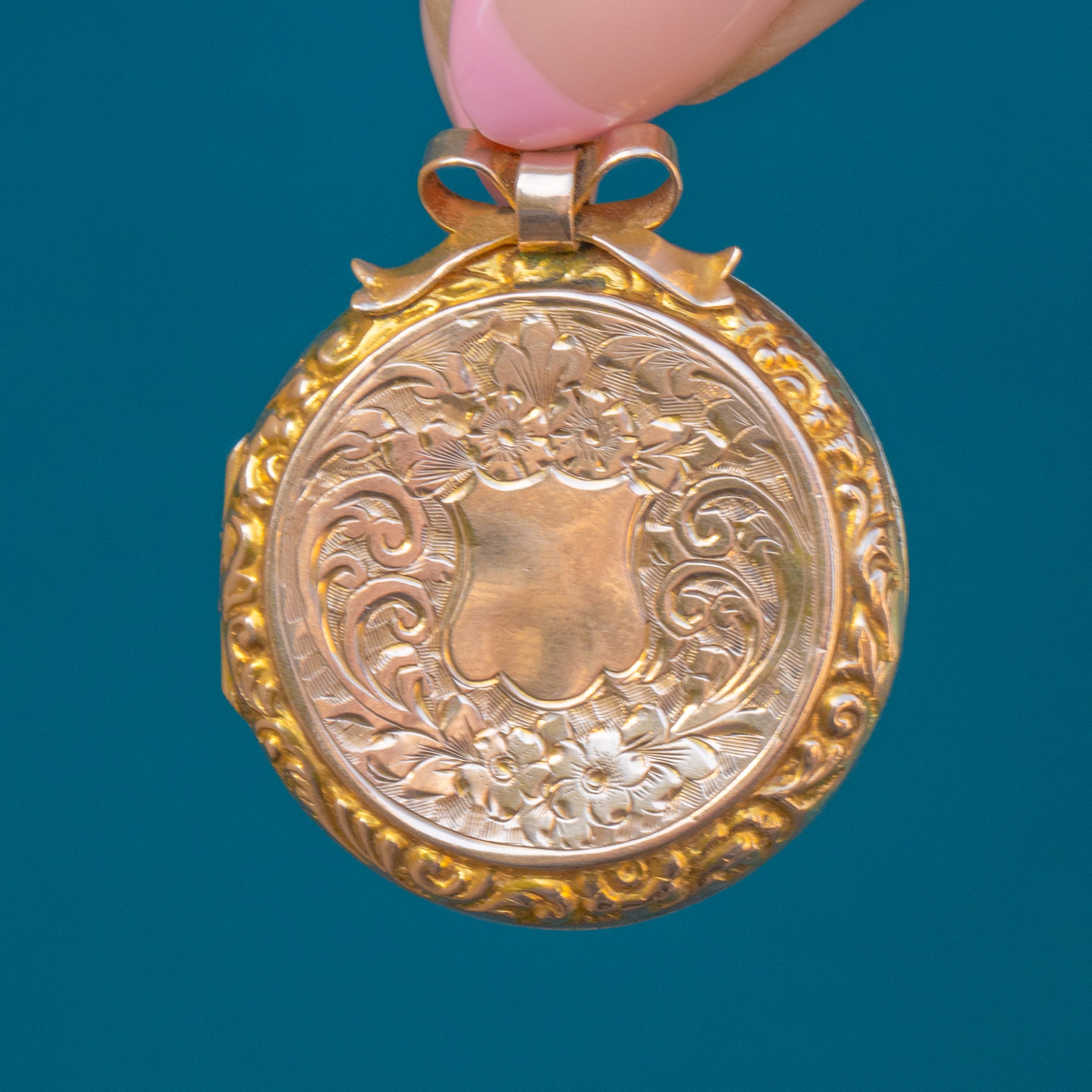 Antique 9ct Gold Engraved Round Locket, Ribbon Top