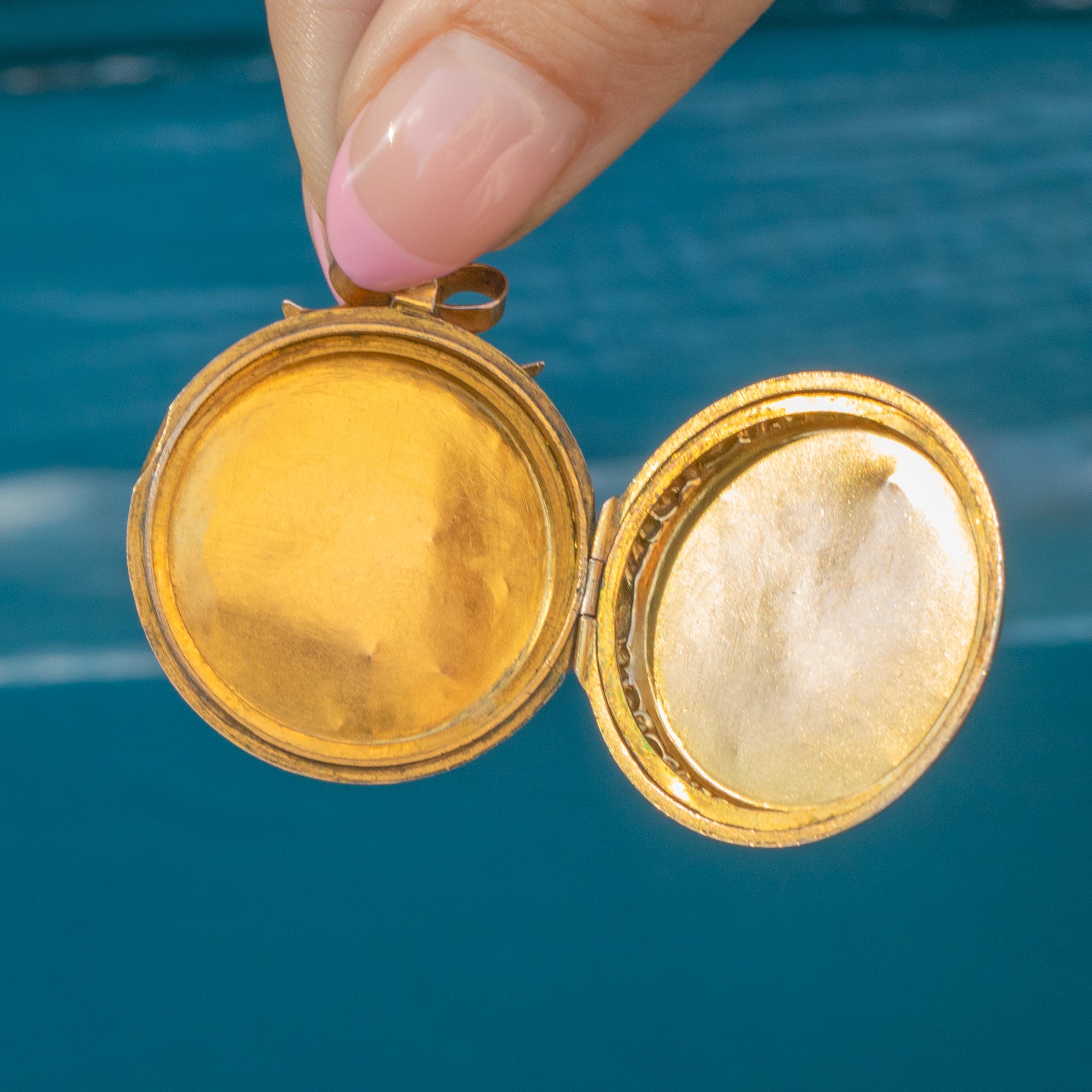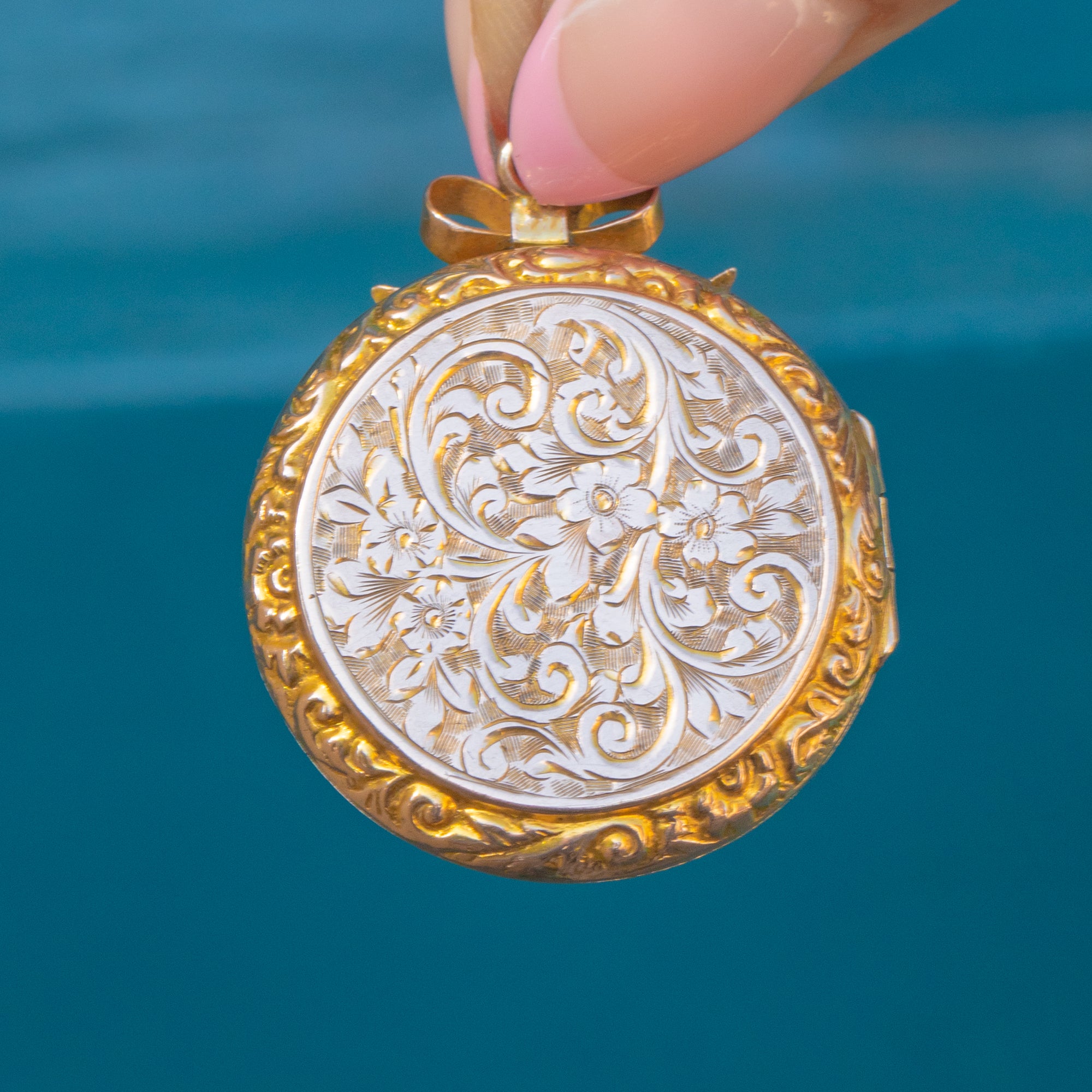 Open this antique Gold locket and you will discover space to home two of your most cherished photographs, allowing you to keep your loved ones close to your heart at all times!