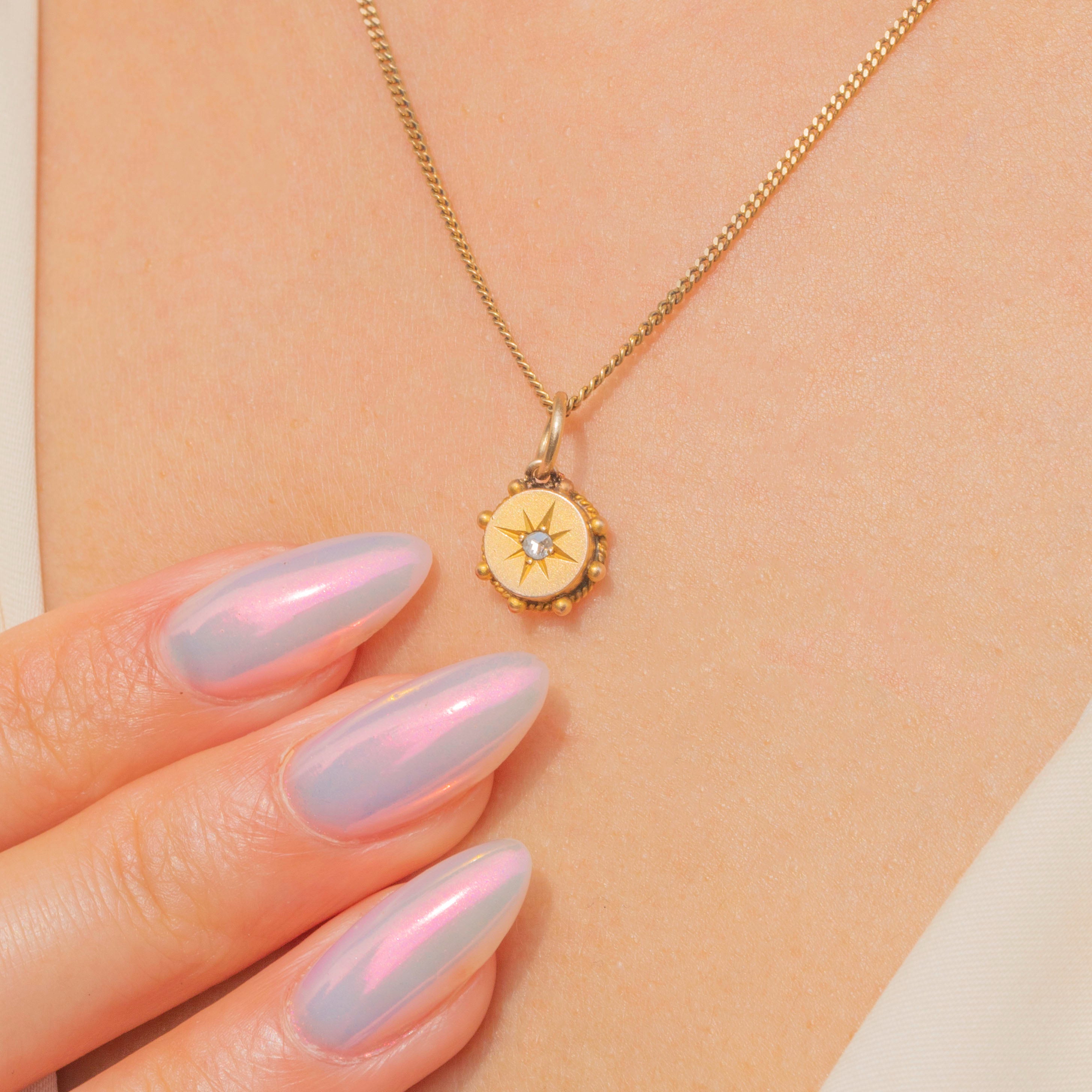 Crafted entirely from buttery 9ct Gold, this antique Etruscan revival charm is centred by a scintillating rose-cut Diamond, hugged by starry settings which provide a charming ethereality. With textured rope and beaded details, which are quintessential to Etruscan jewellery, and though petite, she boasts ample antique character!
