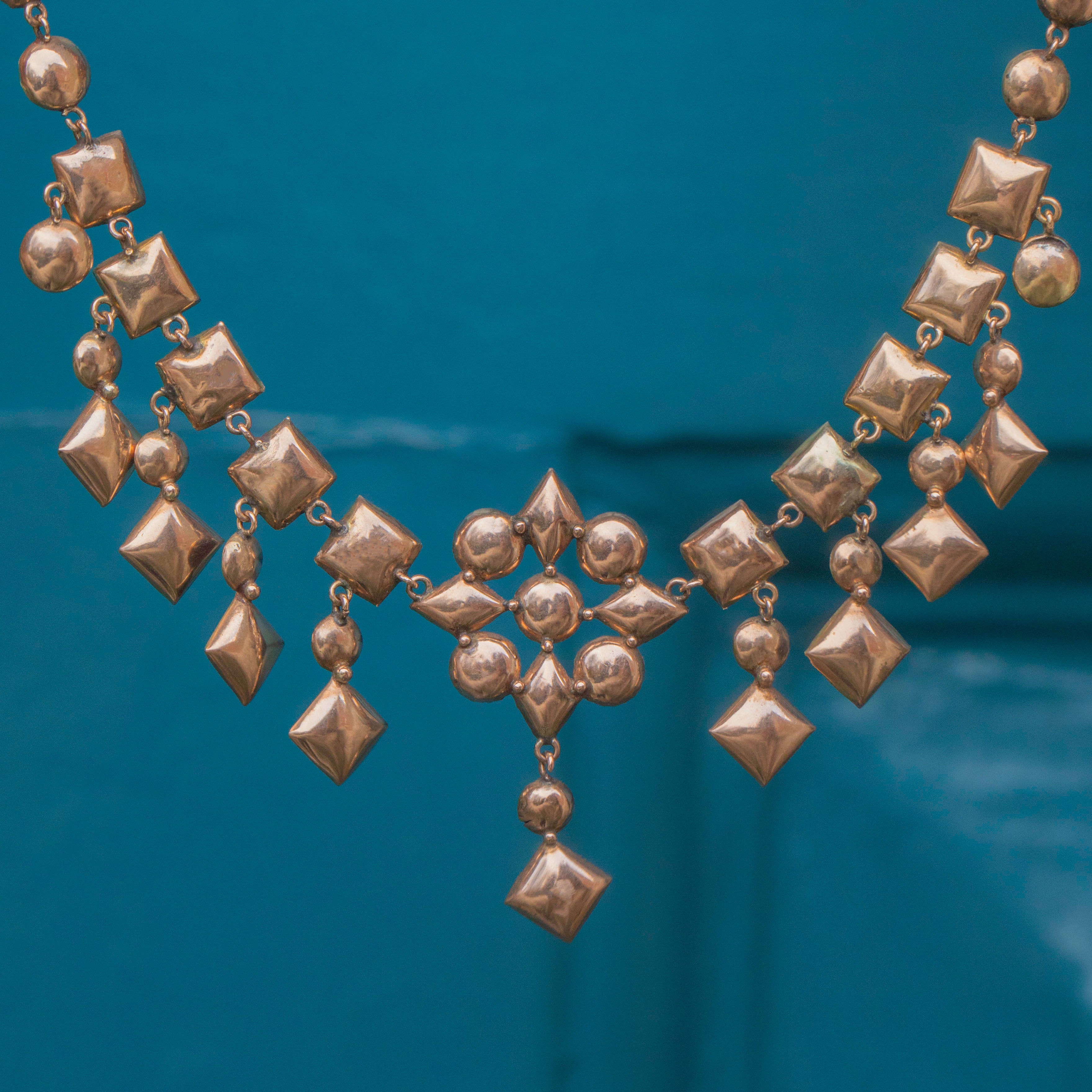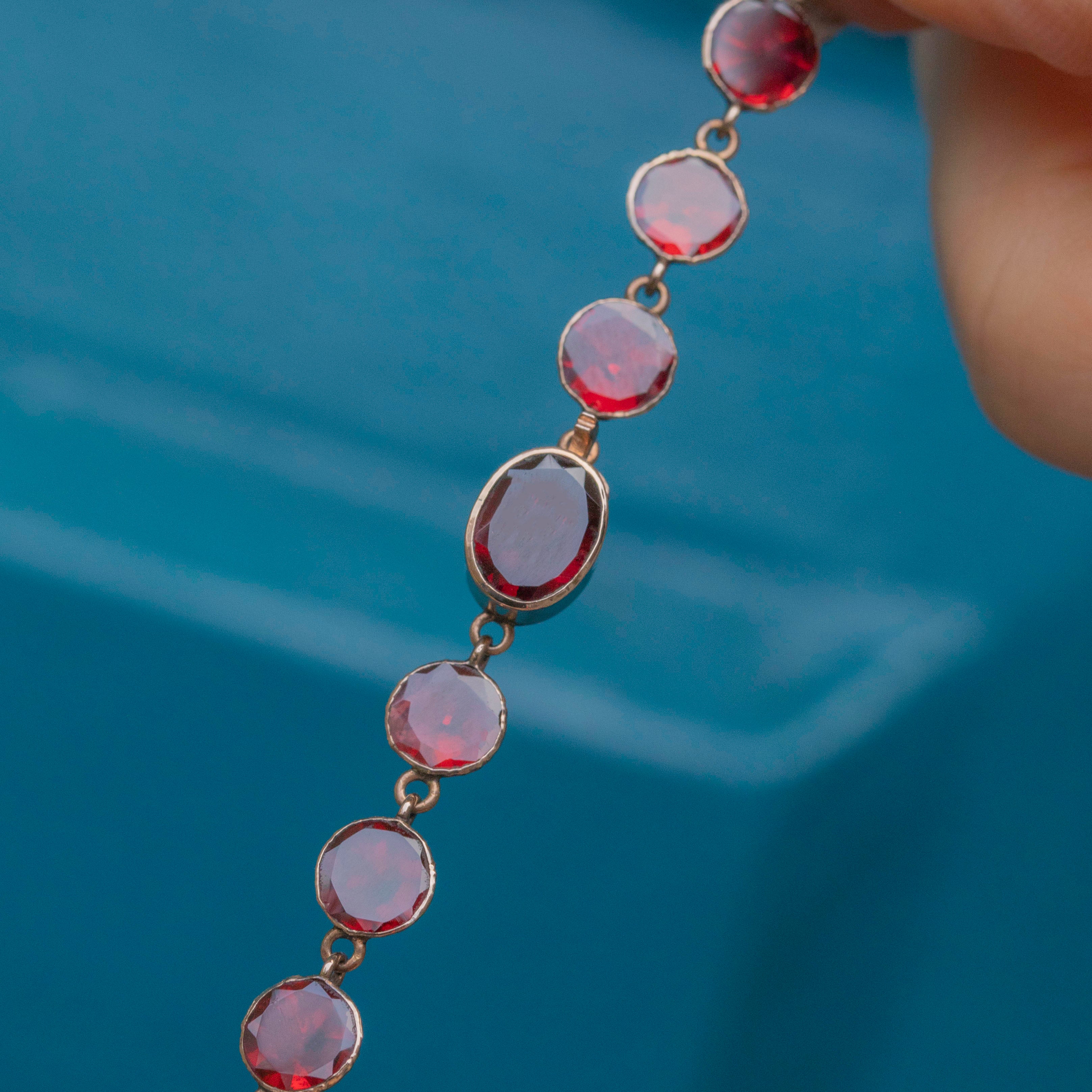 This antique 9ct Gold flat-cut Garnet fringe necklace is a berry red dream! Made during the Edwardian era, this Gold necklace has been crafted from rosy 9ct Gold and displays a splendid selection of flat-cut Garnets.
