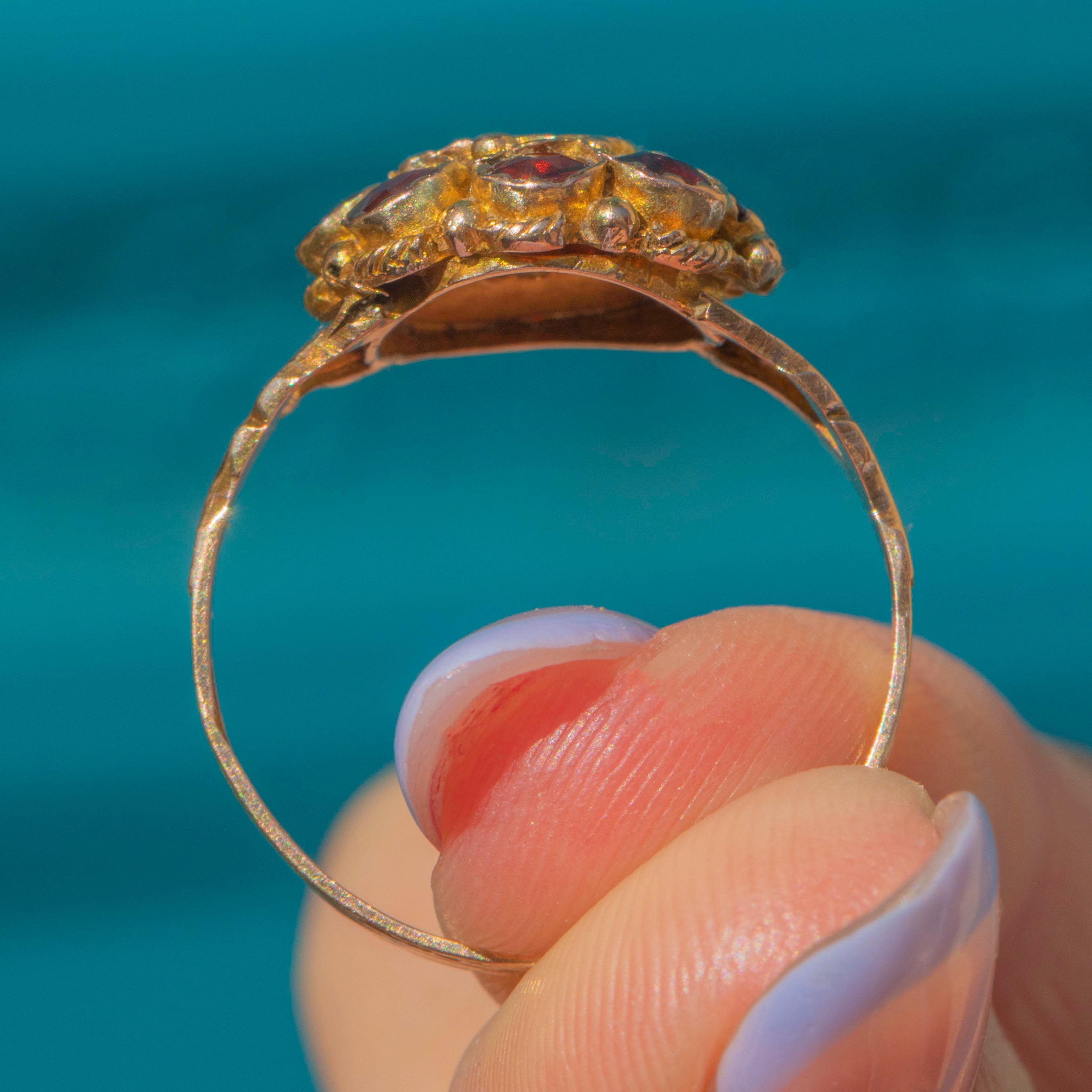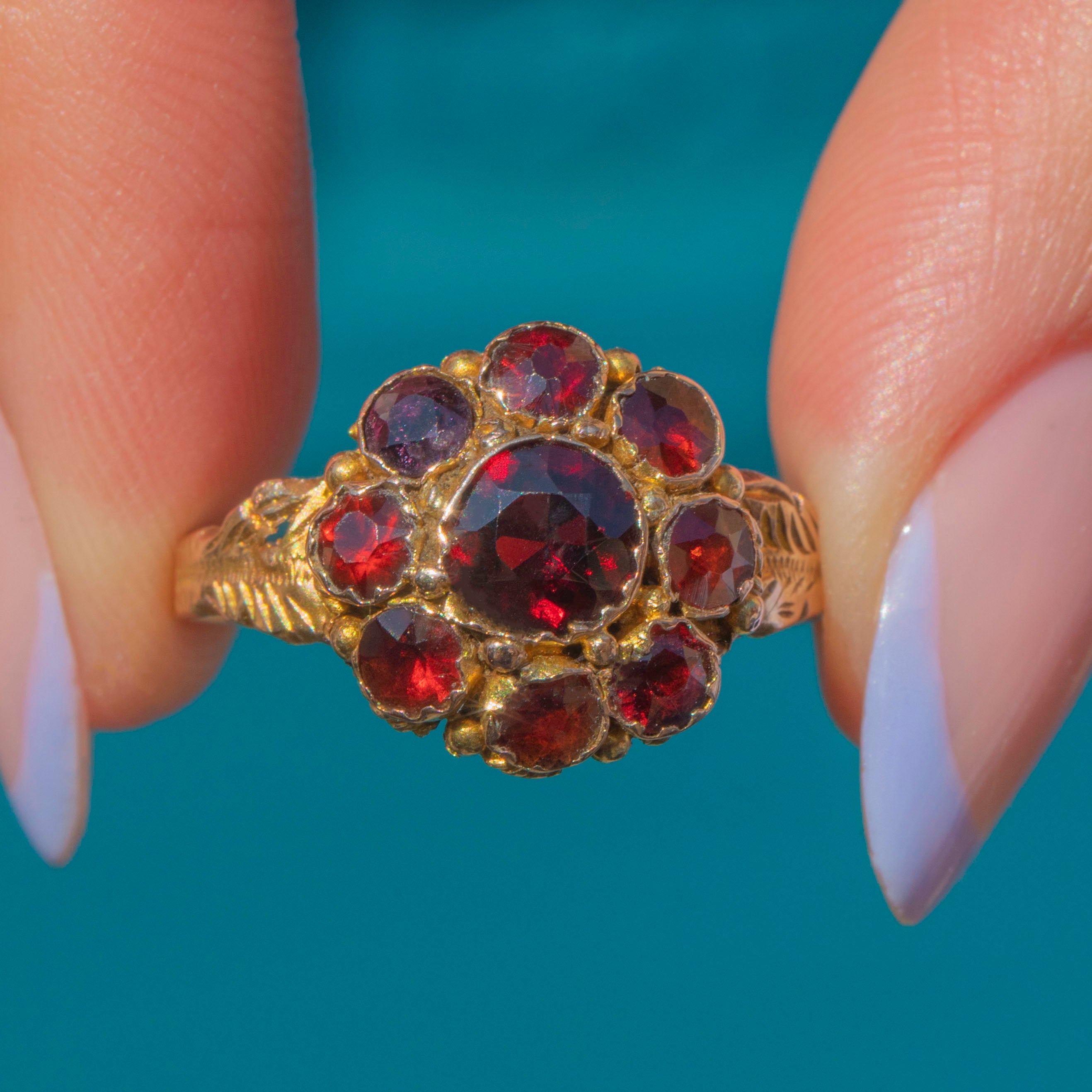 A unique antique 9ct Gold Garnet flower cluster ring for your collection. This piece has been set with a gorgeous selection of round Garnet gemstones, each one juicy and plump!
