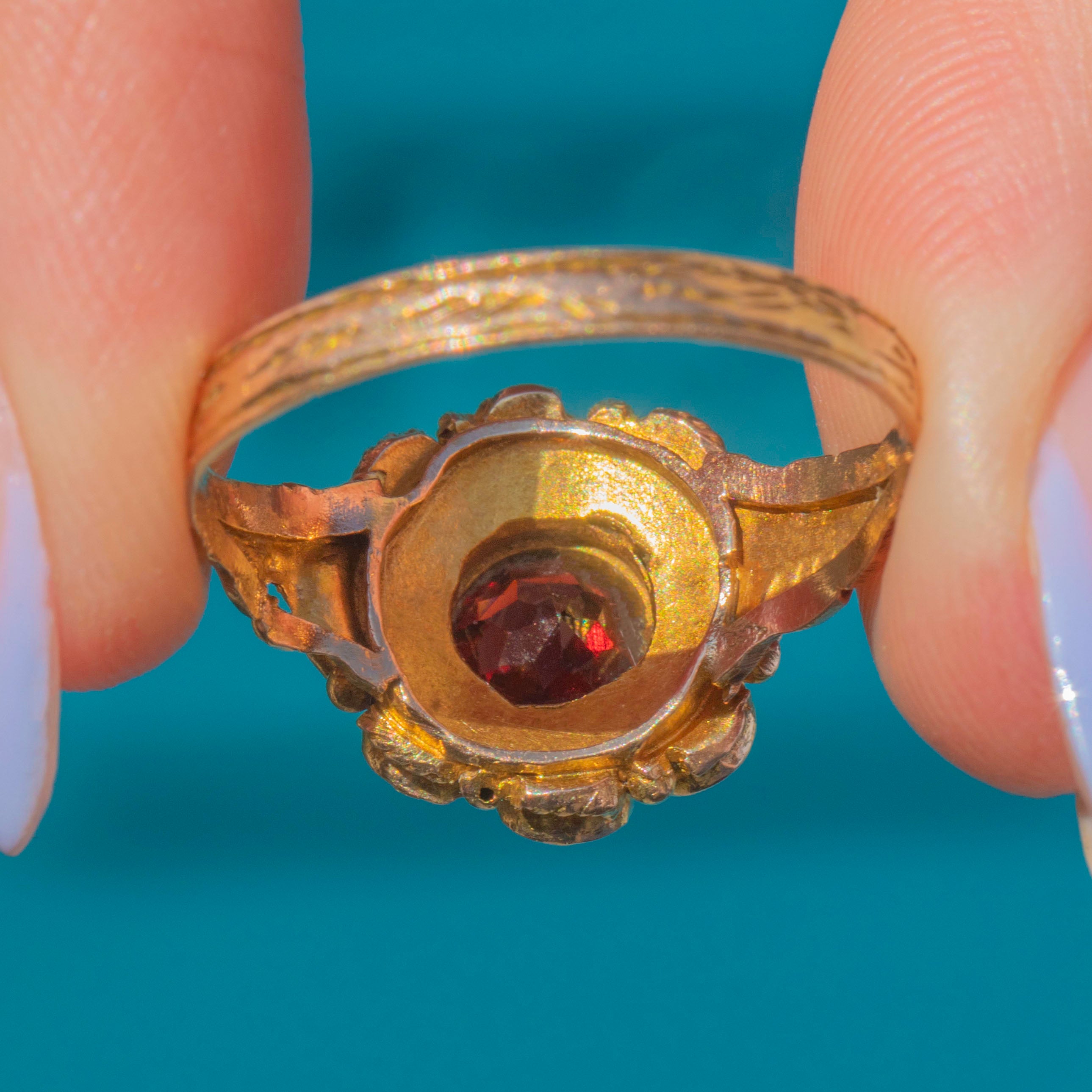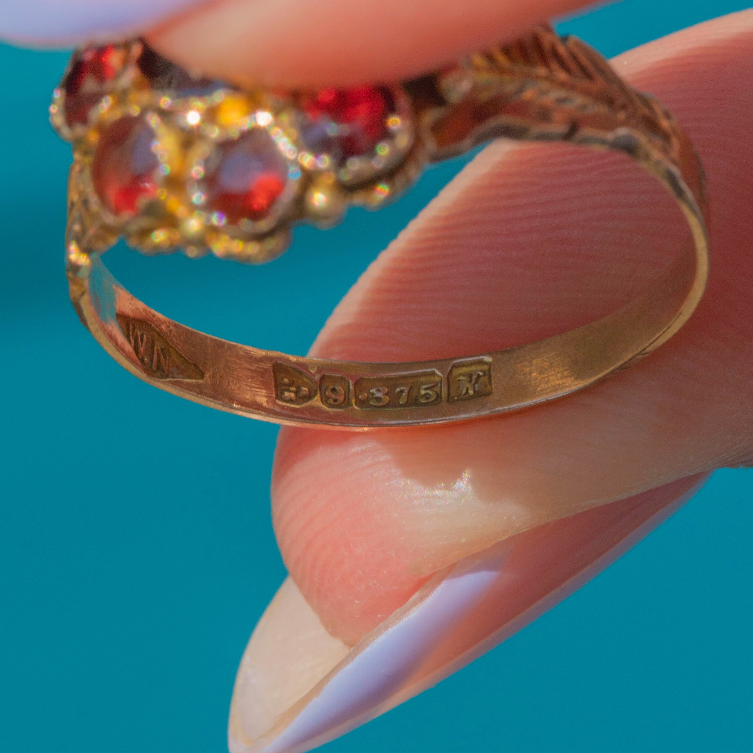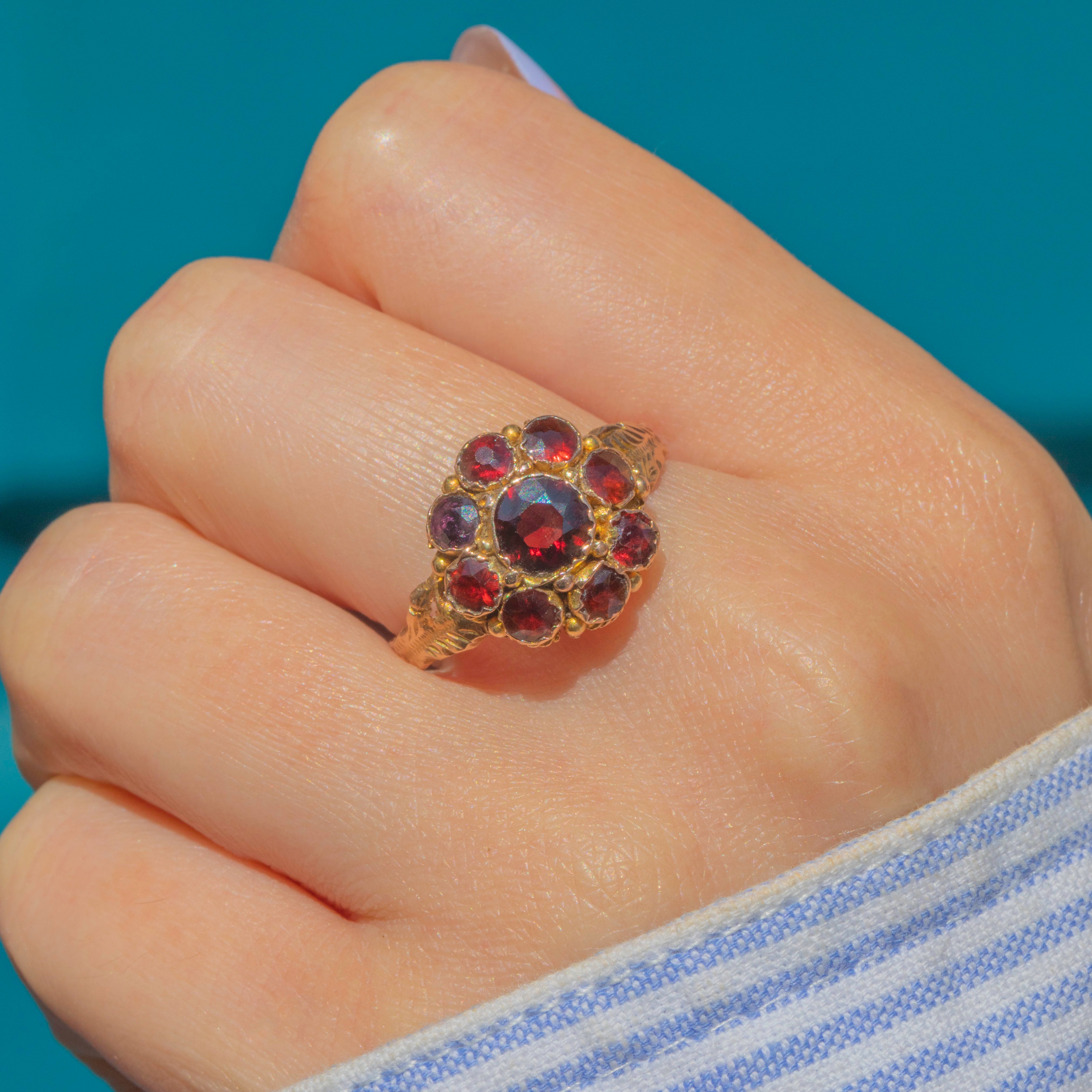 EXCELLENT: This antique 9ct Gold Garnet flower cluster ring is in excellent condition. The ring has plump and juicy gemstones neatly set and free from wear. The ring band is lovely and the piece wears like an absolute dream!